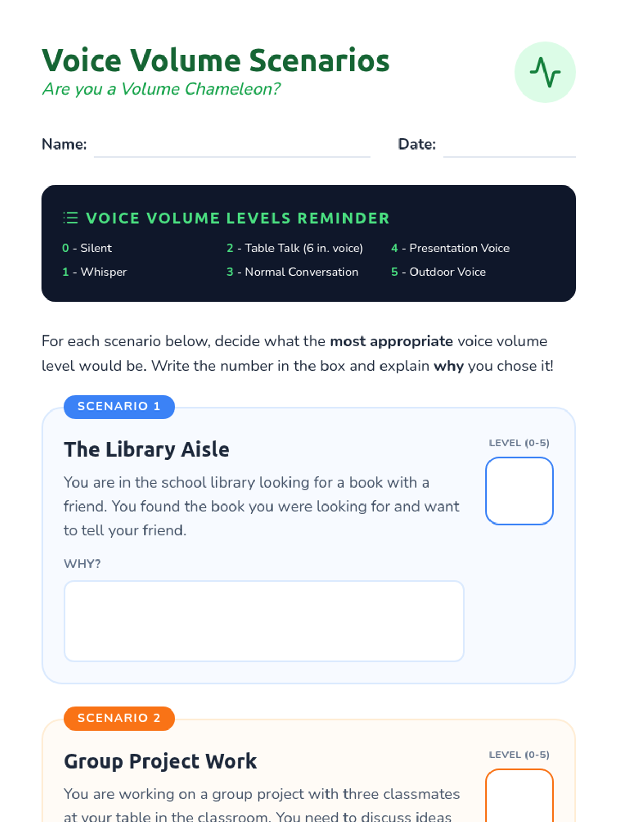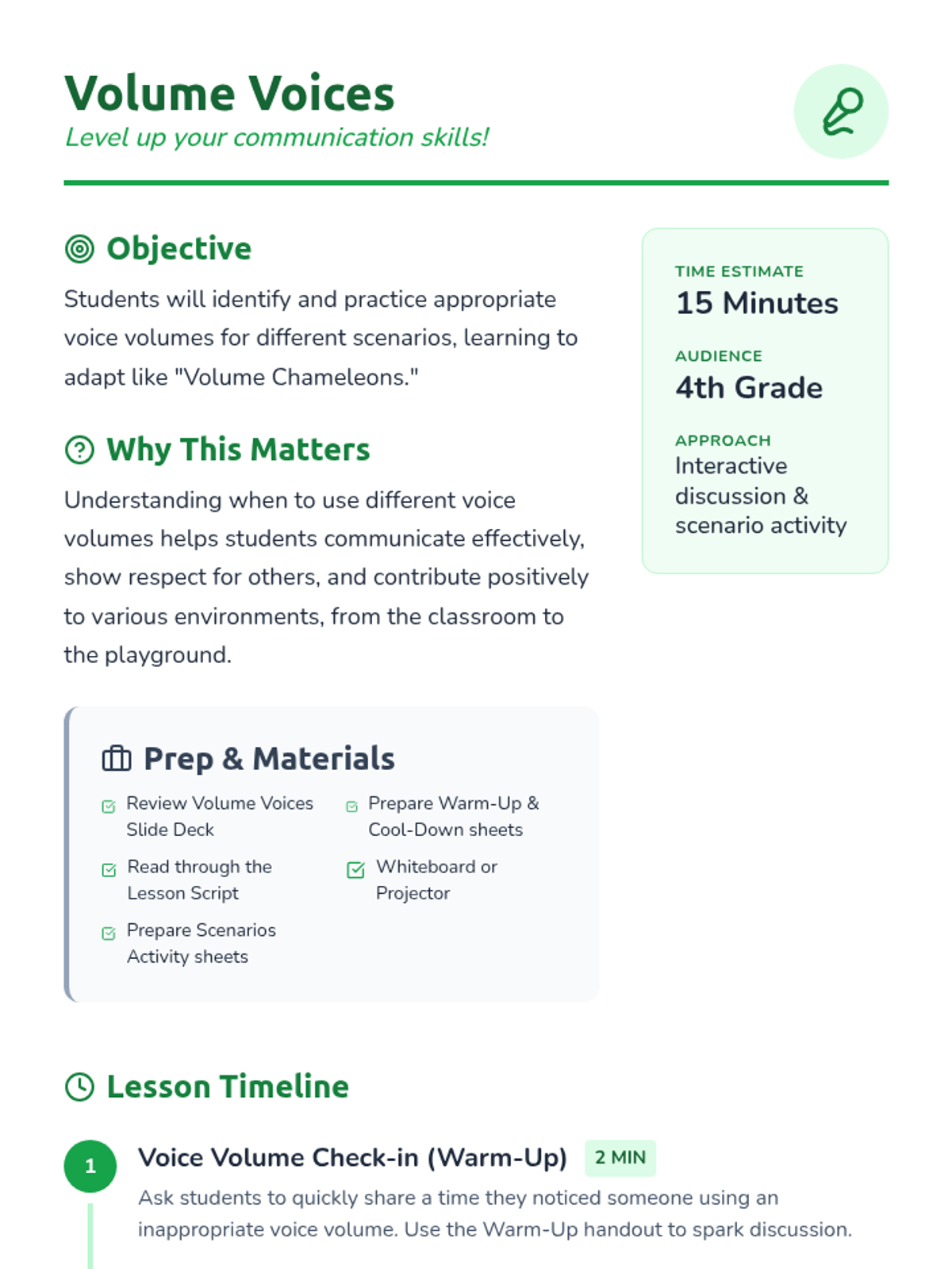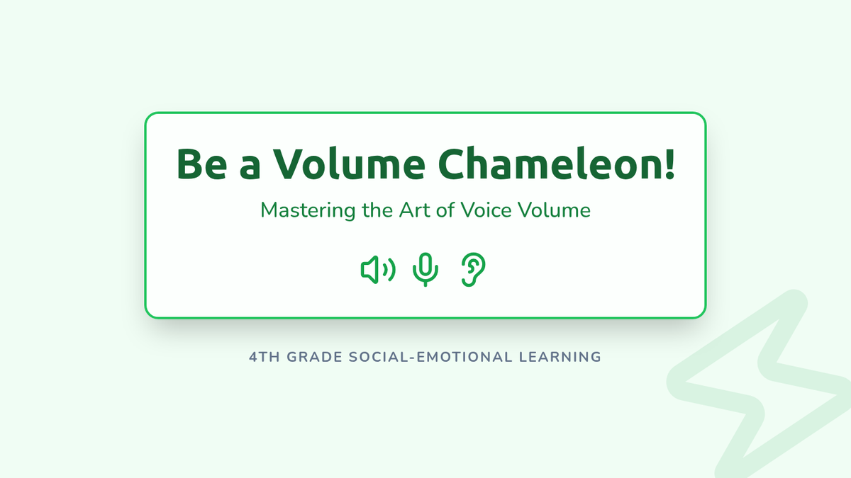 A 15-minute lesson for 4th-grade students on identifying and practicing appropriate voice volumes across various social contexts. Students learn to become 'Volume Chameleons' by adapting their sound levels to their environment.