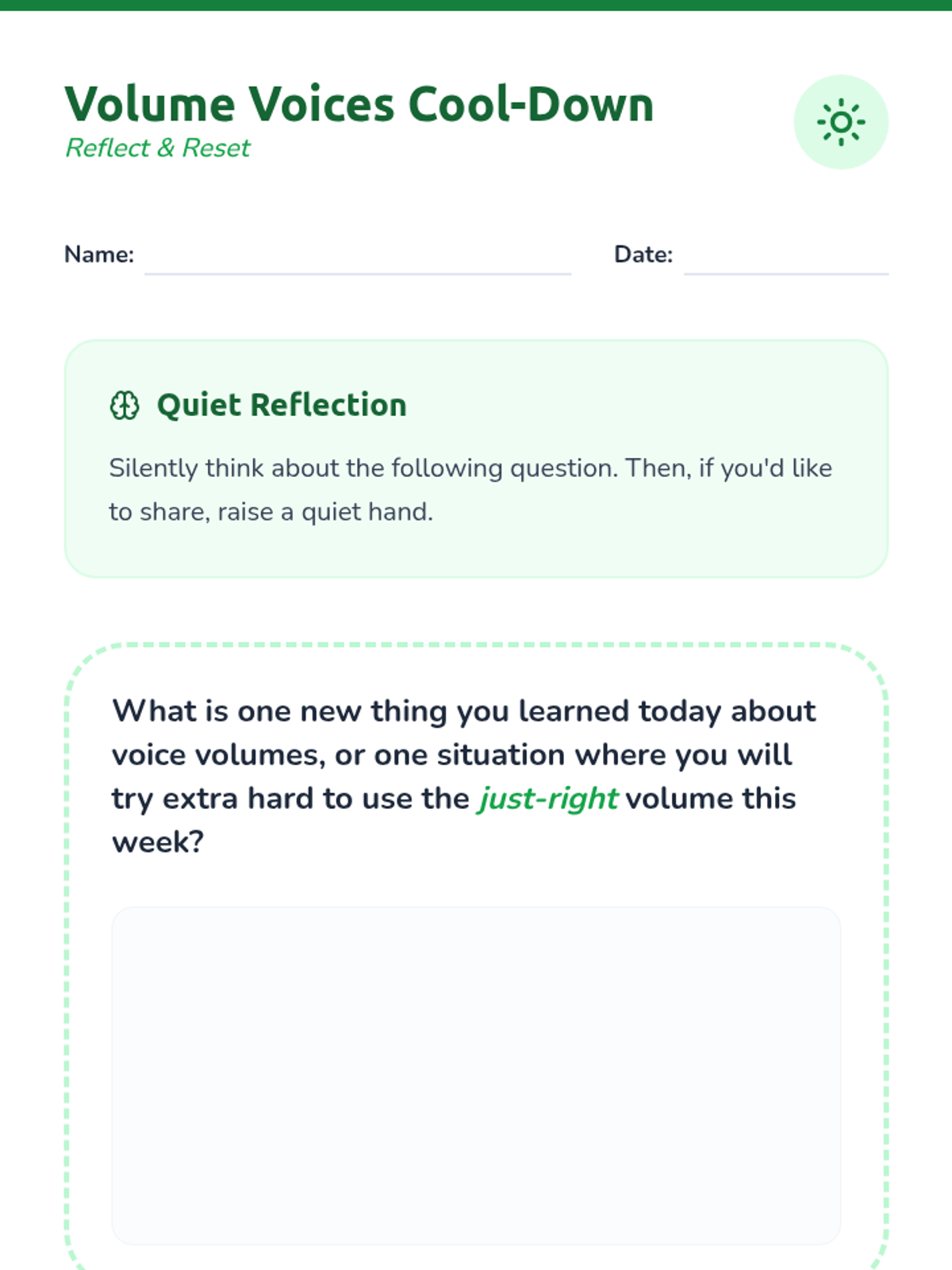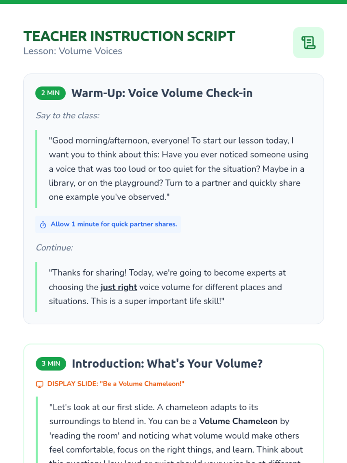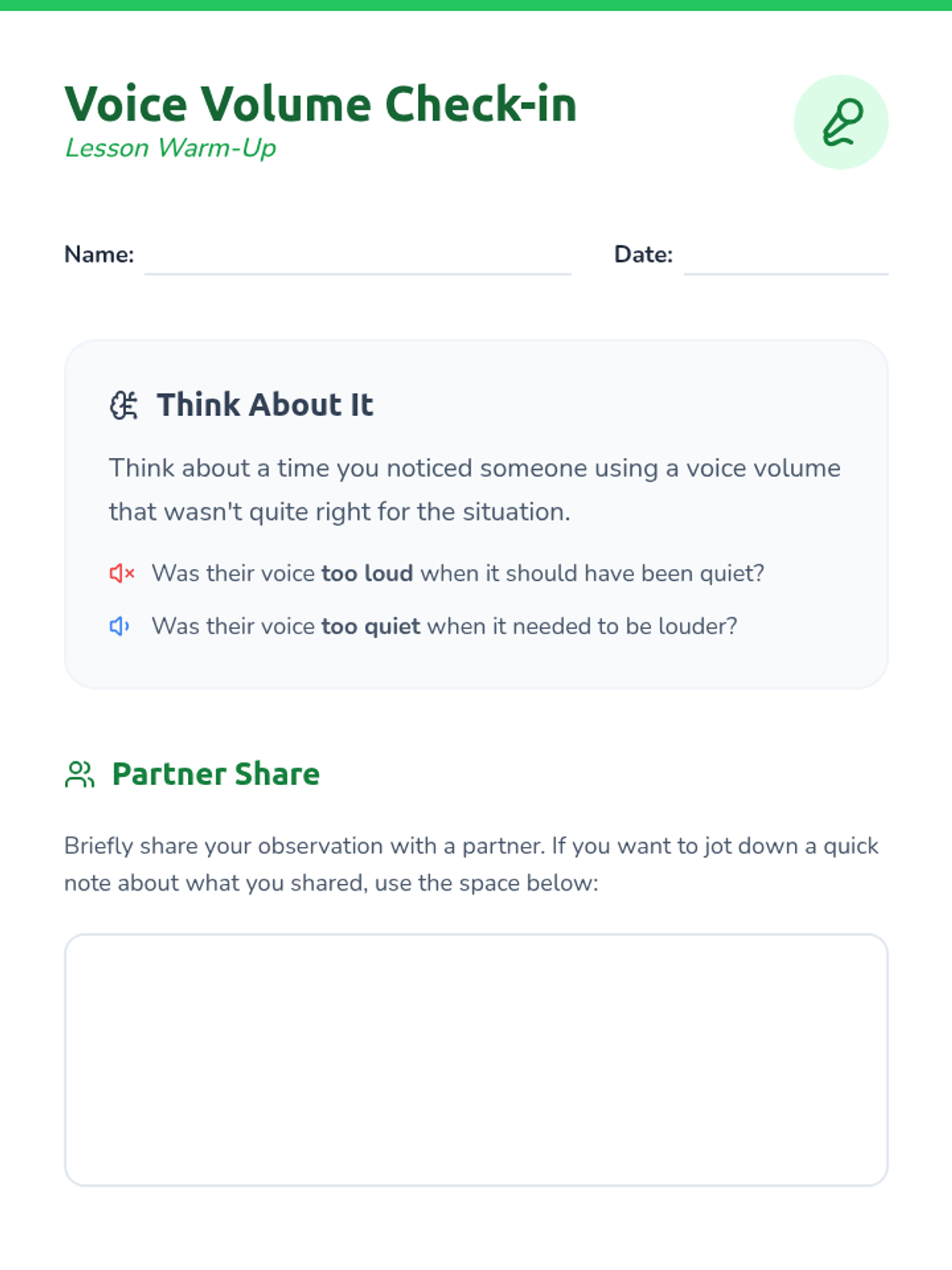 A 15-minute lesson for 4th-grade students on identifying and practicing appropriate voice volumes across various social contexts. Students learn to become 'Volume Chameleons' by adapting their sound levels to their environment.