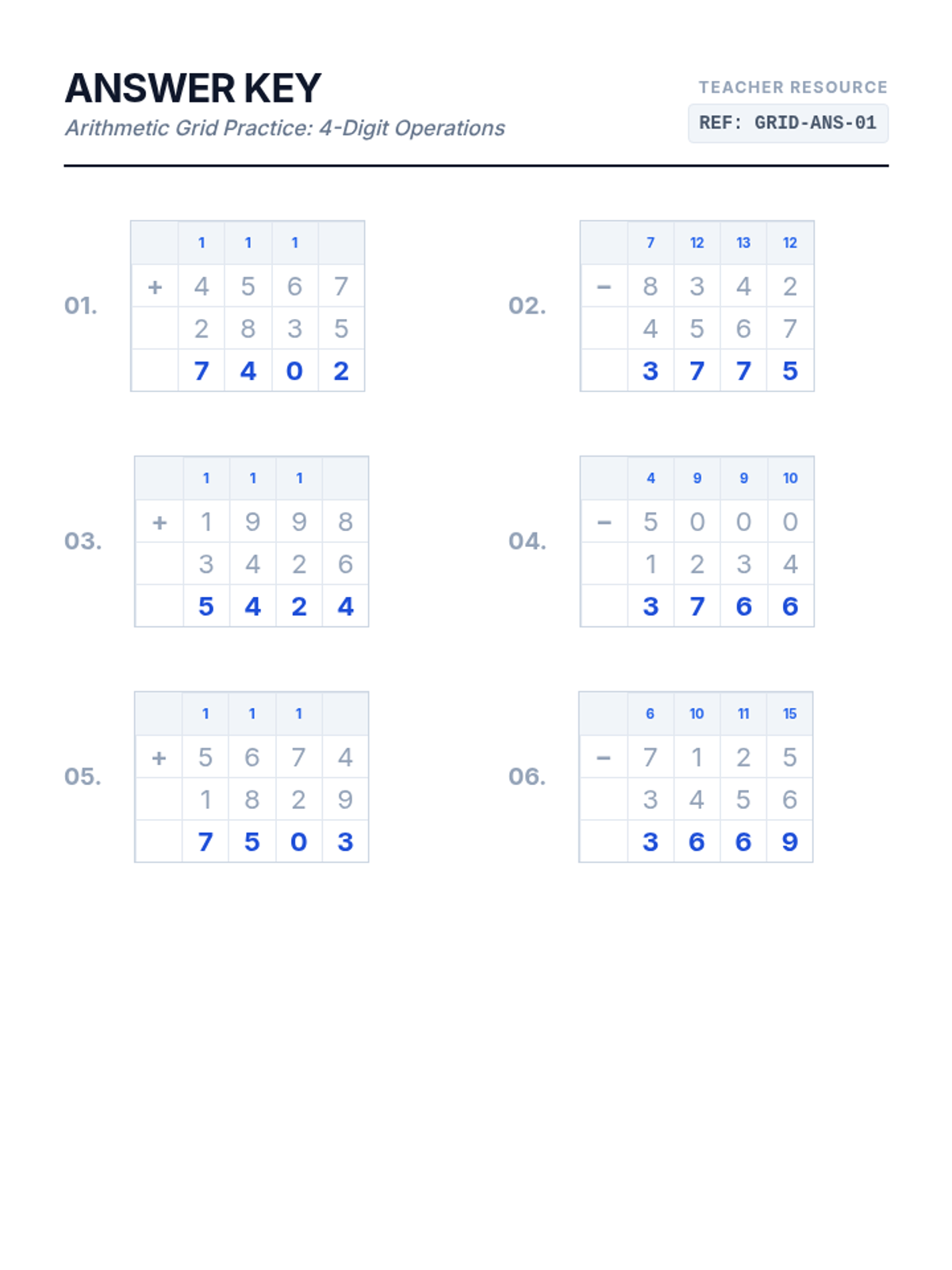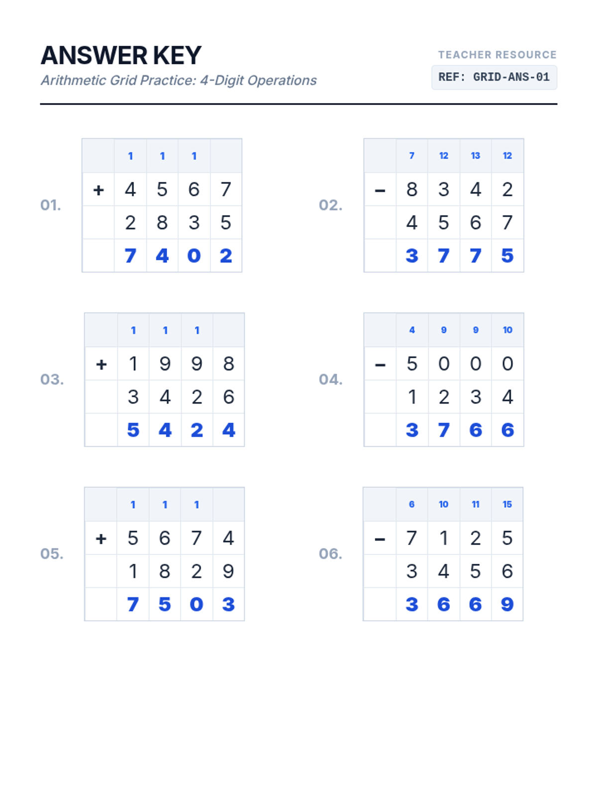 A specialized practice lesson on 4-digit addition and subtraction where every problem requires regrouping or carrying, presented on a clear grid layout for alignment.