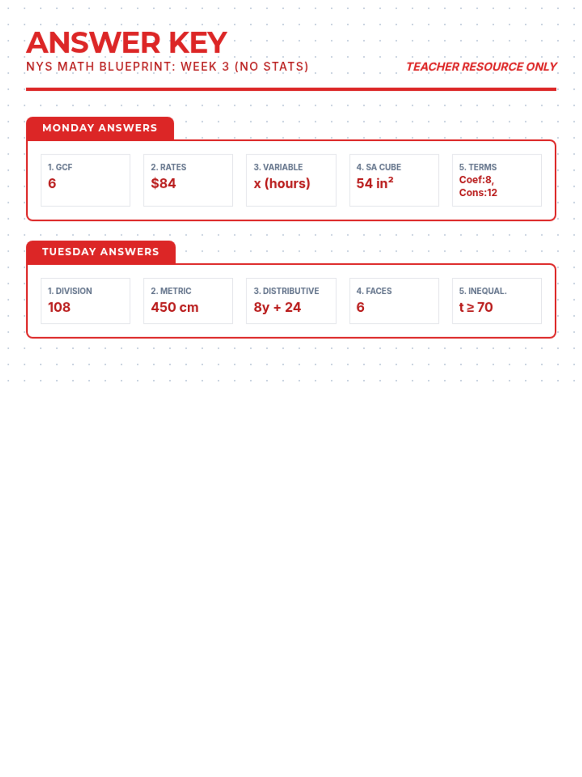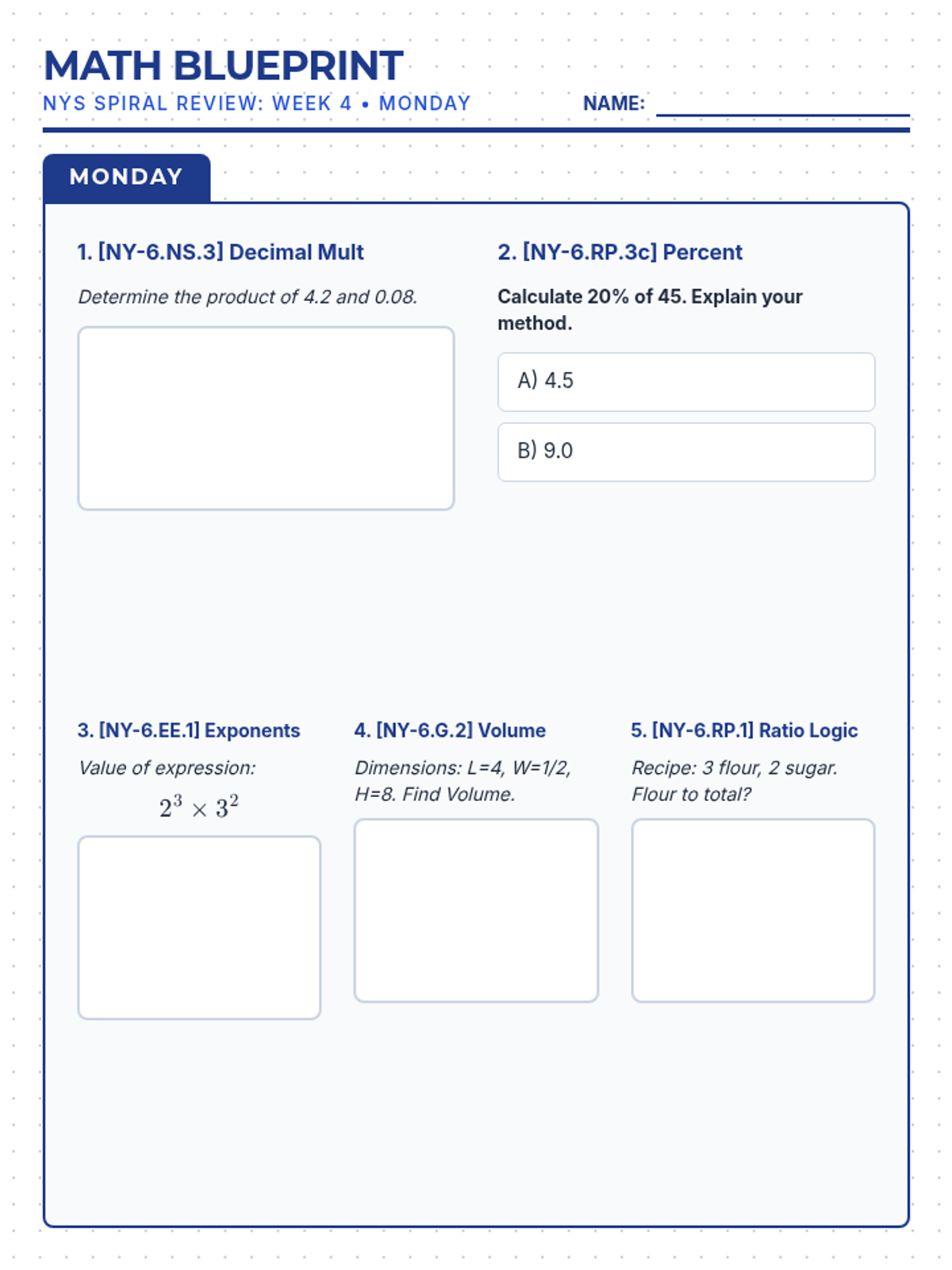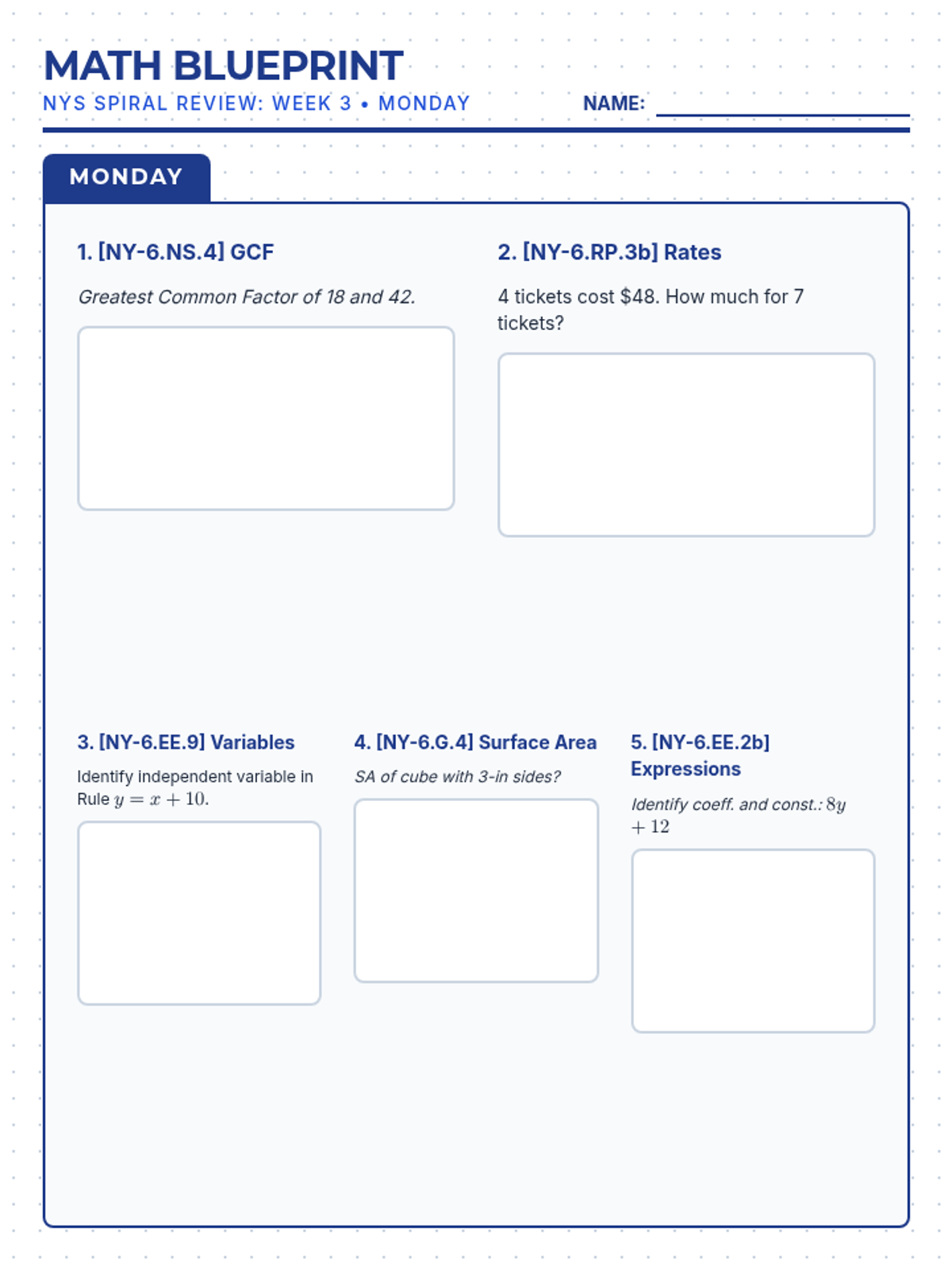 Focusing on surface area (NY-6.G.4), GCF/LCM (NY-6.NS.4), and independent/dependent variables (NY-6.EE.9).