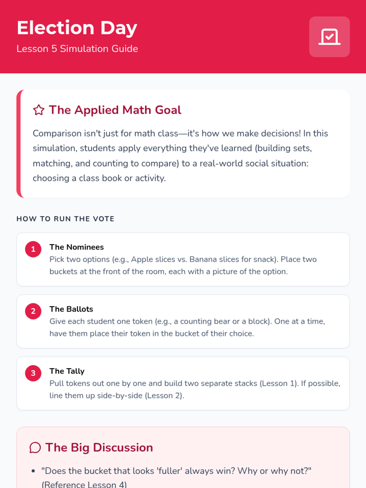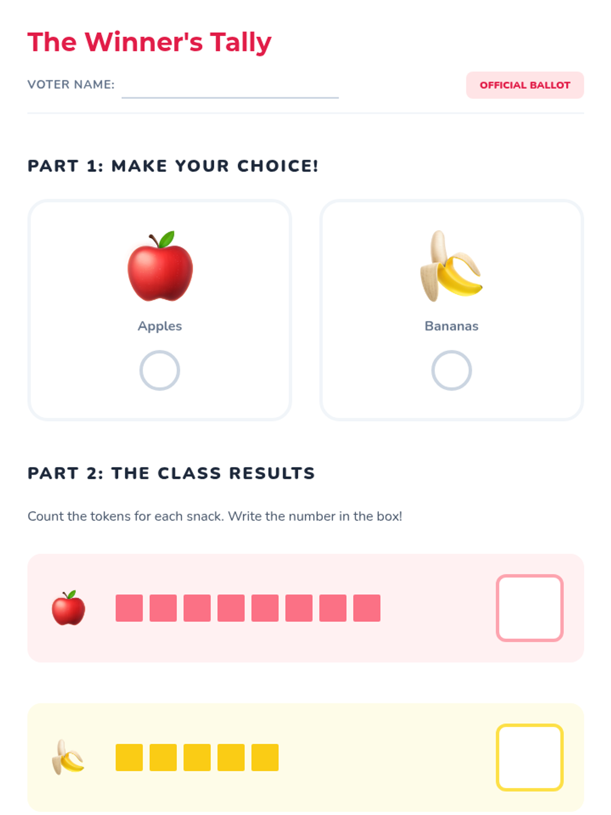 Students apply their comparison skills to a classroom voting simulation, counting tokens to determine a winner.