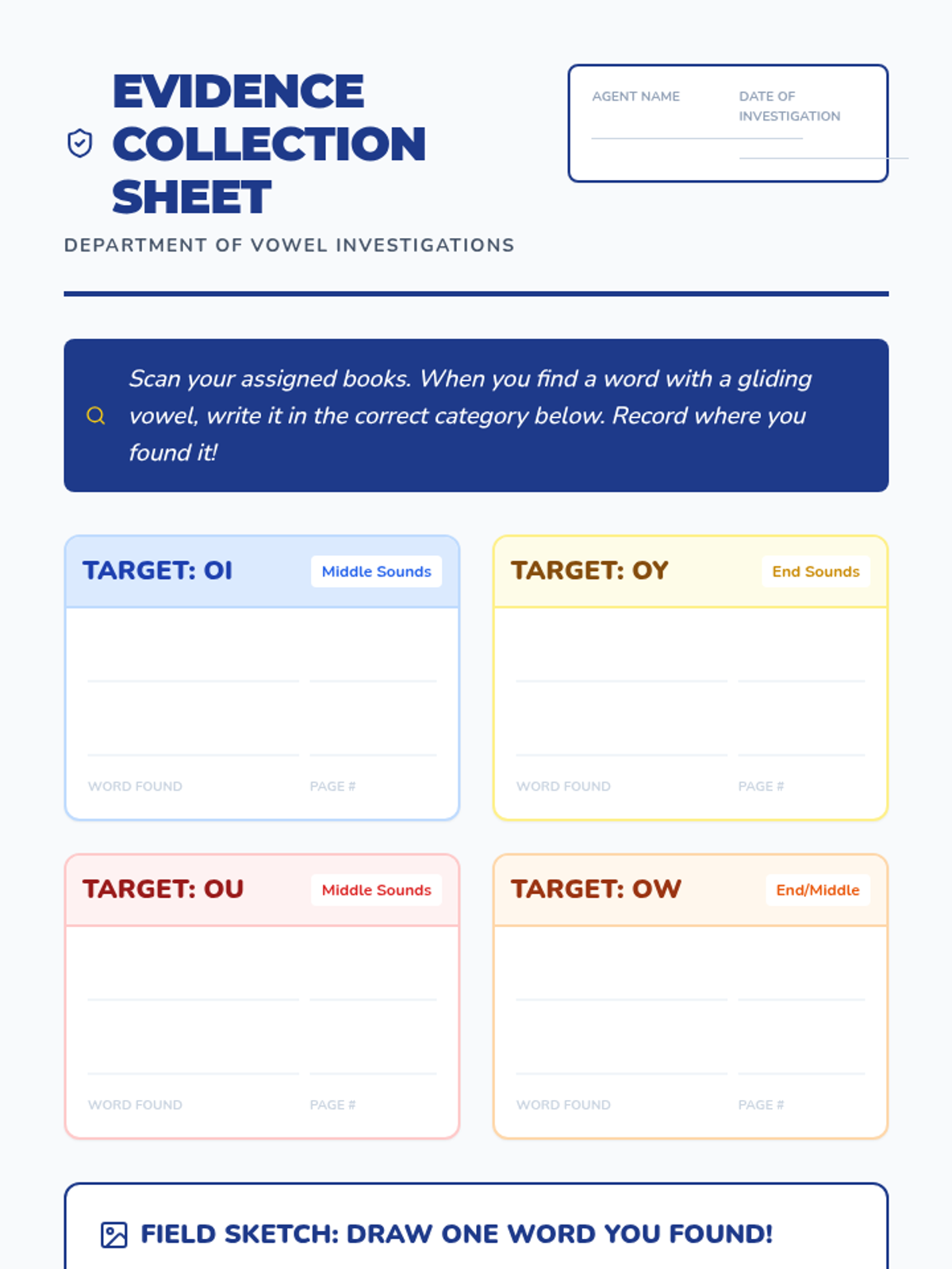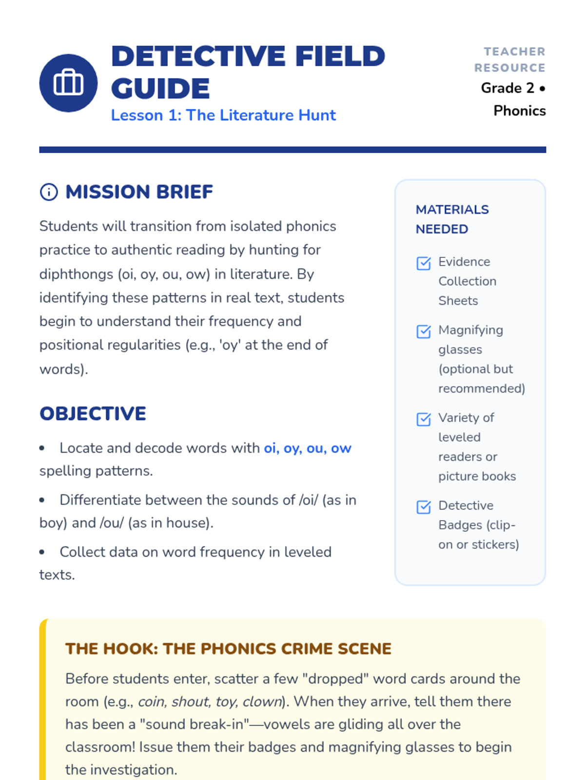 Students act as phonics detectives, hunting for words with oi, oy, ou, and ow in leveled readers and picture books to see how these sounds appear in real literature.