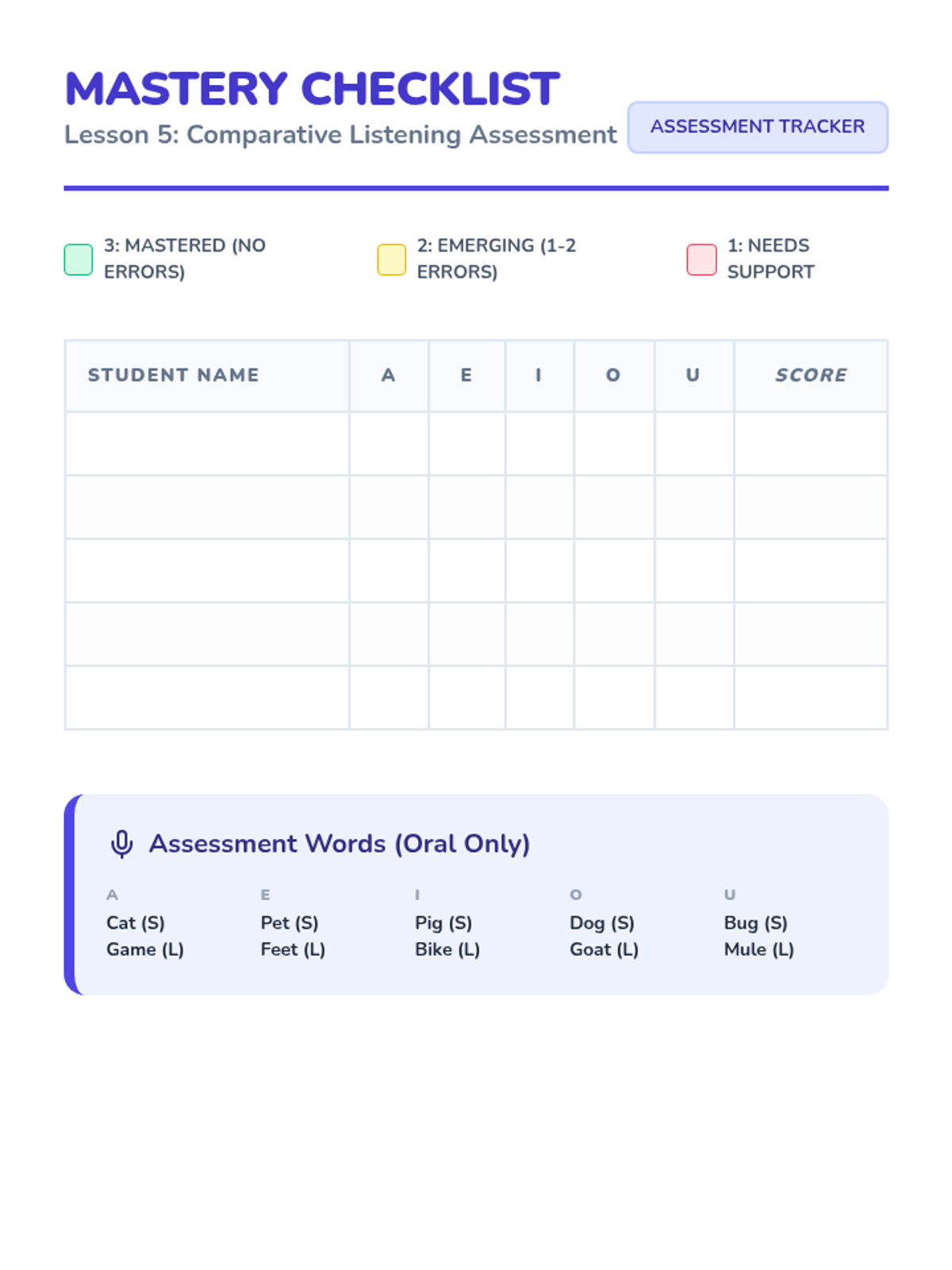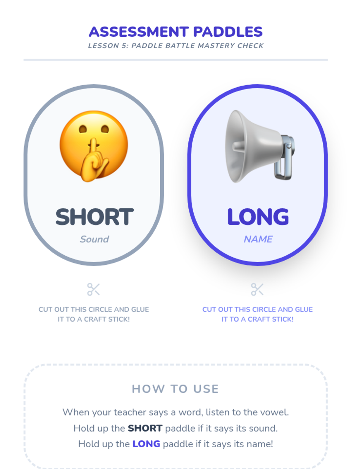 In this final session, students demonstrate their ability to distinguish sounds by listening to a word and holding up a 'Short' or 'Long' paddle. This mastery check ensures readiness for learning the spelling conventions of long vowels.