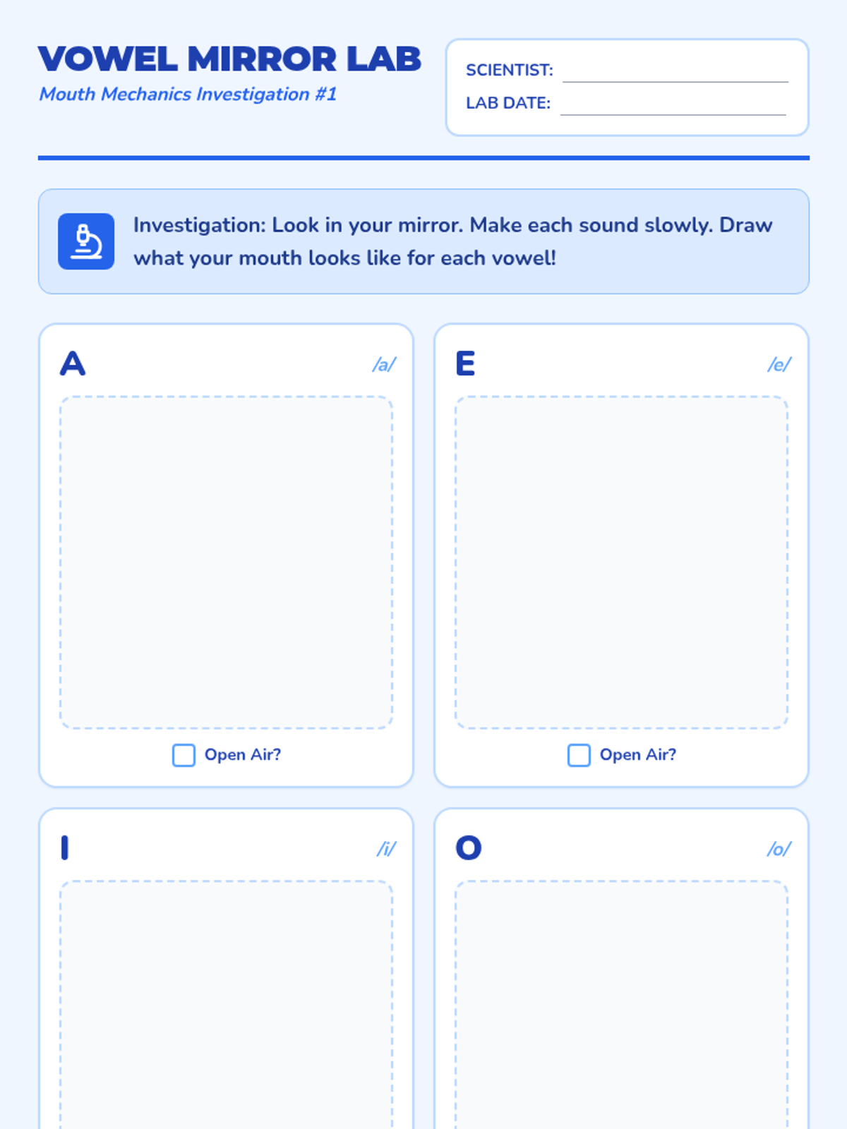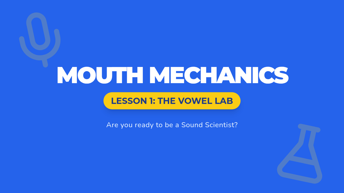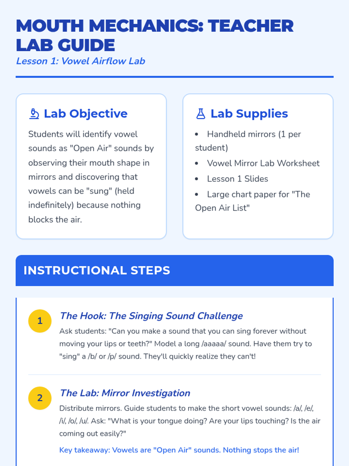 Students use mirrors to observe vowel production, noting open airflow and the ability to hold vowel sounds indefinitely.
