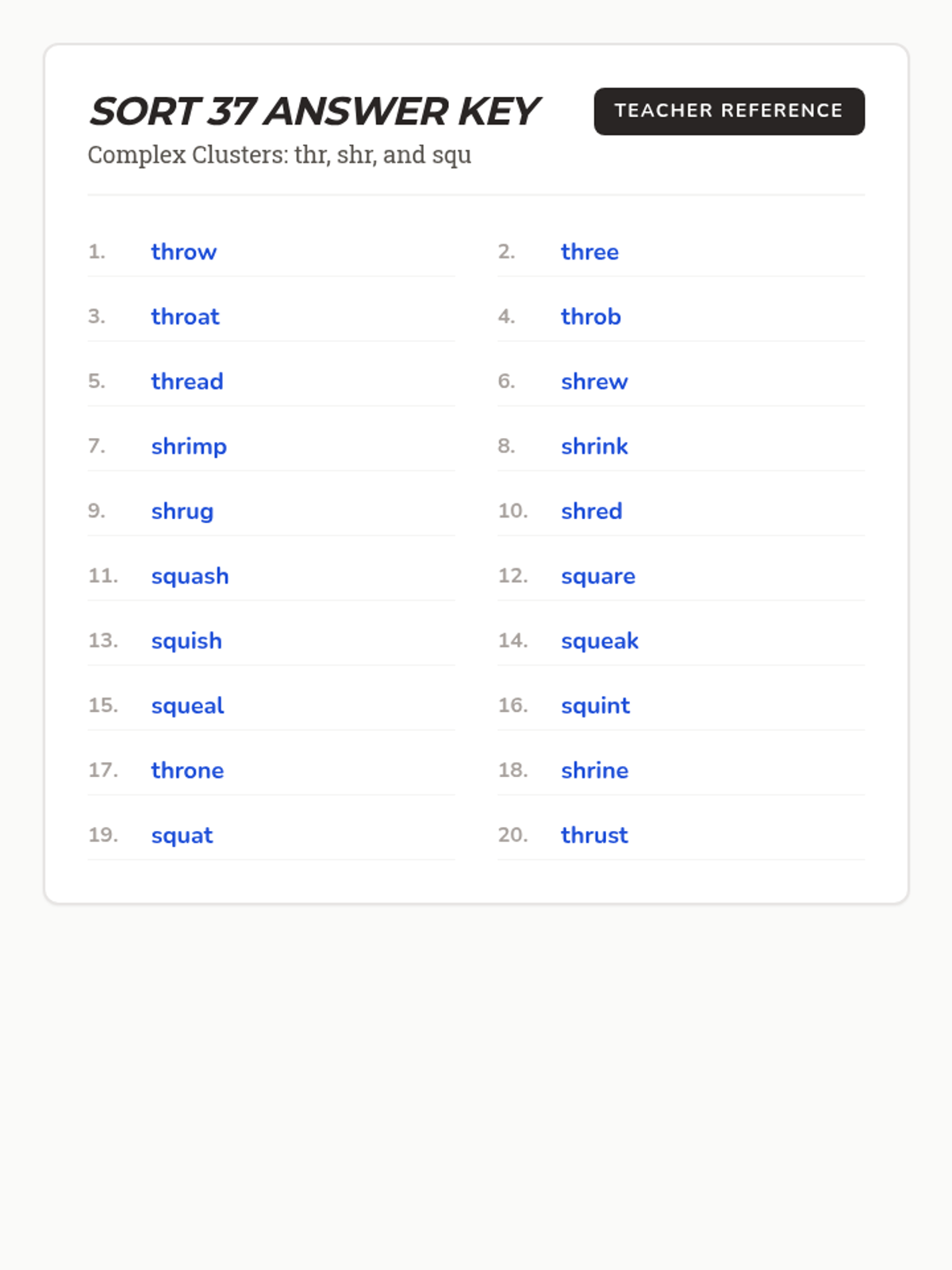 Focuses on complex consonant clusters including triple blends (scr, str, spr, thr, shr, squ), silent consonants (kn, wr, gn), and variations of hard/soft c and g. Students will practice these intricate spelling patterns through context.