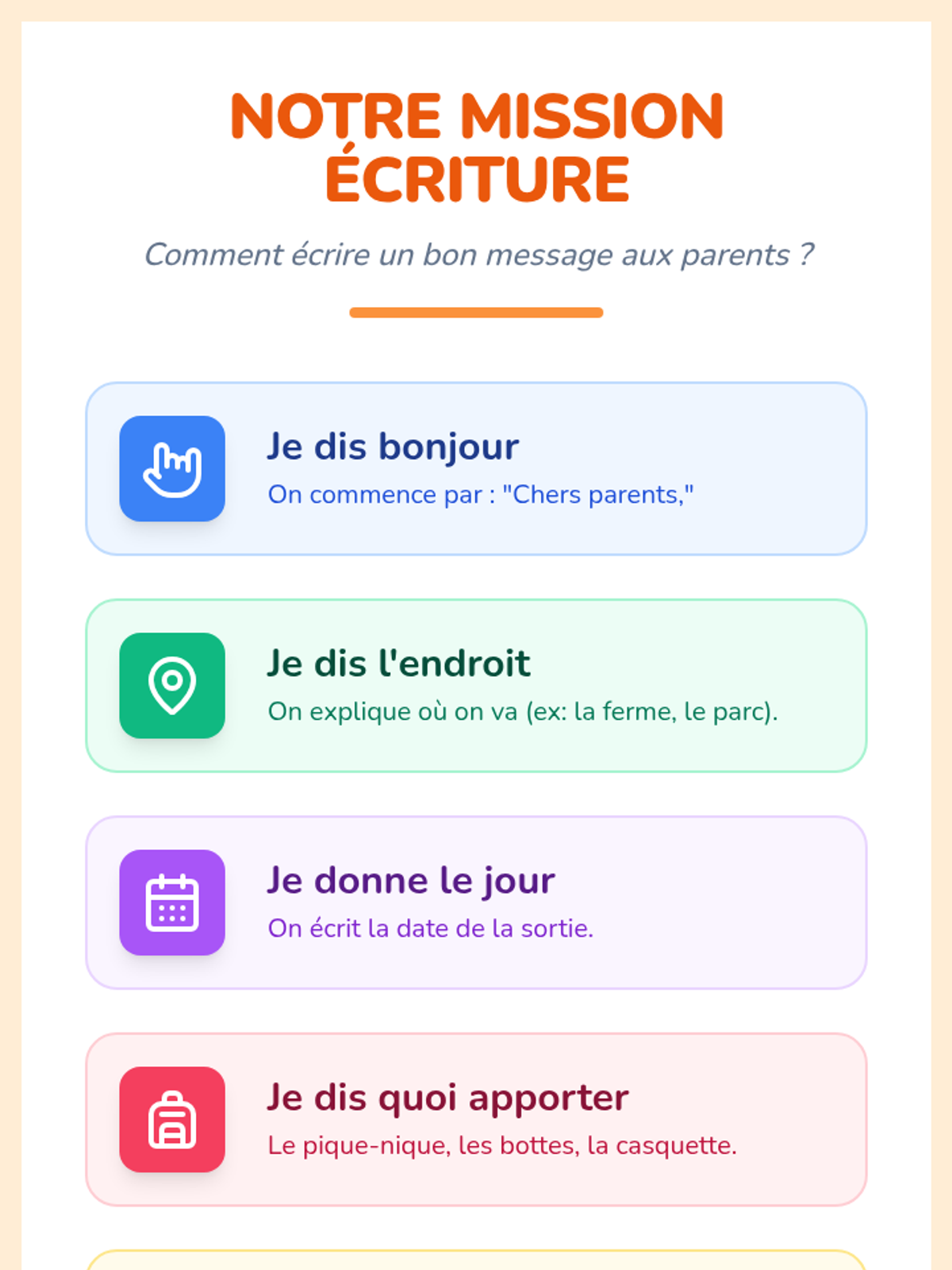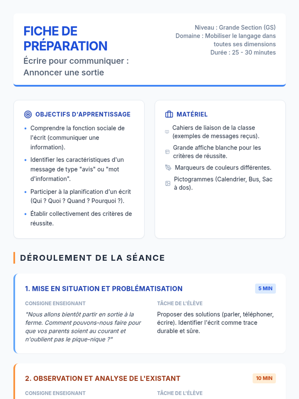 Cette leçon vise à introduire un projet d'écriture authentique en Grande Section : rédiger un message aux parents pour annoncer une sortie scolaire. Elle s'appuie sur l'observation de messages existants pour définir des critères de réussite et initier la planification selon les programmes 2025.