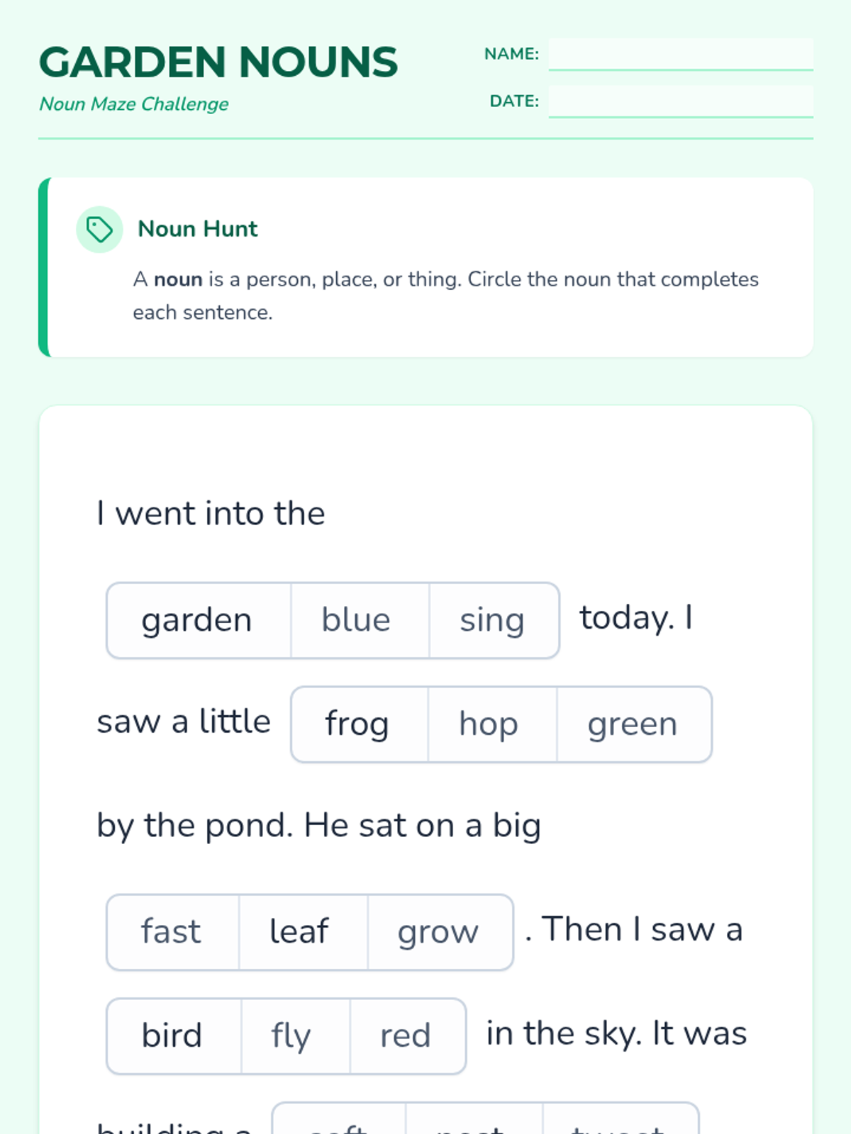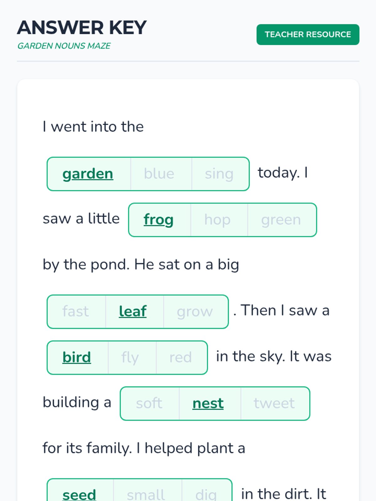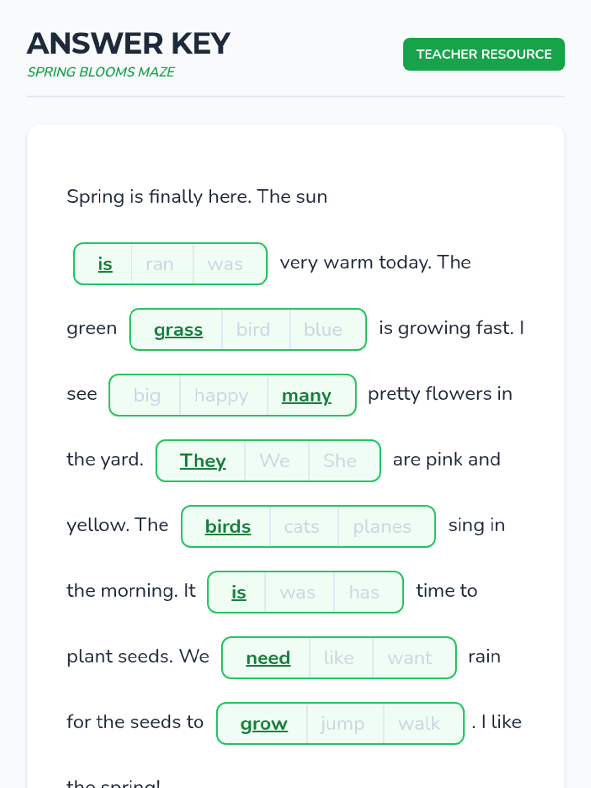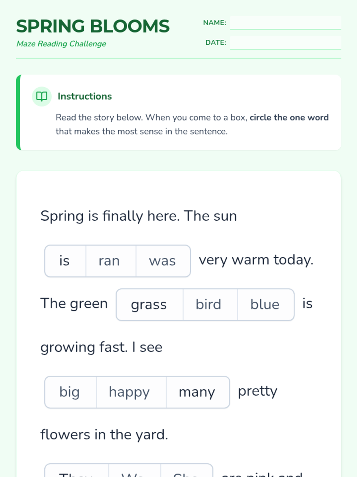 A beginning reading lesson focused on spring-themed vocabulary and reading comprehension using a maze-style assessment.