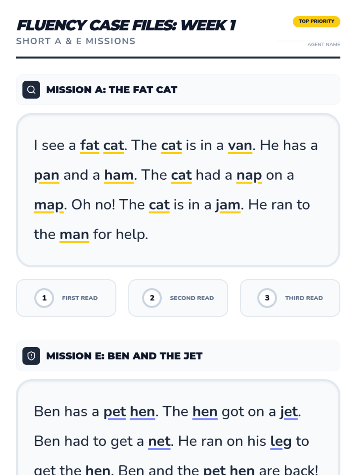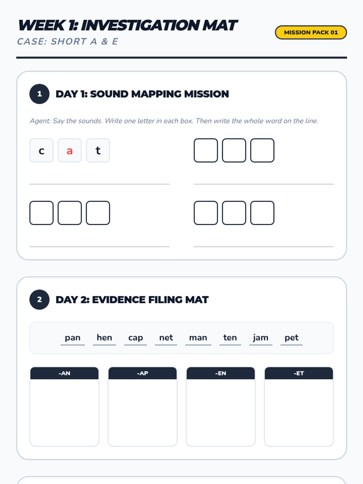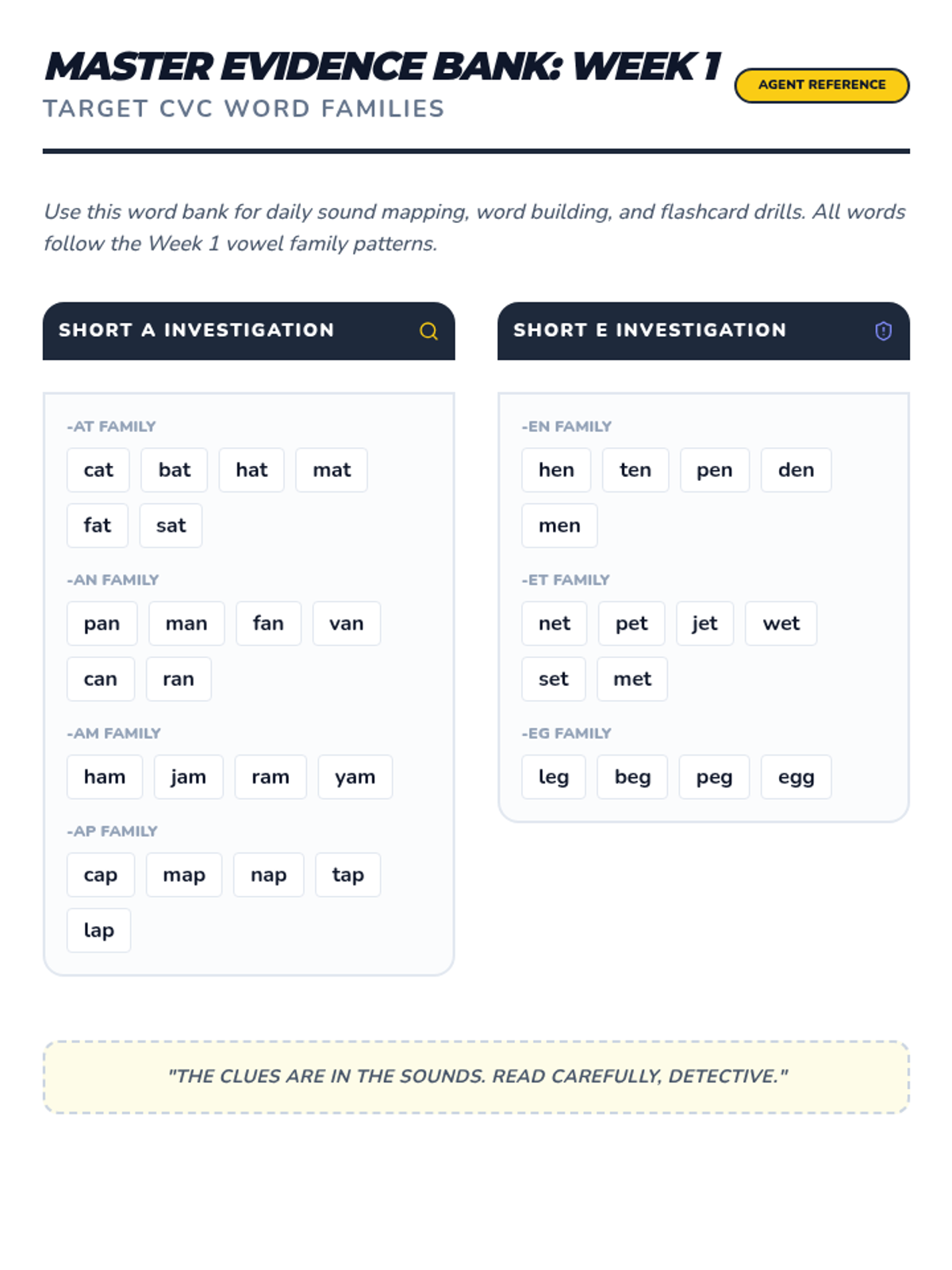 Focuses on short 'a' families (-at, -an, -am, -ap) and short 'e' families (-en, -et, -eg) alongside Fry words 1-33. Includes daily decoding drills and mystery-themed fluency passages.