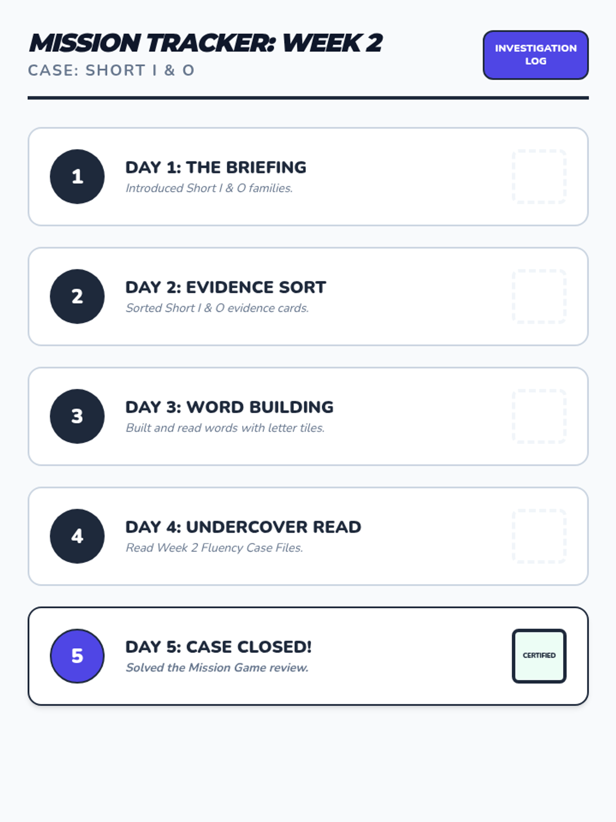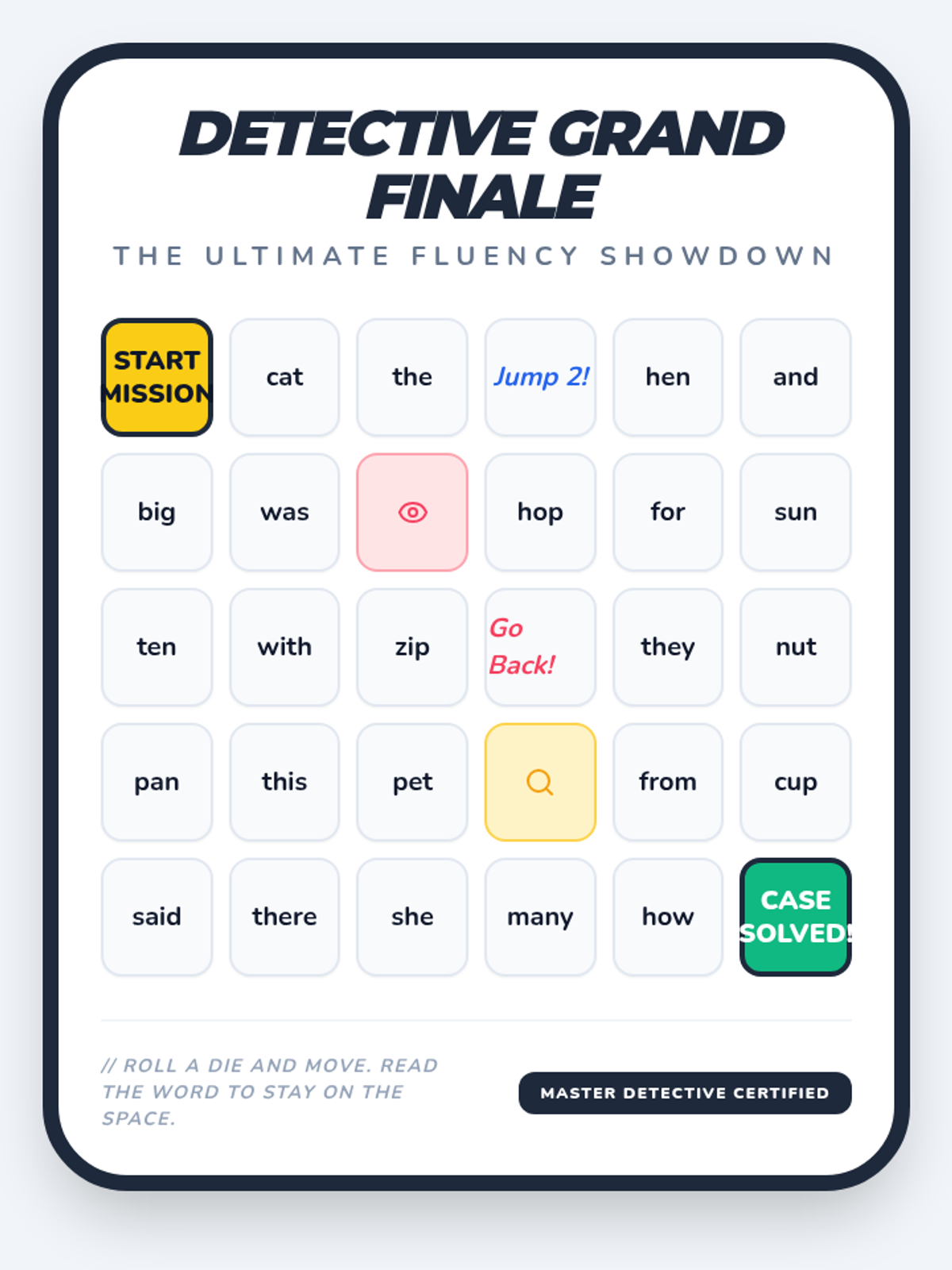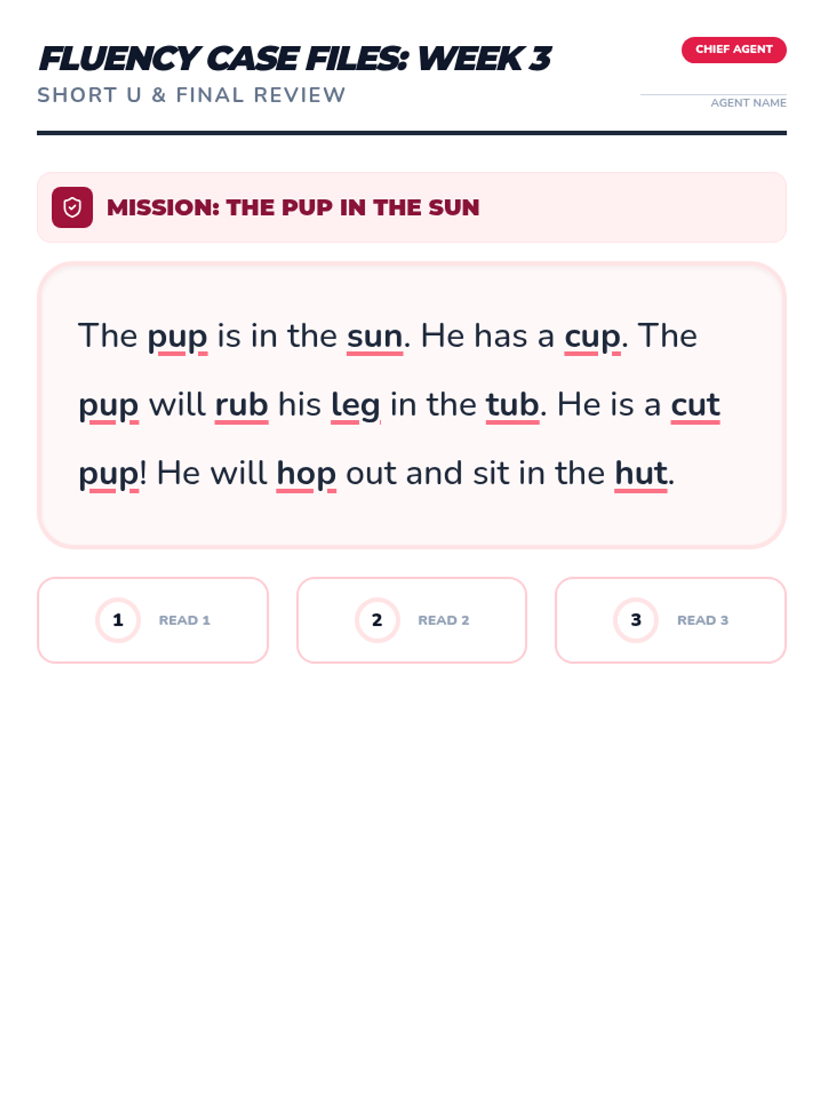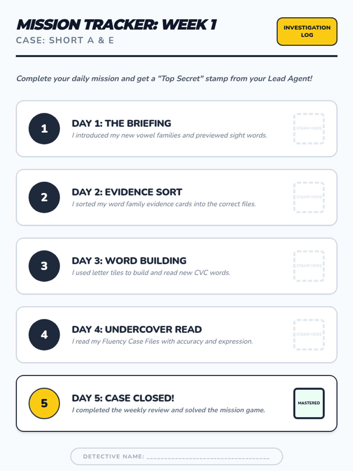 Focuses on short 'a' families (-at, -an, -am, -ap) and short 'e' families (-en, -et, -eg) alongside Fry words 1-33. Includes daily decoding drills and mystery-themed fluency passages.