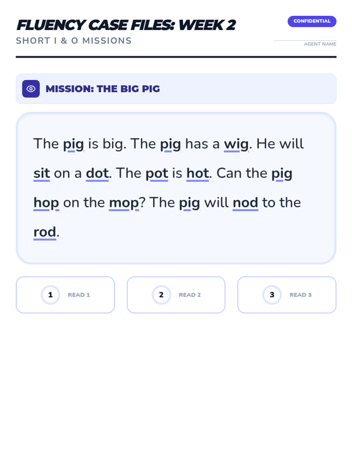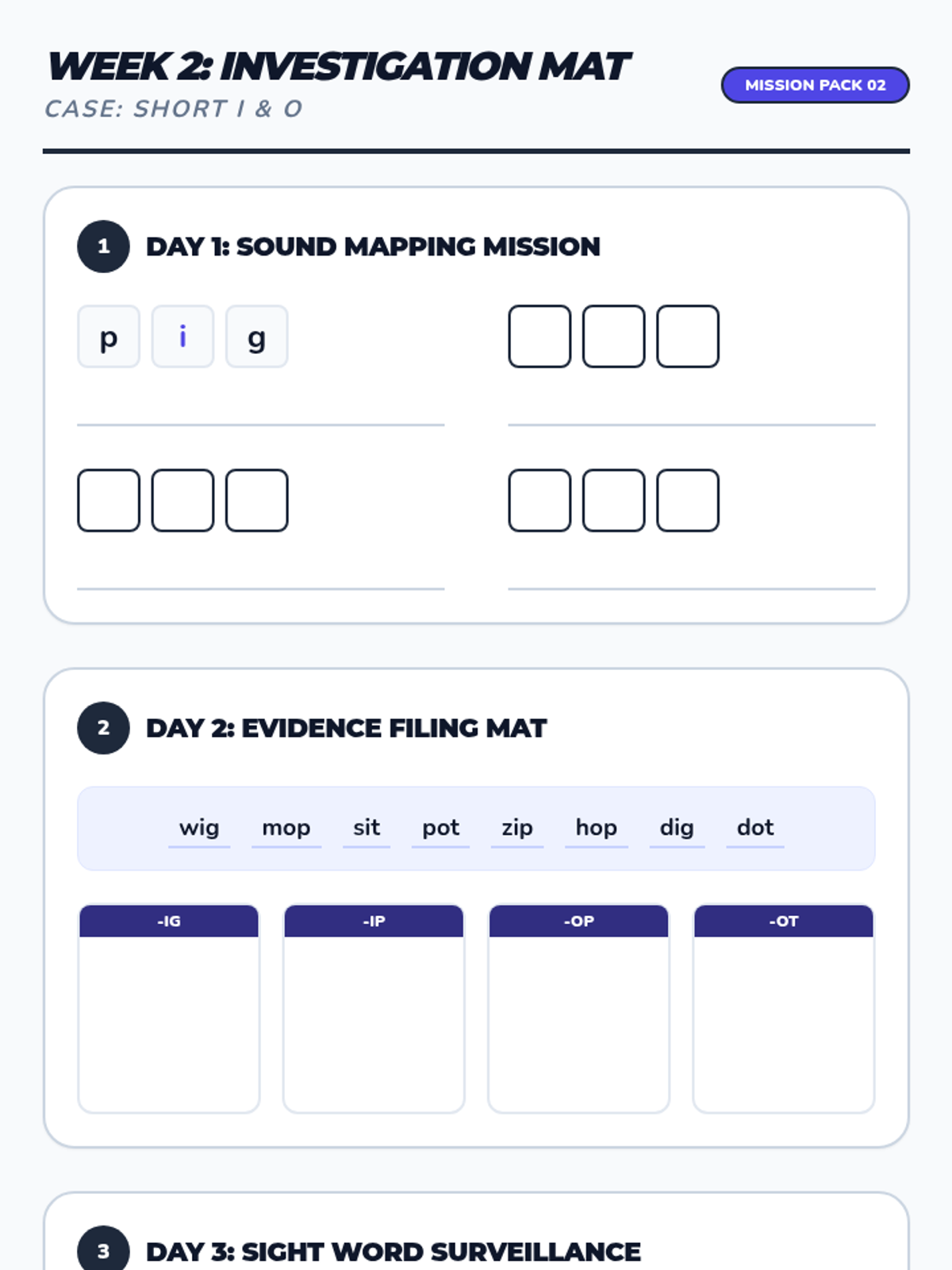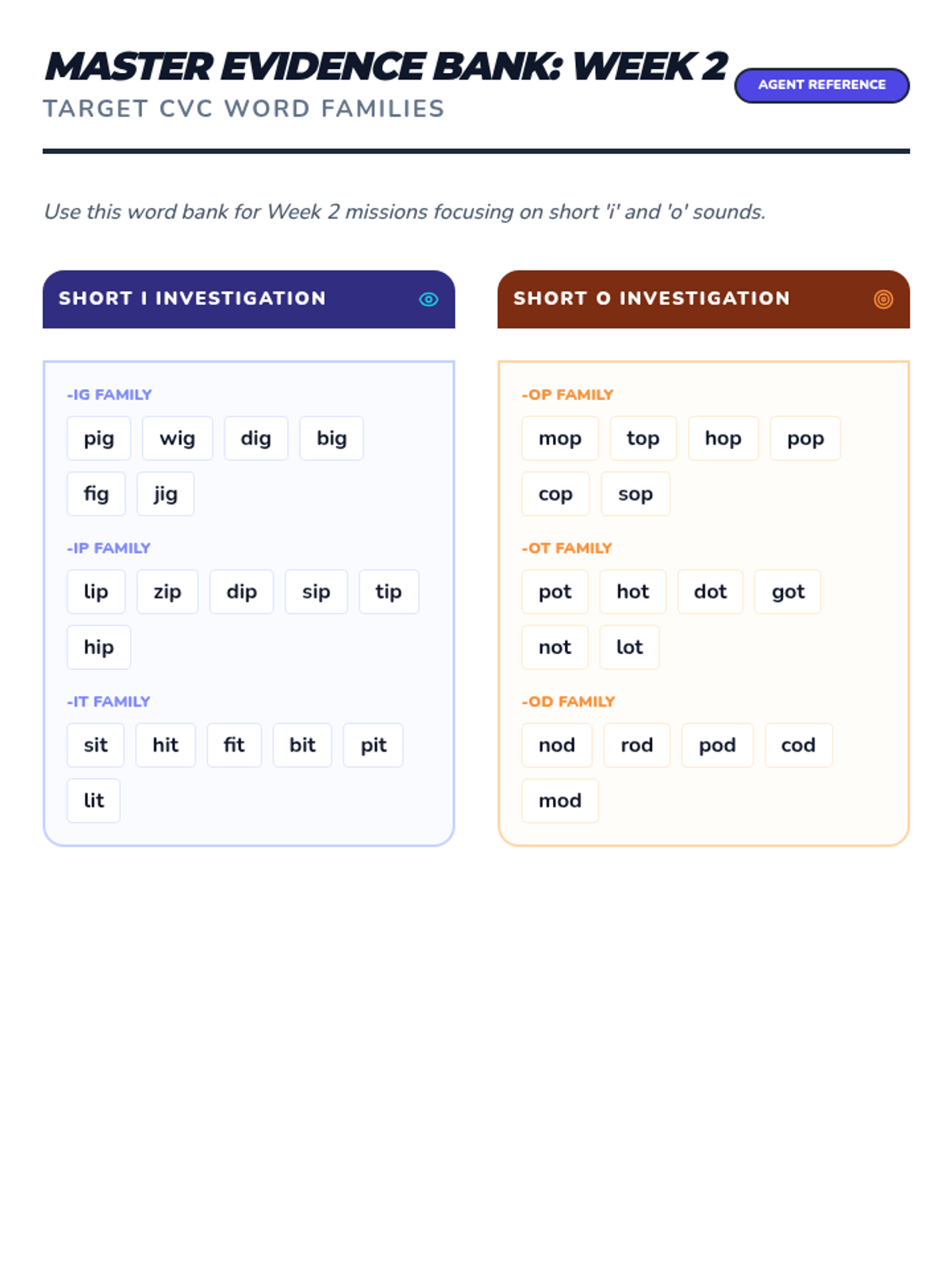 Focuses on short 'i' families (-ig, -ip, -it) and short 'o' families (-op, -ot, -od) with Fry words 34-66. Features 'I-Spy' word hunts and 'O-Note' fluency reading.