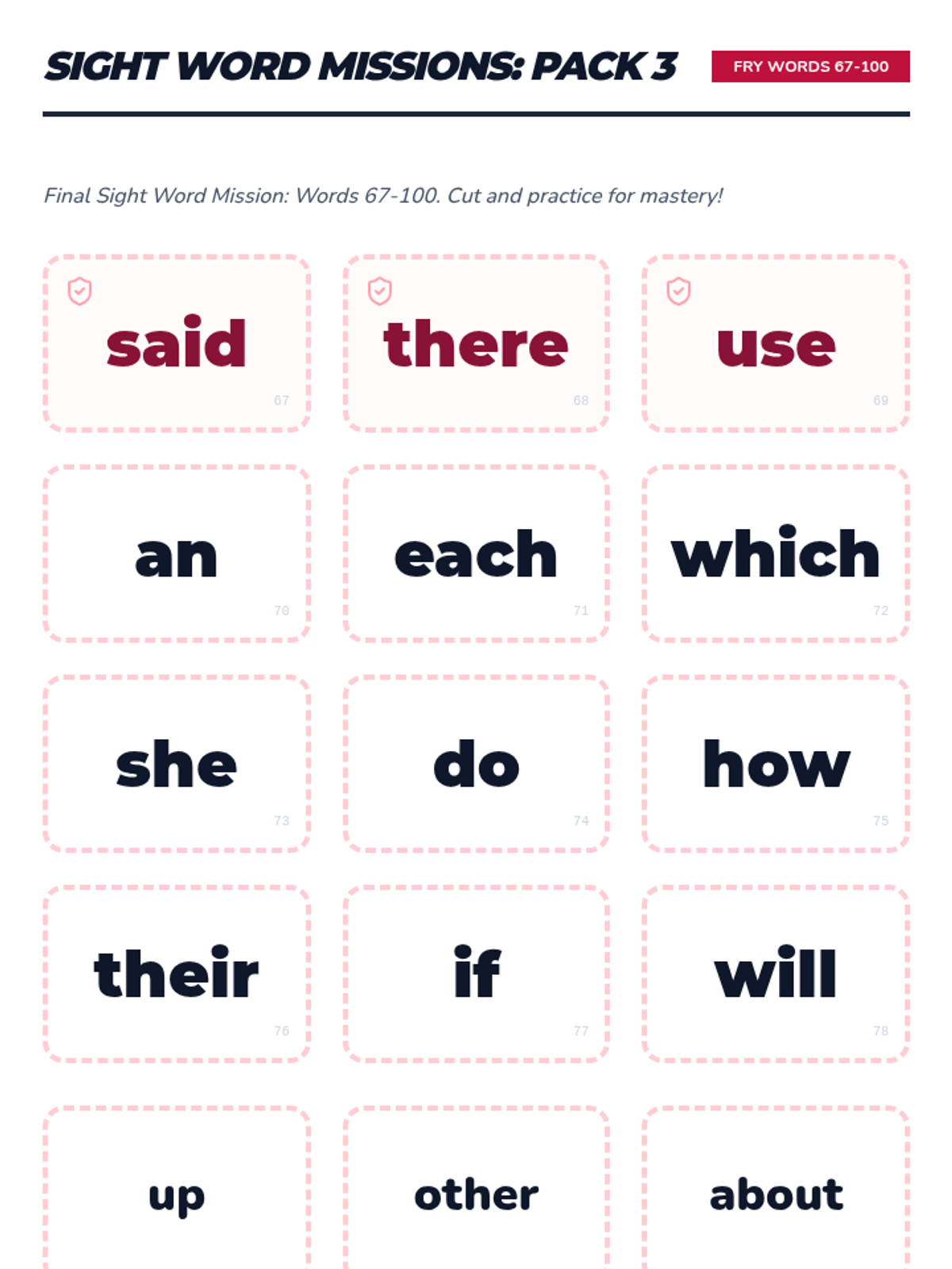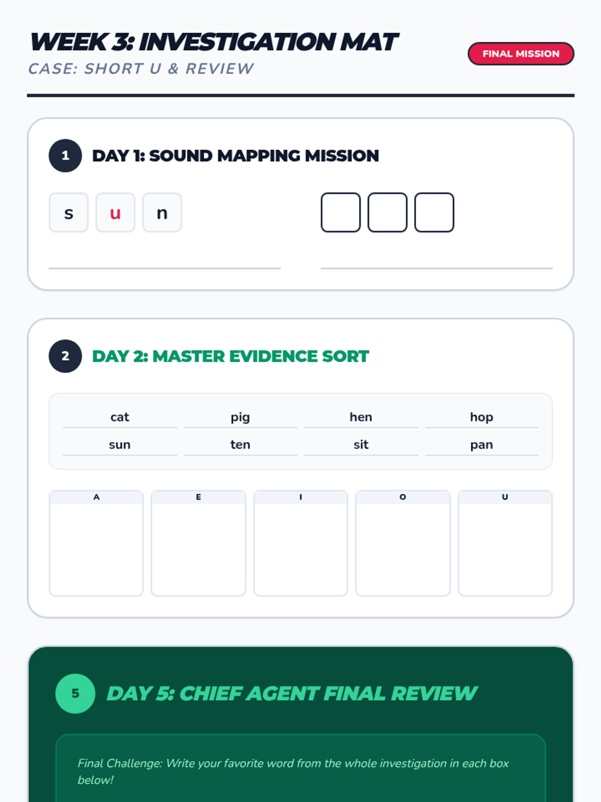Covers short 'u' families (-ub, -up, -ut) and Fry words 67-100, concluding with a comprehensive review of all vowel sounds and the full first 100 sight word list.