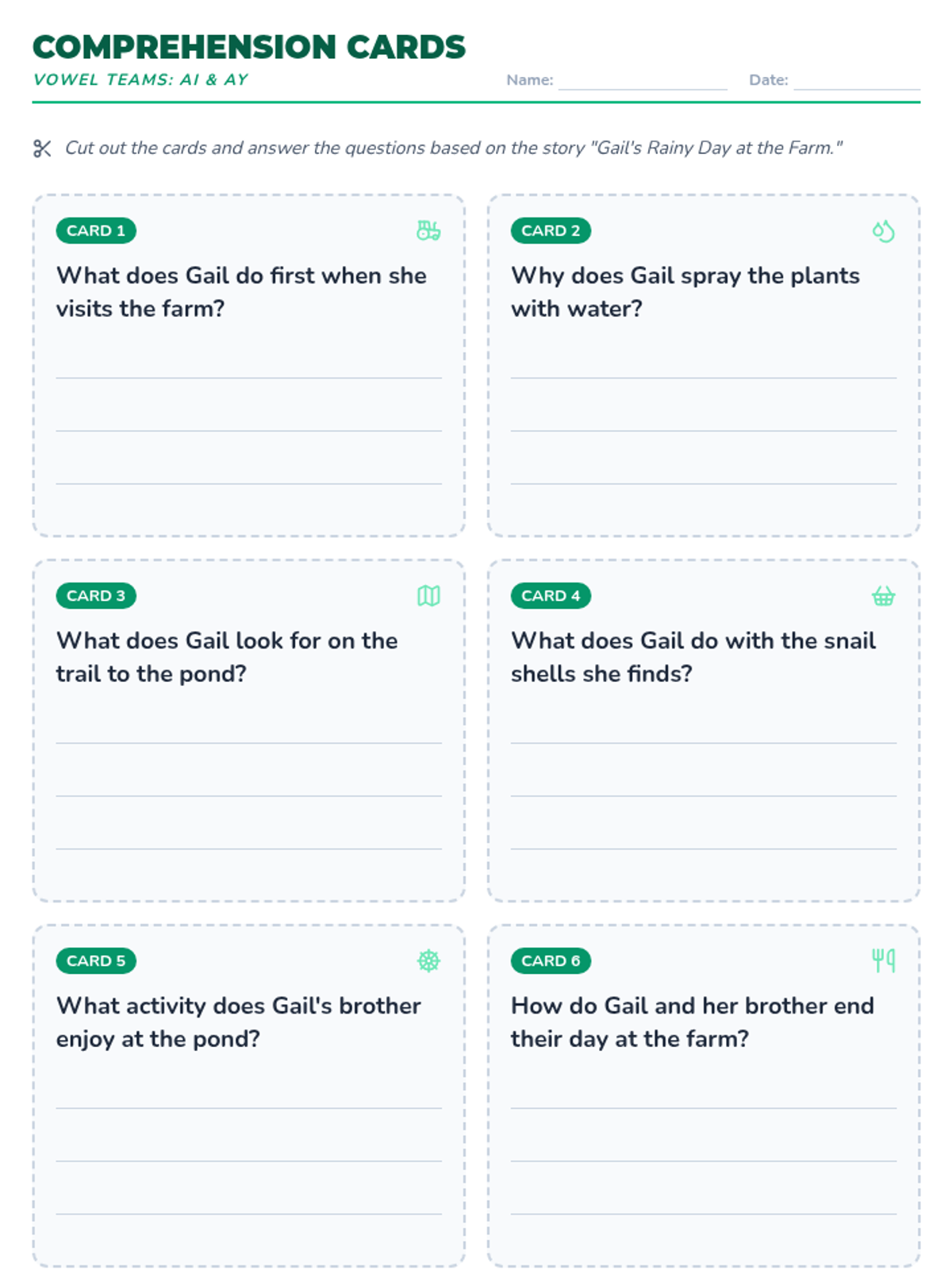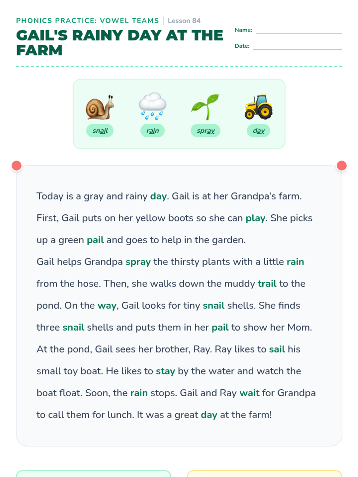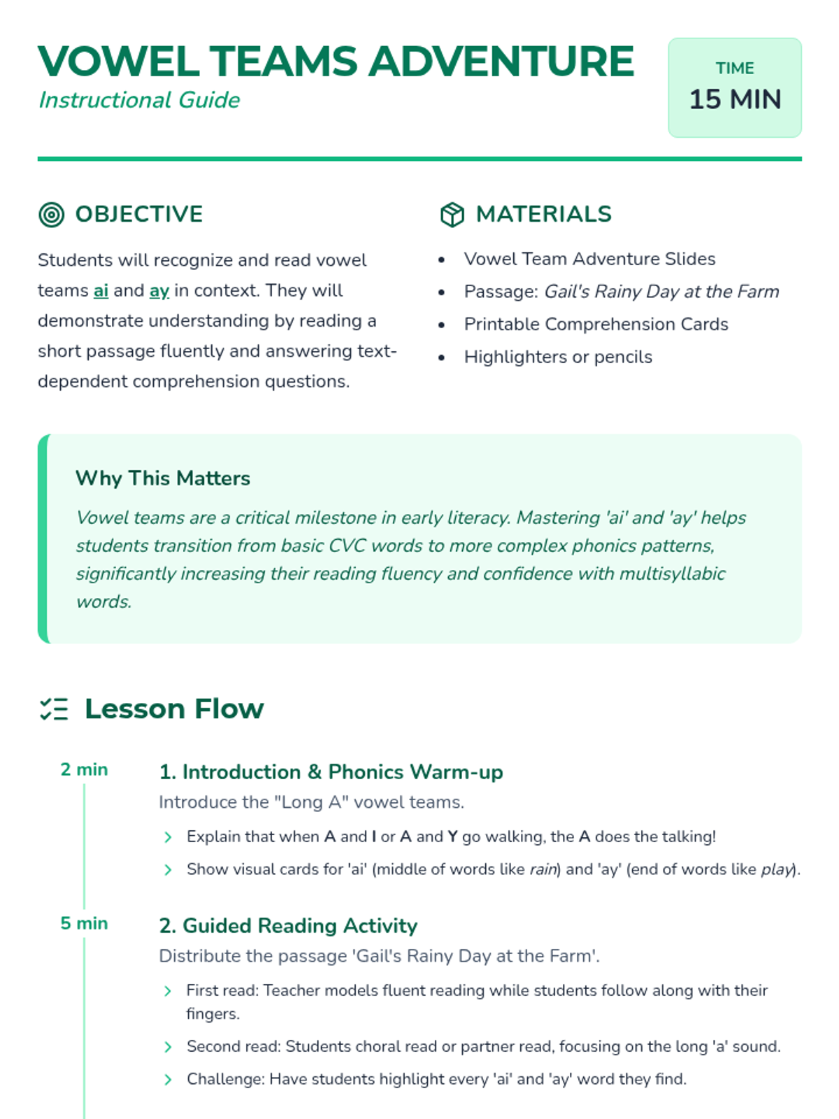 A foundational literacy lesson focusing on the vowel teams 'ai' and 'ay'. Students will read a narrative passage about a farm visit and answer comprehension questions to reinforce long 'a' sound recognition.