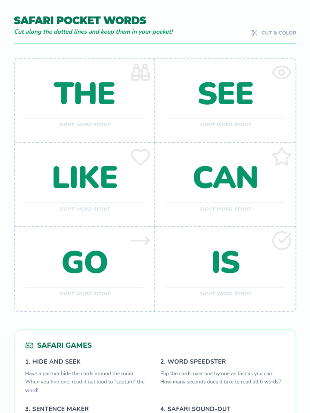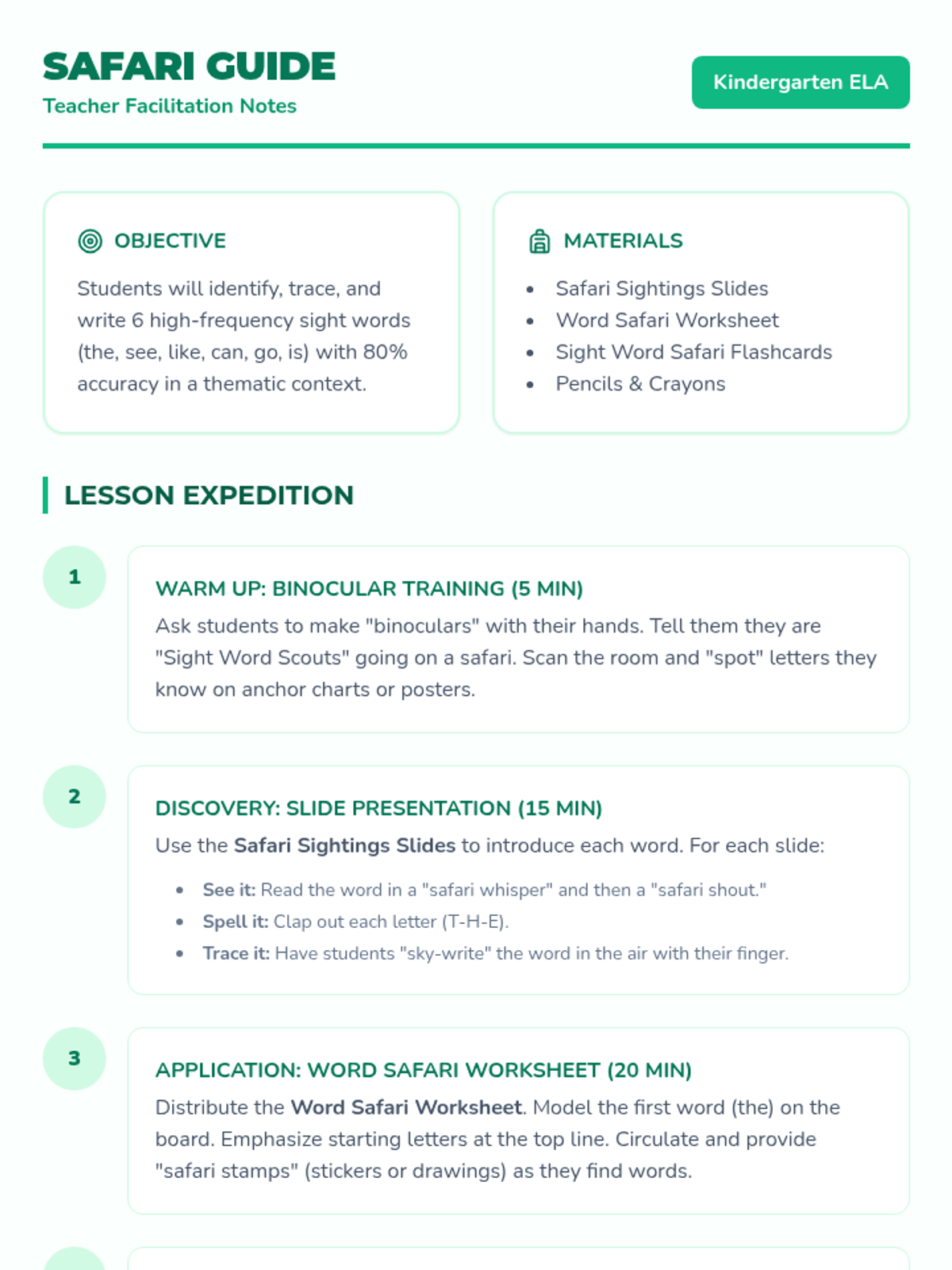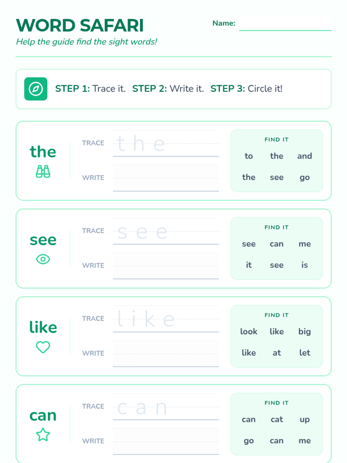 A foundational lesson for Kindergarten students to master 6 common sight words (the, see, like, can, go, is) through a fun jungle safari theme. Students will practice recognition, tracing, and writing.