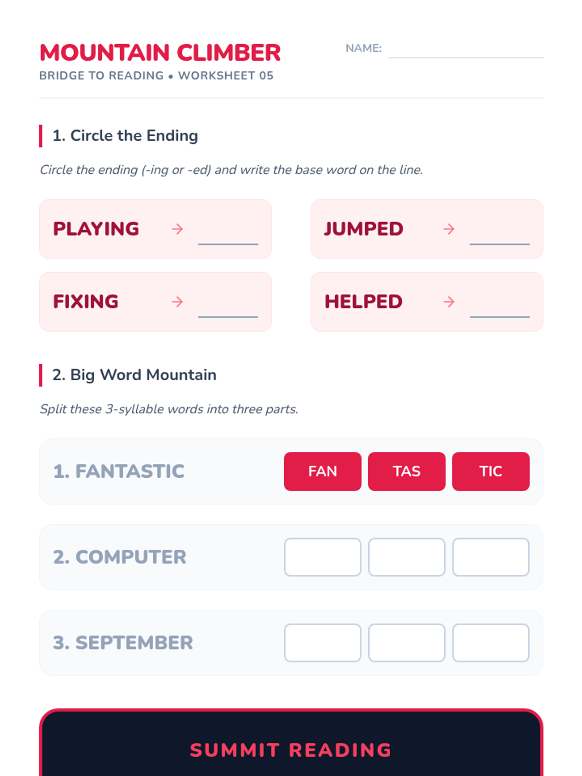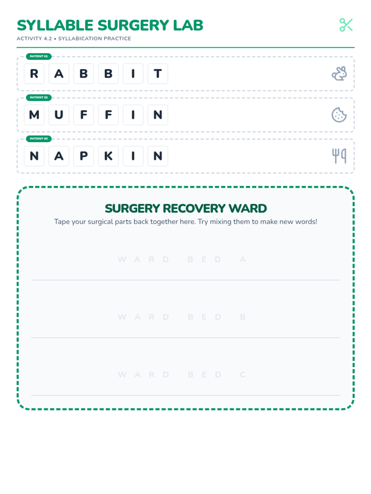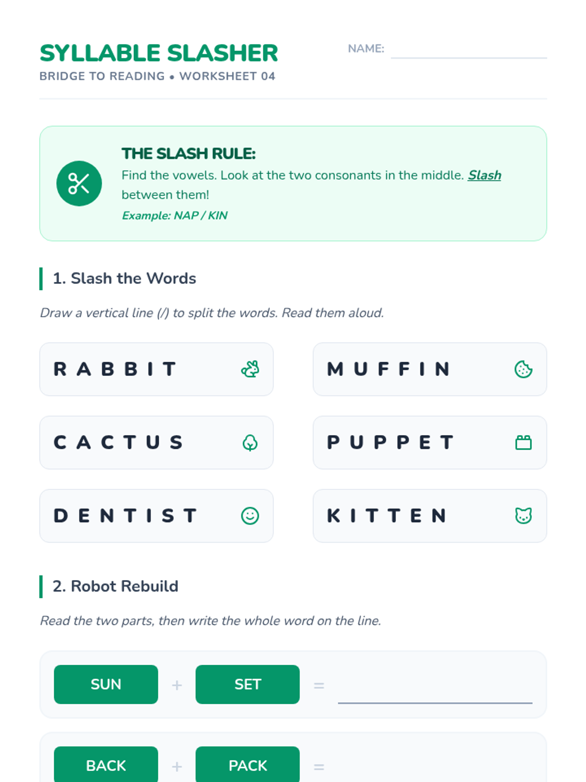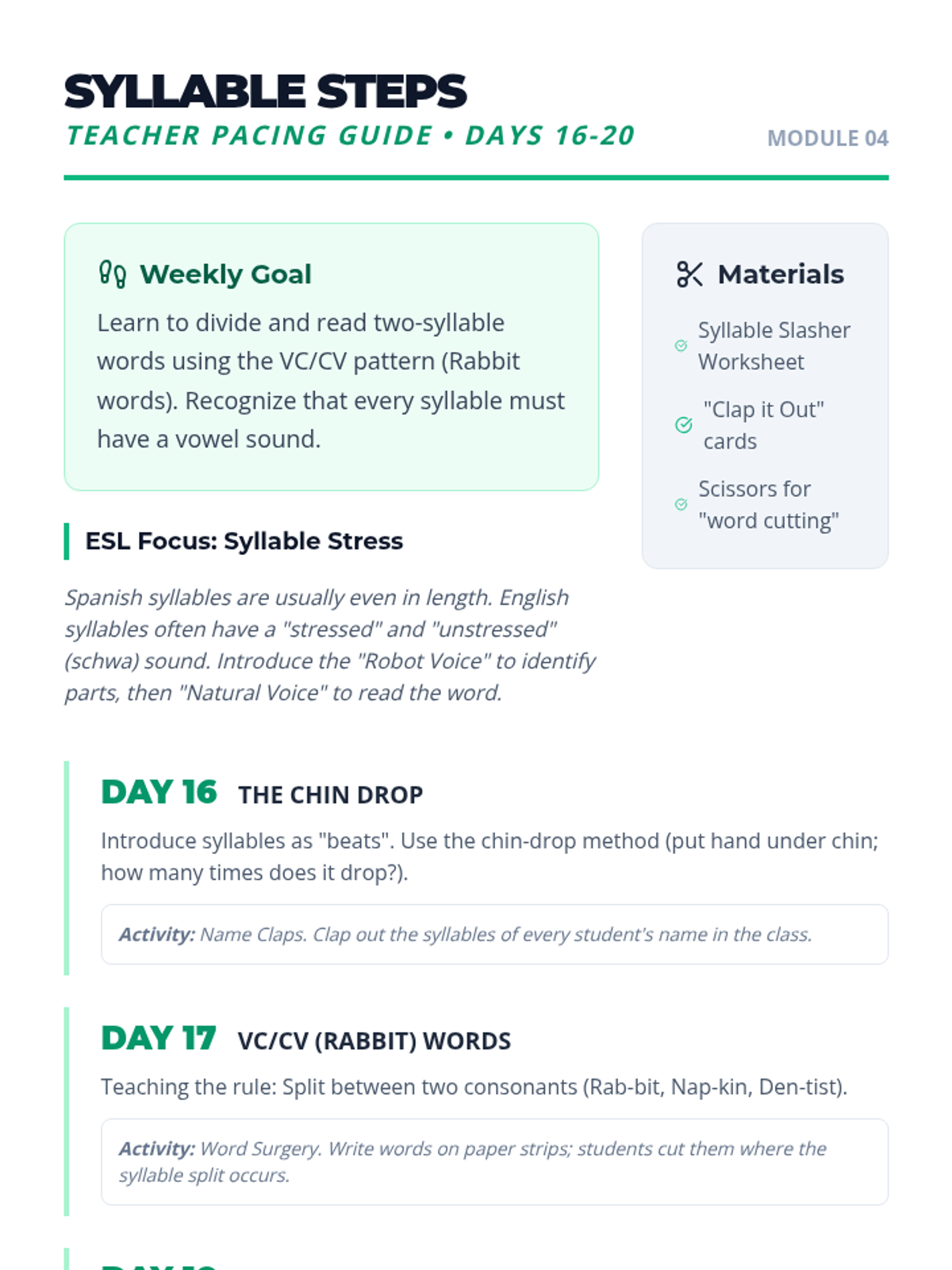 Introduces two-syllable words and basic syllabication rules (VC/CV), helping students tackle longer words. Days 16-20 of the 30-day plan.