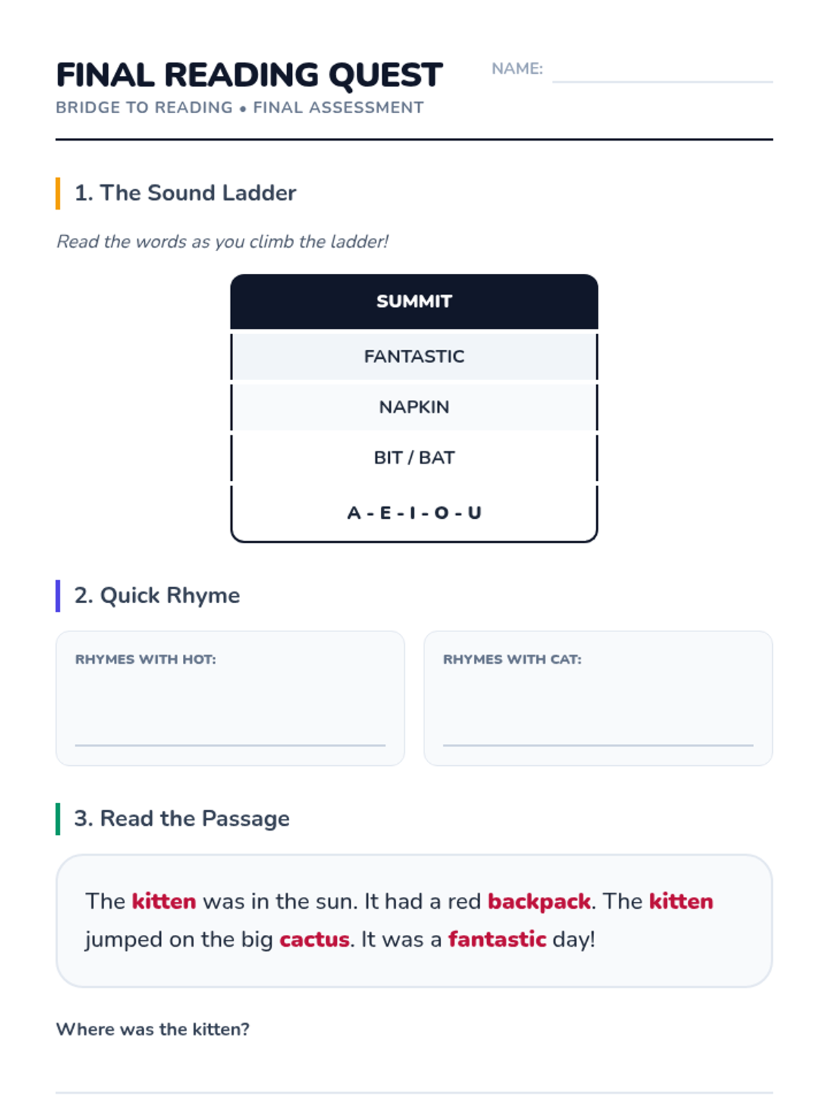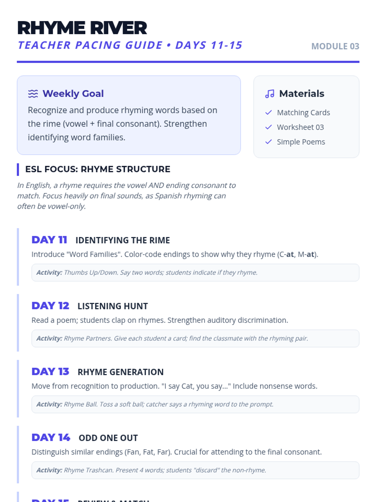 Explores phonological awareness through rhyming and word families, strengthening the connection between spelling patterns and sounds. Days 11-15 of the 30-day plan.