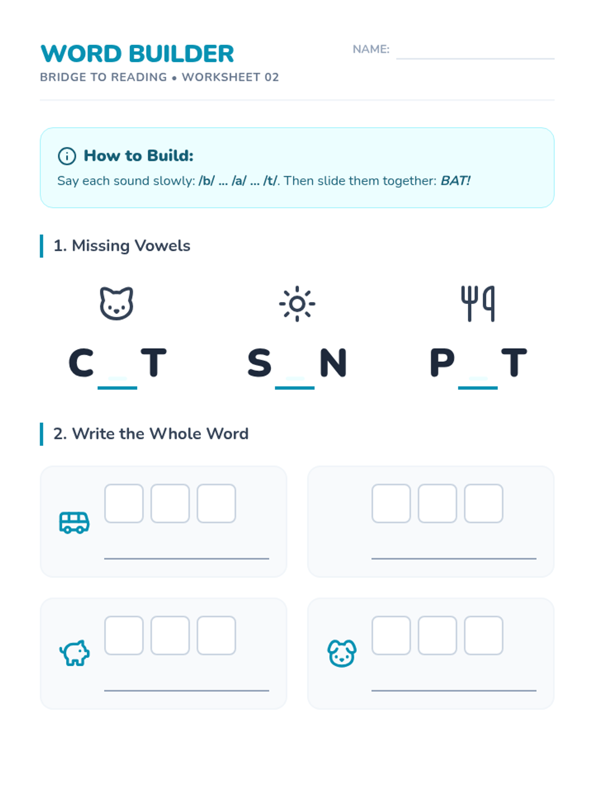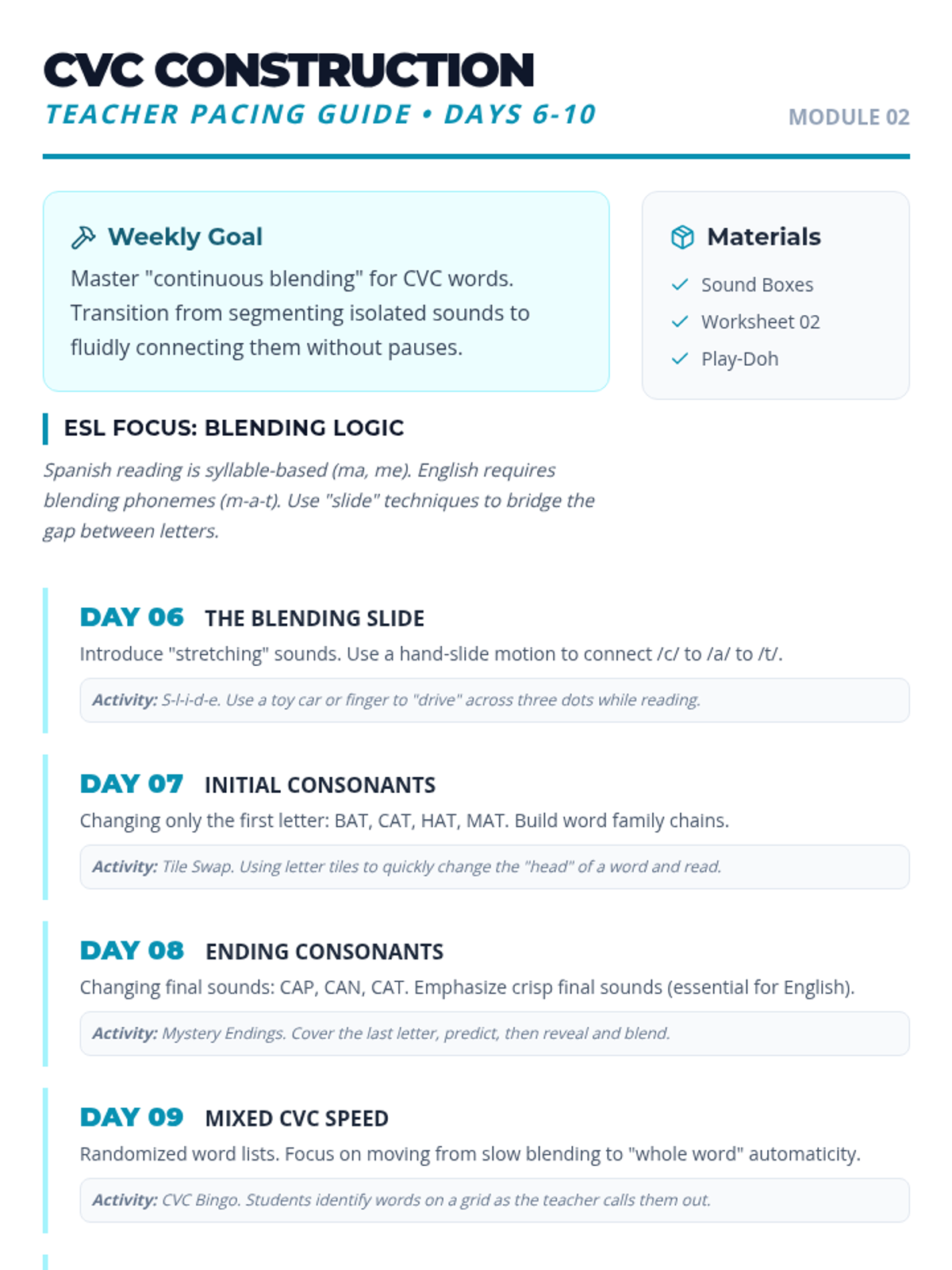 Introduces Consonant-Vowel-Consonant (CVC) blending and word families, transitioning students from isolated sounds to fluid reading. Days 6-10 of the 30-day plan.