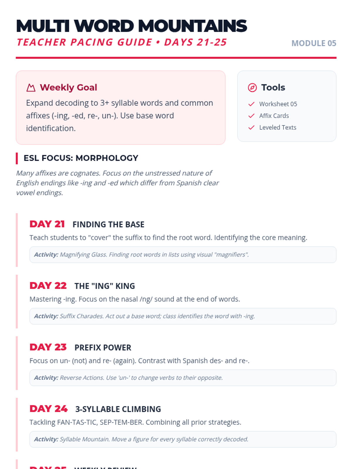 Focuses on more complex multisyllabic words, common prefixes, and suffixes to expand decoding capabilities. Days 21-25 of the 30-day plan.