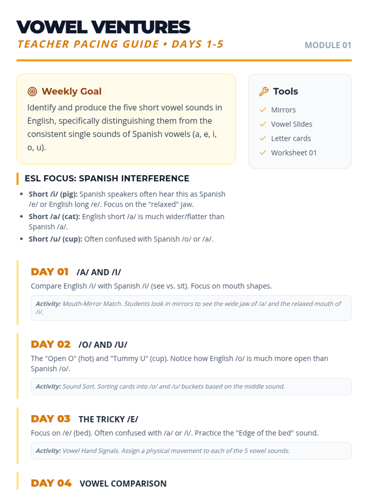 Focuses on the five short vowel sounds, contrasting them with Spanish vowel sounds to help students distinguish English phonemes. Days 1-5 of the 30-day plan.