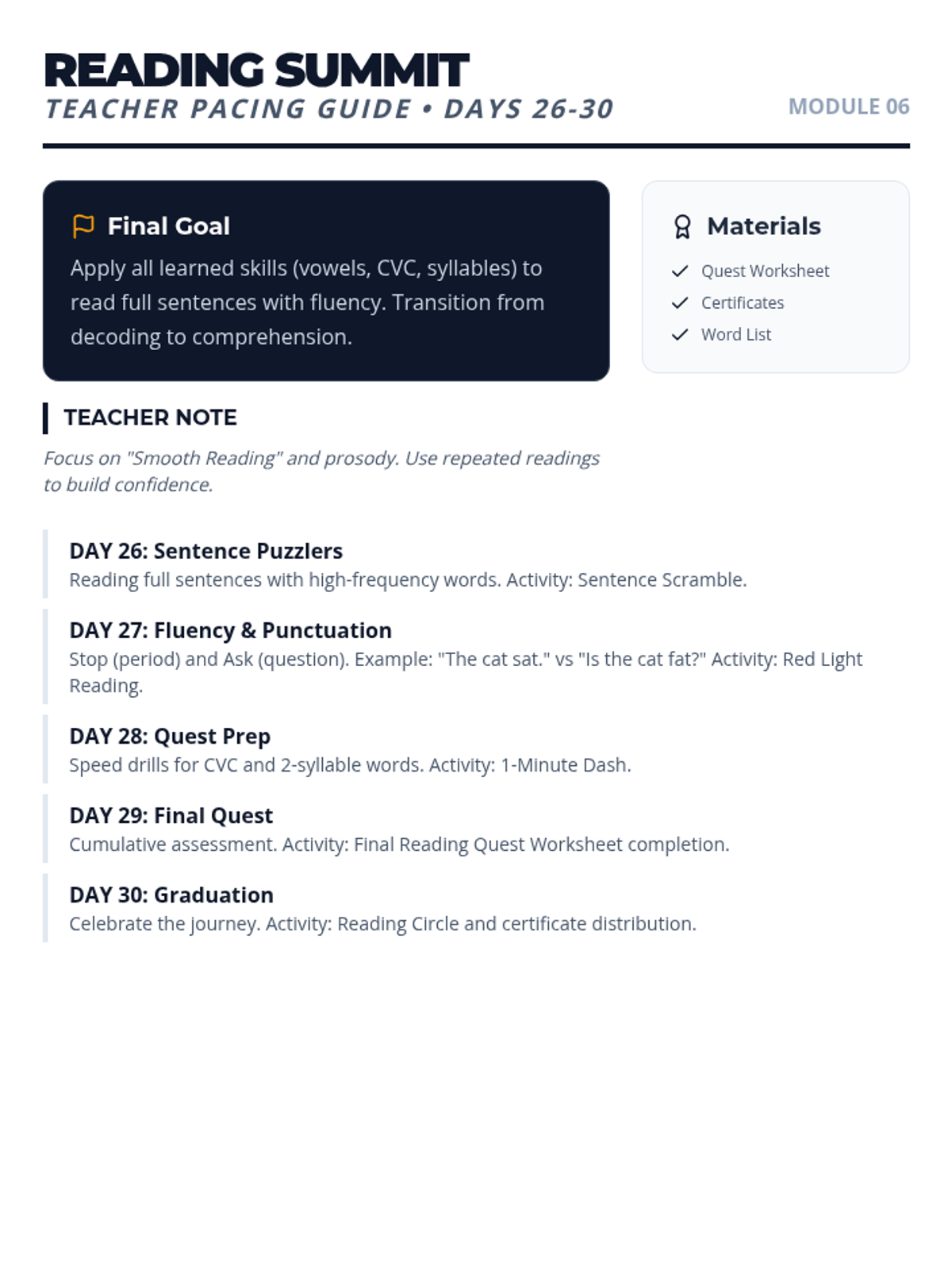 Consolidates all skills through fluency practice, sentence reading, and a final assessment of the 30-day journey. Days 26-30 of the 30-day plan.