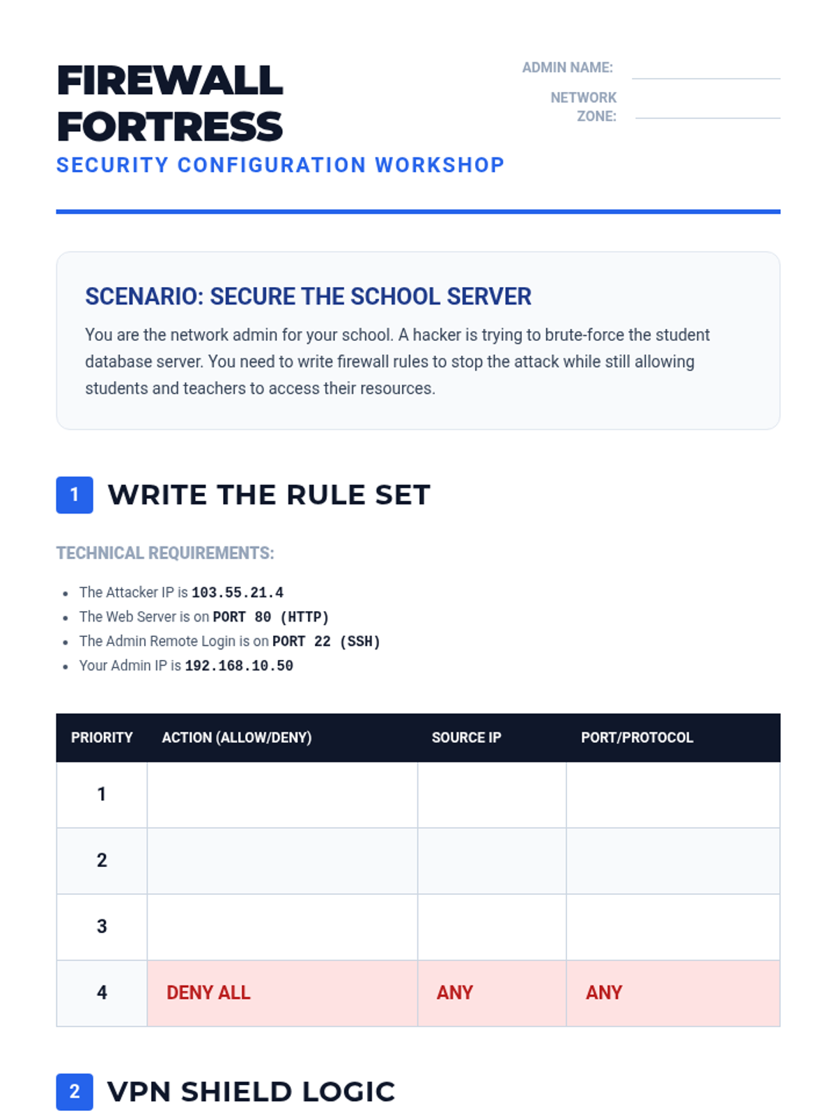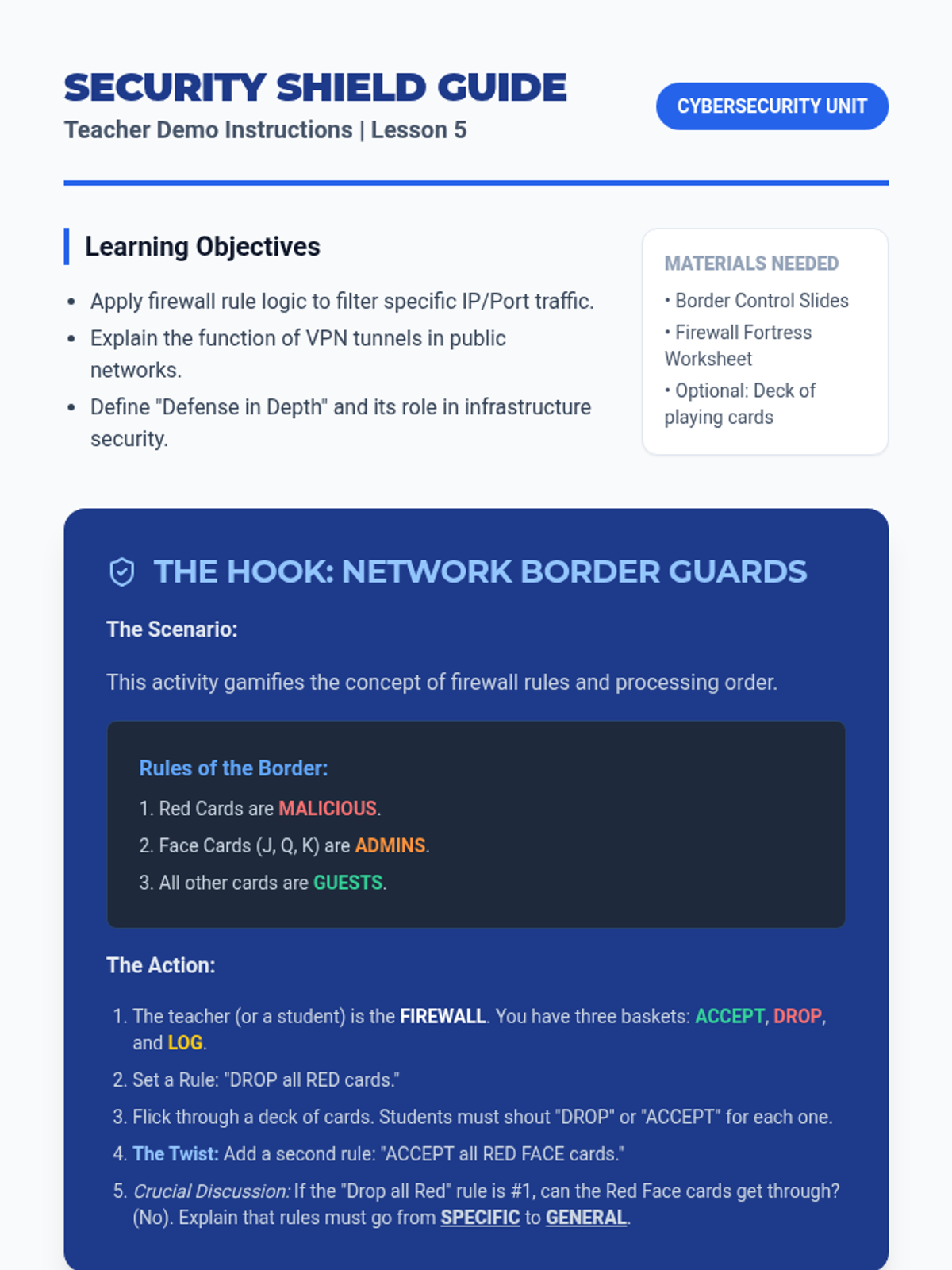 Students explore defensive network technologies, specifically how Virtual Private Networks (VPNs) create encrypted tunnels and how firewalls filter traffic based on rules. They configure a simple firewall rule set to block specific malicious traffic types.