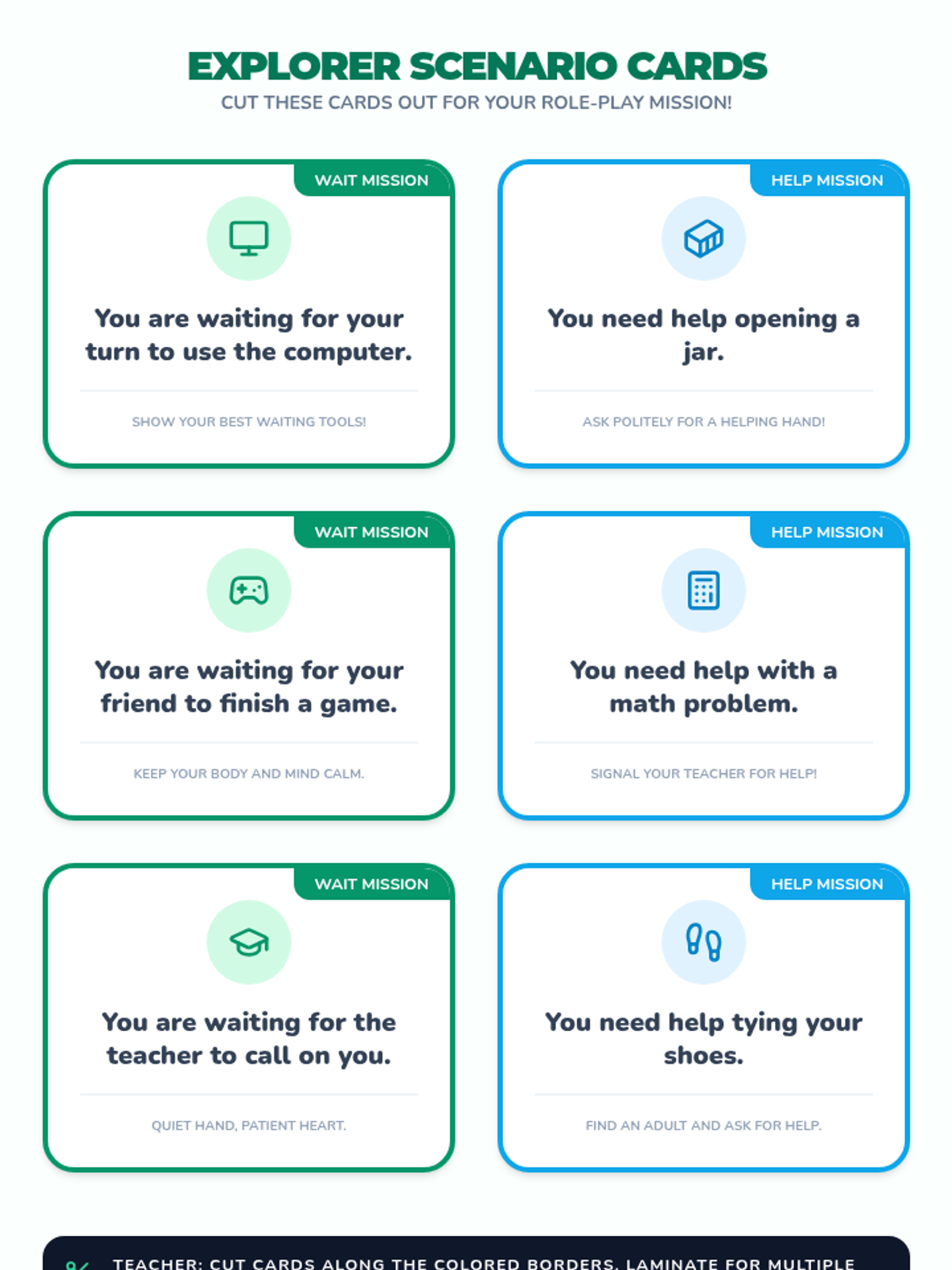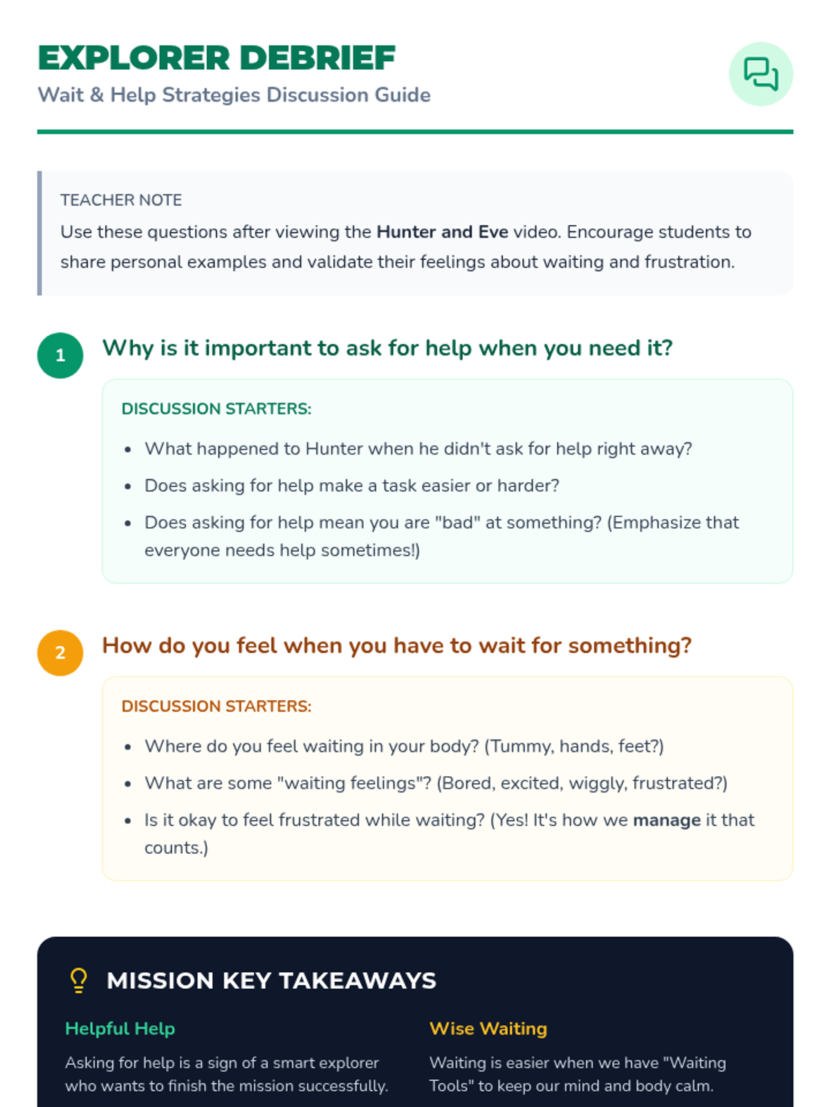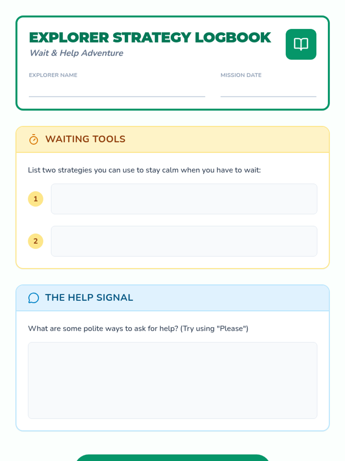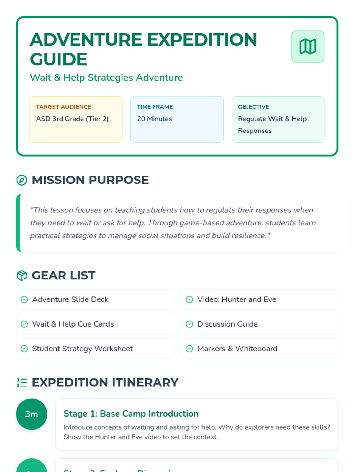 A 20-minute Tier 2 group lesson for 3rd-grade ASD students focused on self-regulation during waiting and asking for help using an adventure-themed approach.