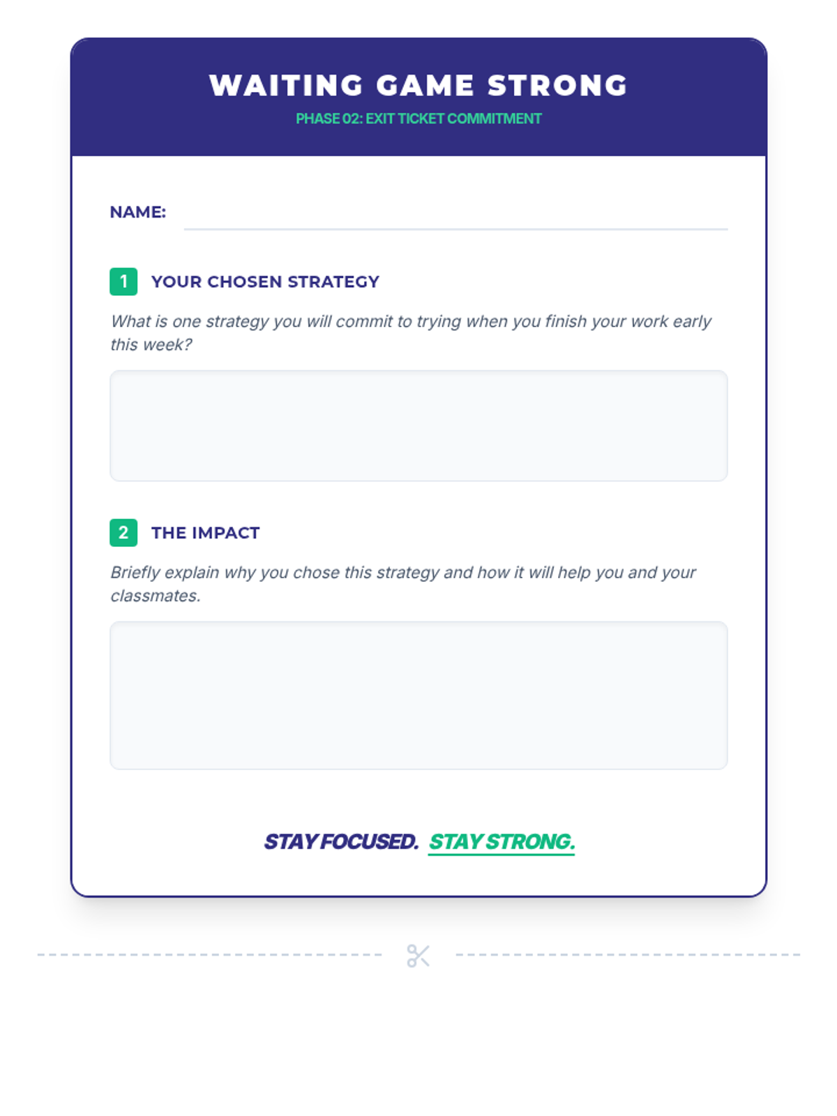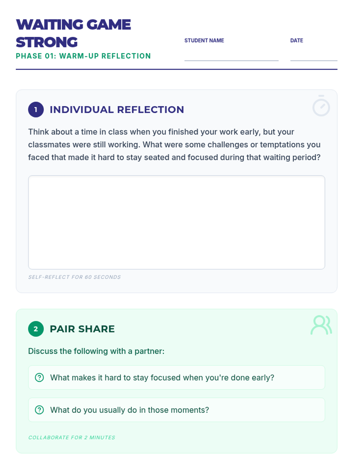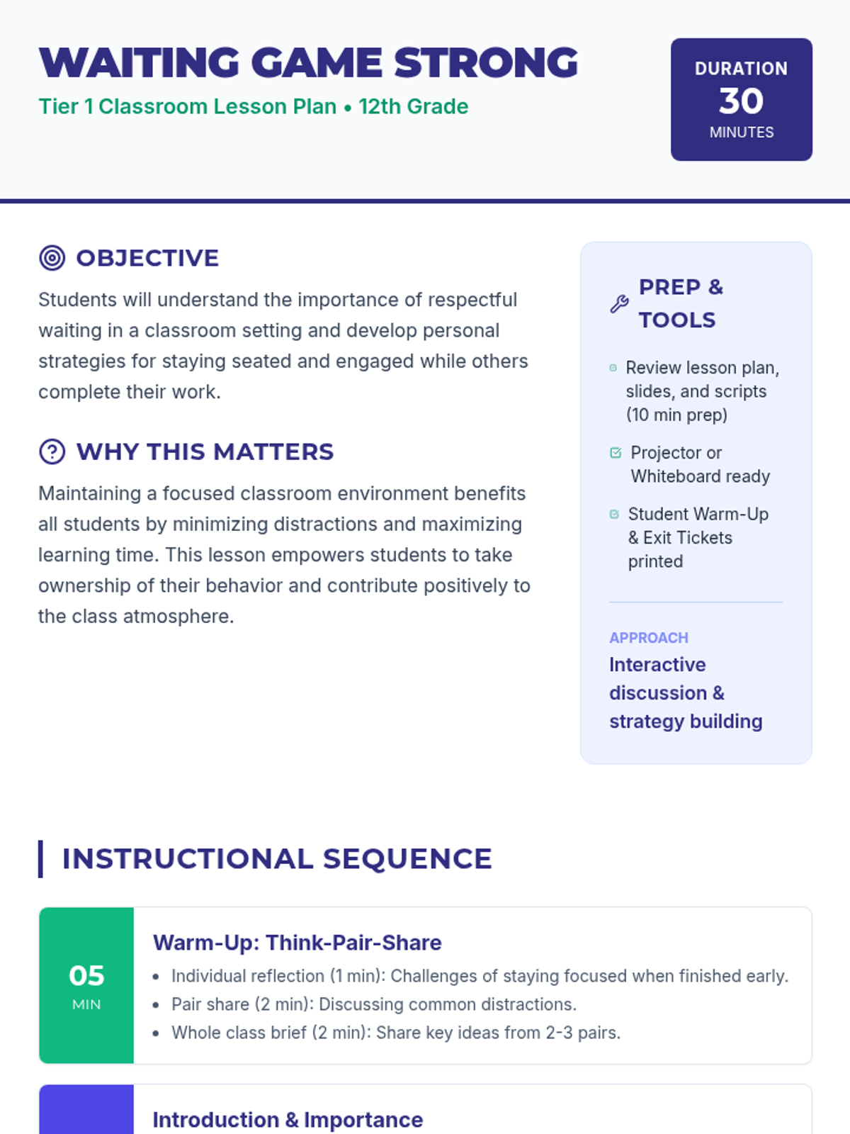 A 30-minute Tier 1 lesson for 12th-grade students to develop strategies for staying seated and engaged while waiting for classmates, promoting a focused and respectful classroom environment.