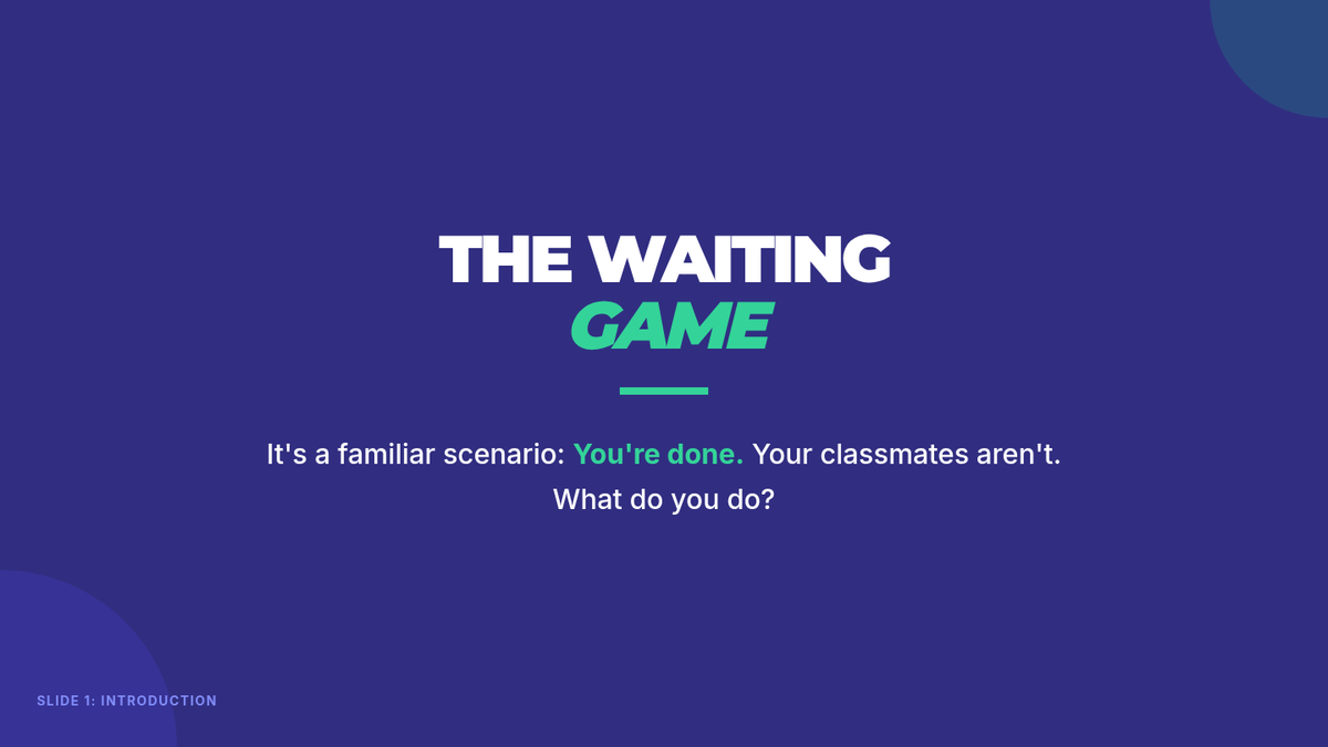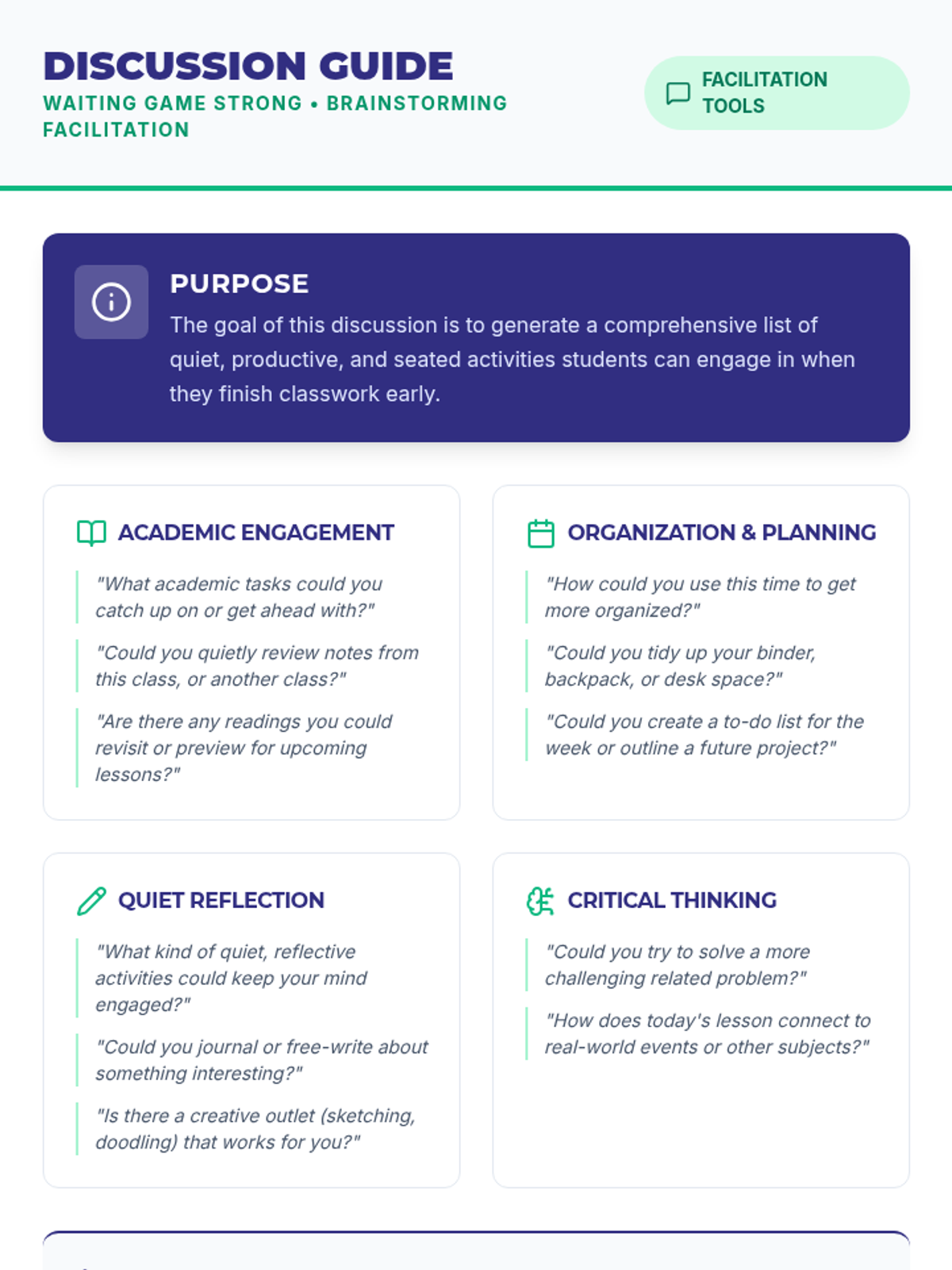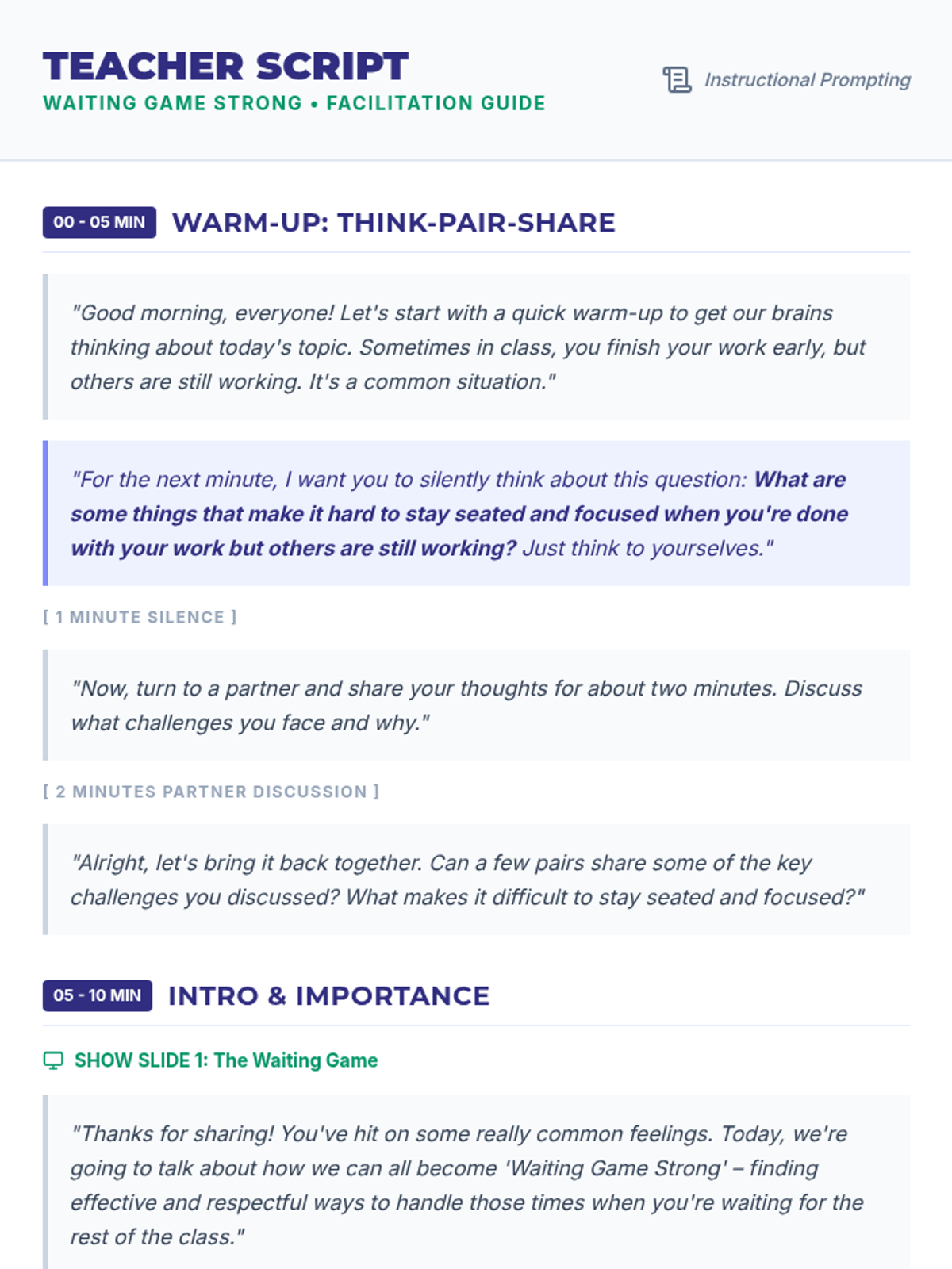 A 30-minute Tier 1 lesson for 12th-grade students to develop strategies for staying seated and engaged while waiting for classmates, promoting a focused and respectful classroom environment.
