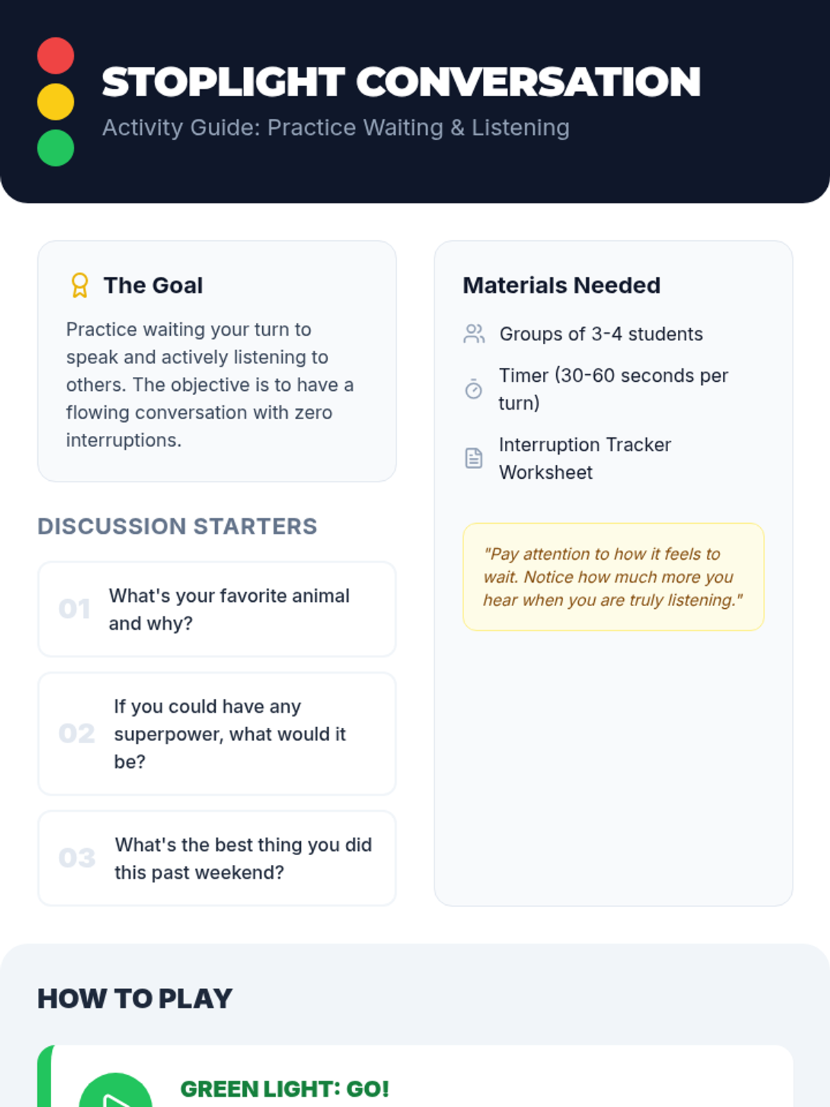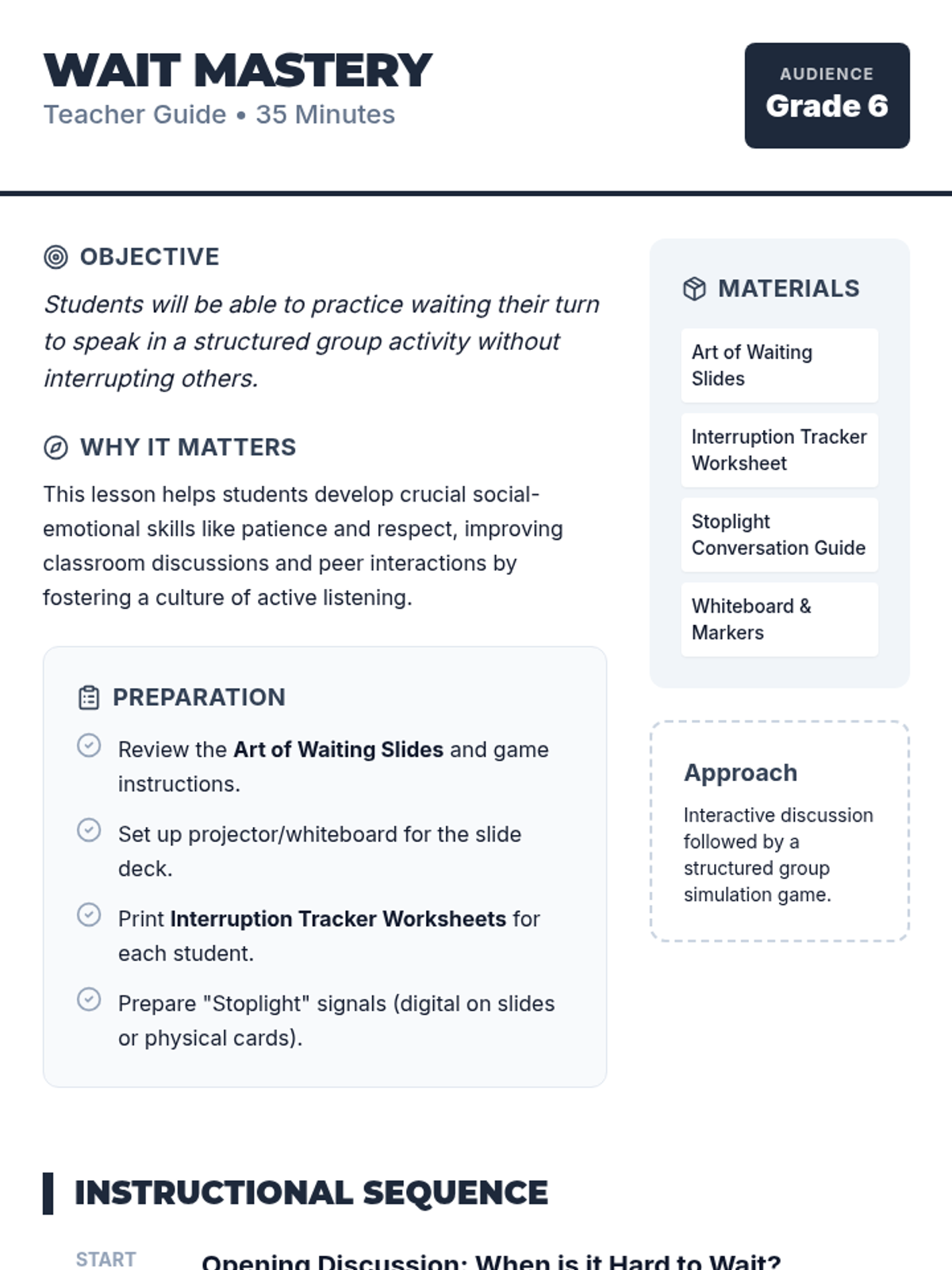 A 35-minute lesson for 6th graders focused on developing patience, active listening, and turn-taking skills through interactive discussion and a structured game.