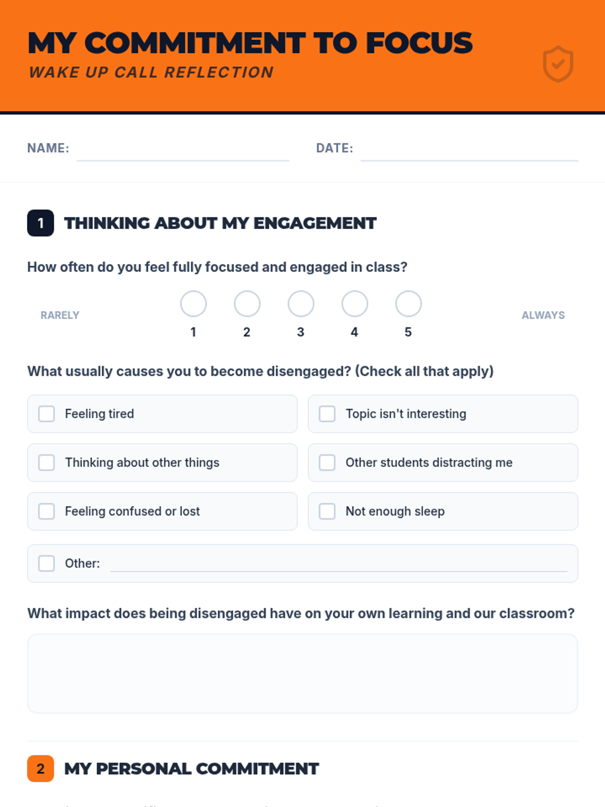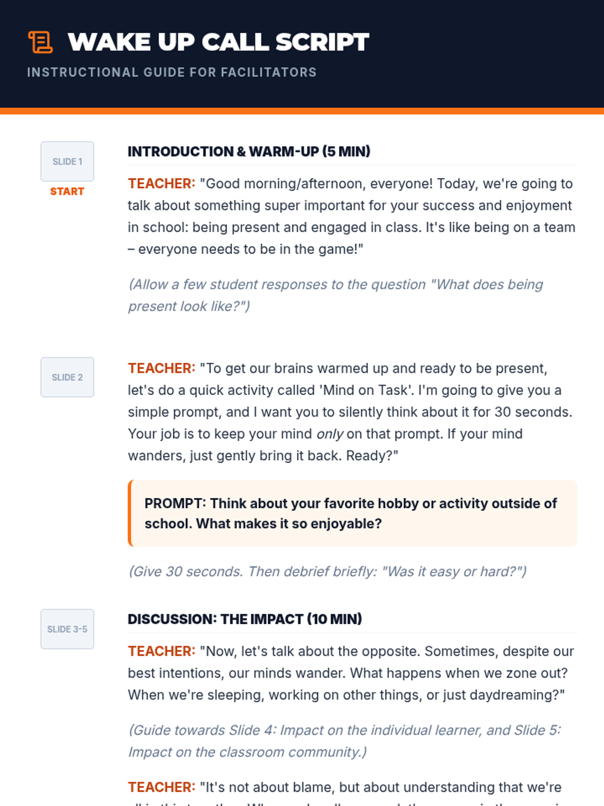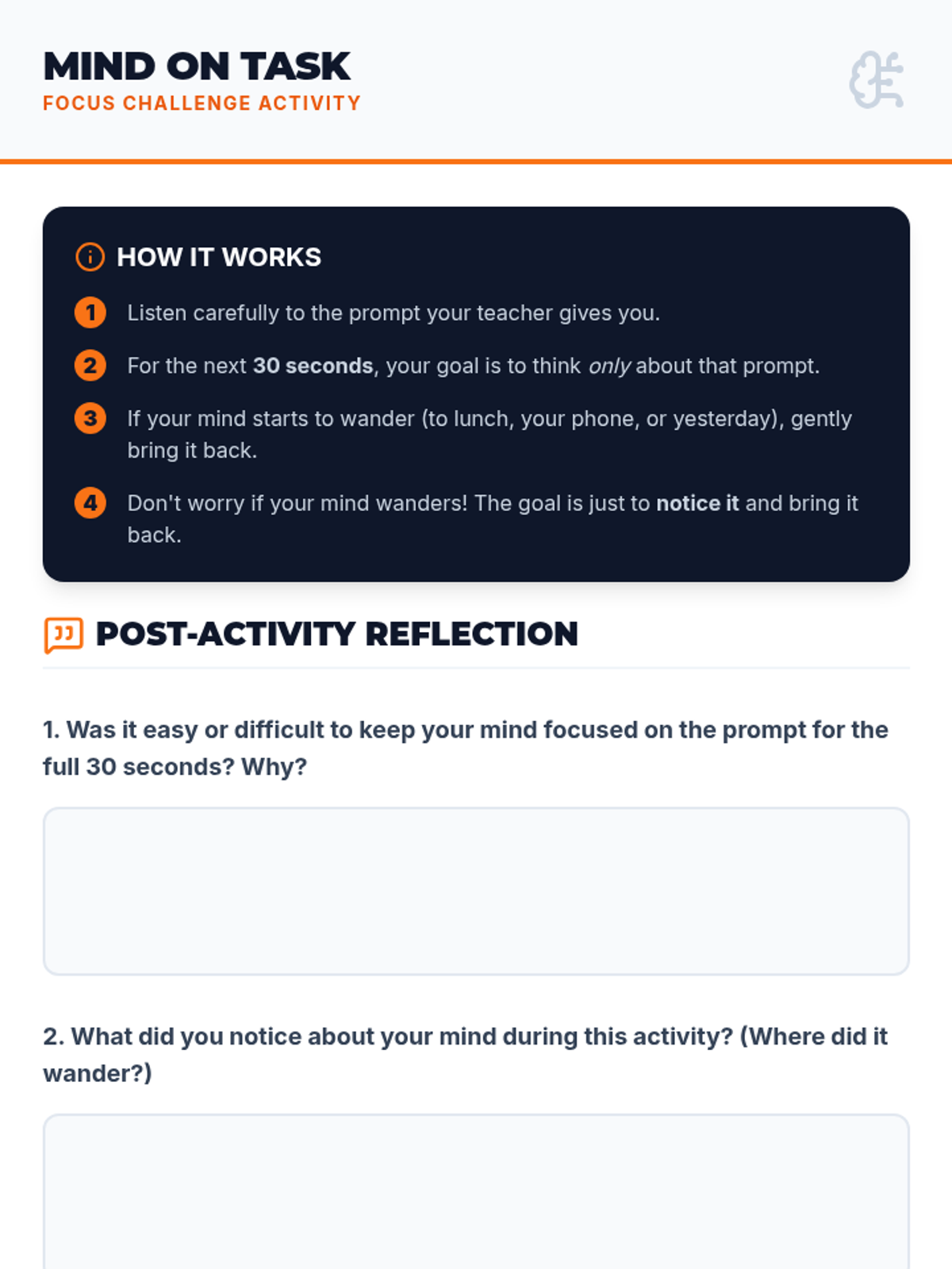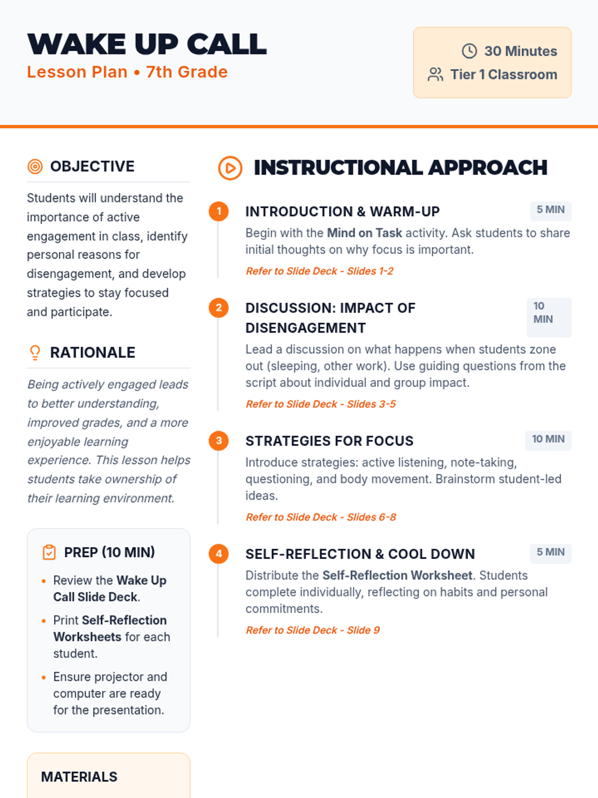 A 30-minute lesson for 7th graders focusing on classroom engagement, identifying distractions, and developing personal strategies for staying present and focused.