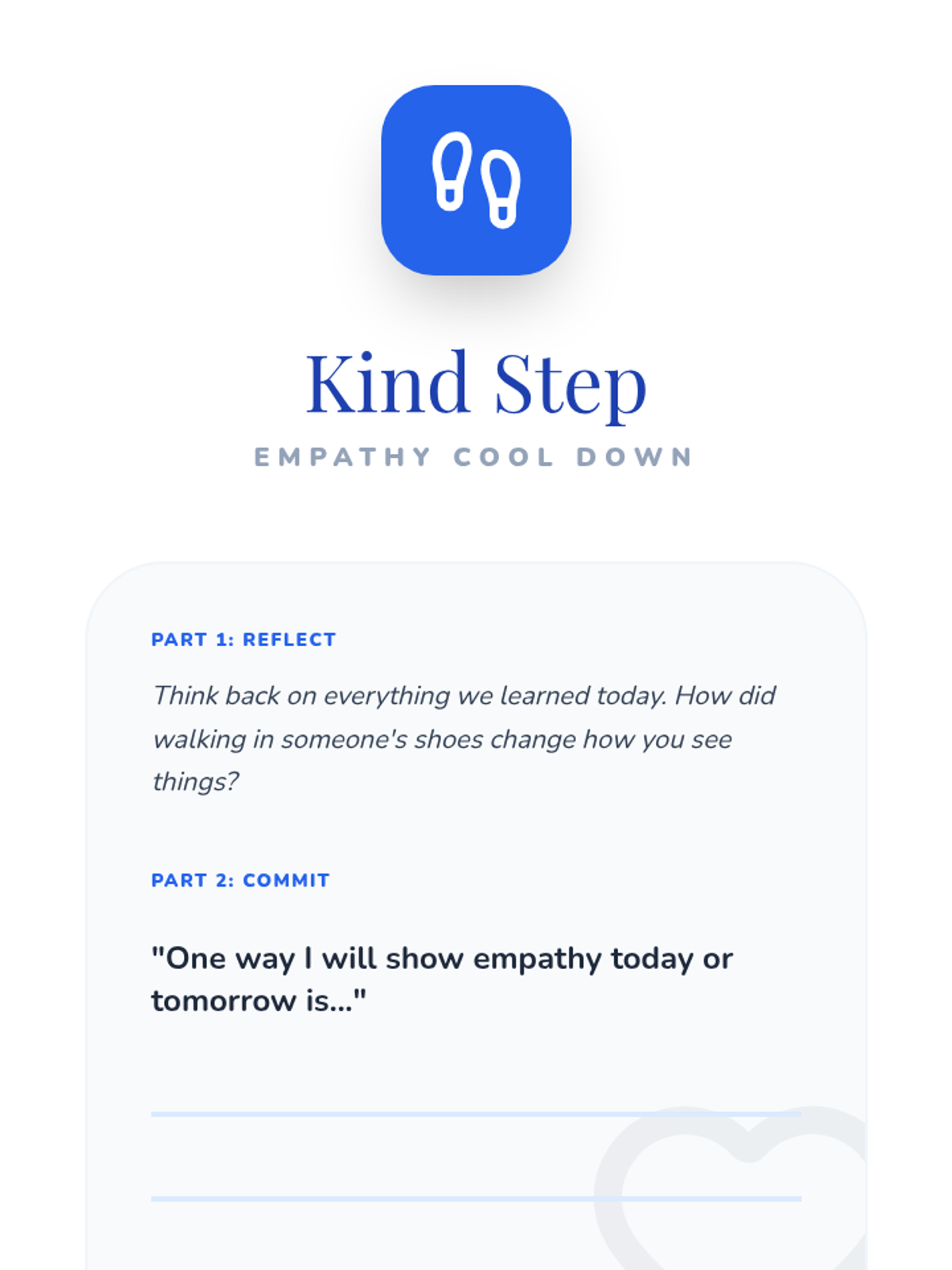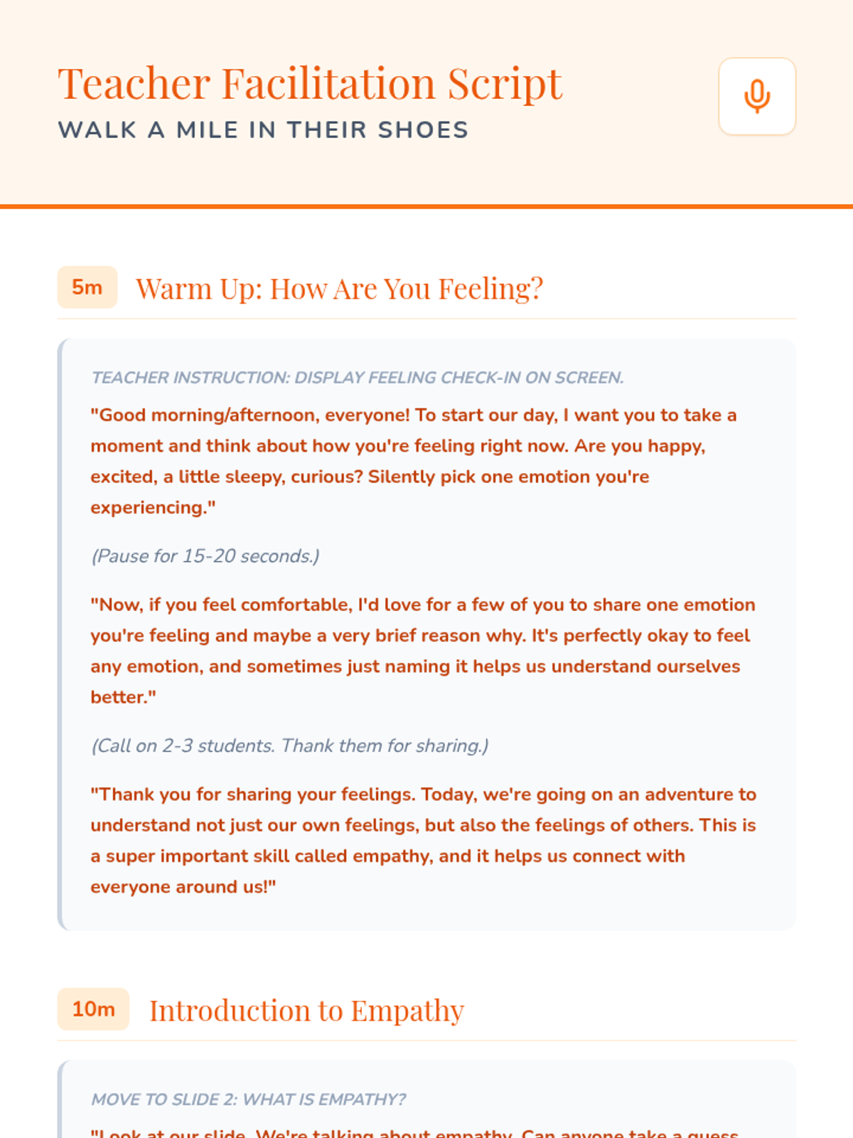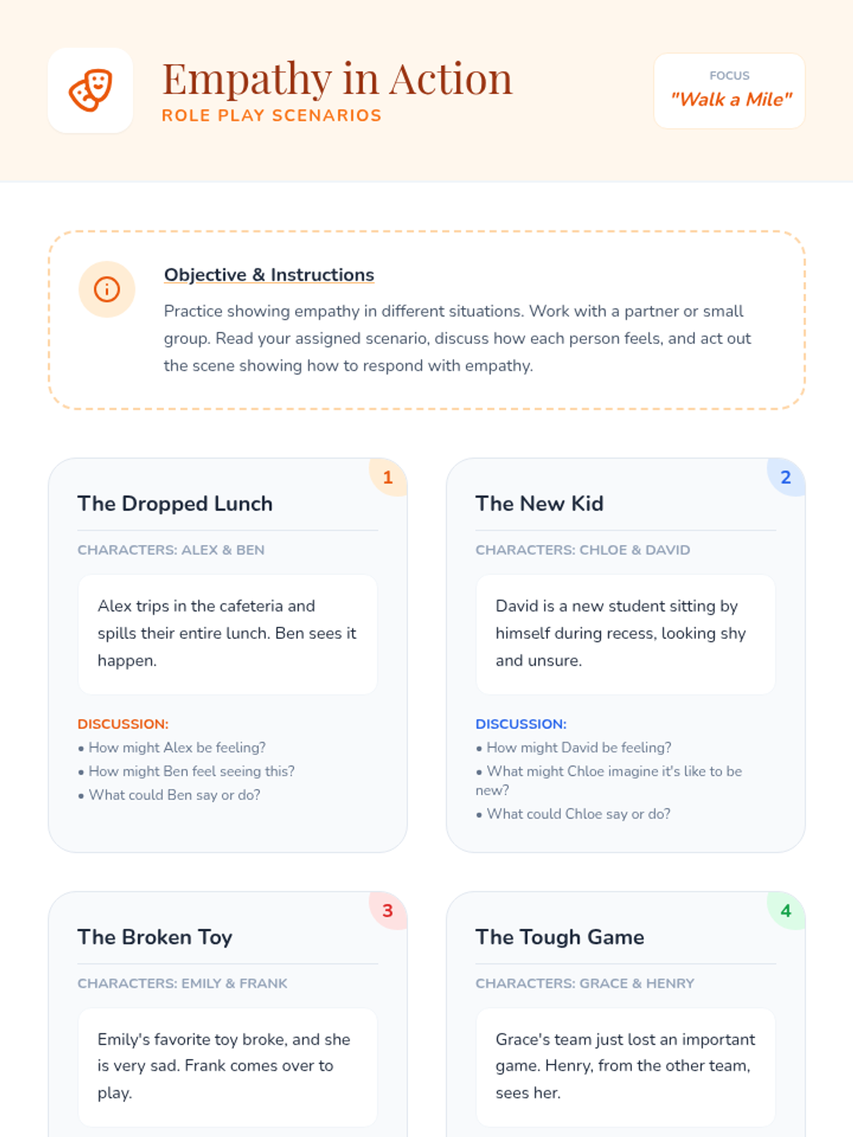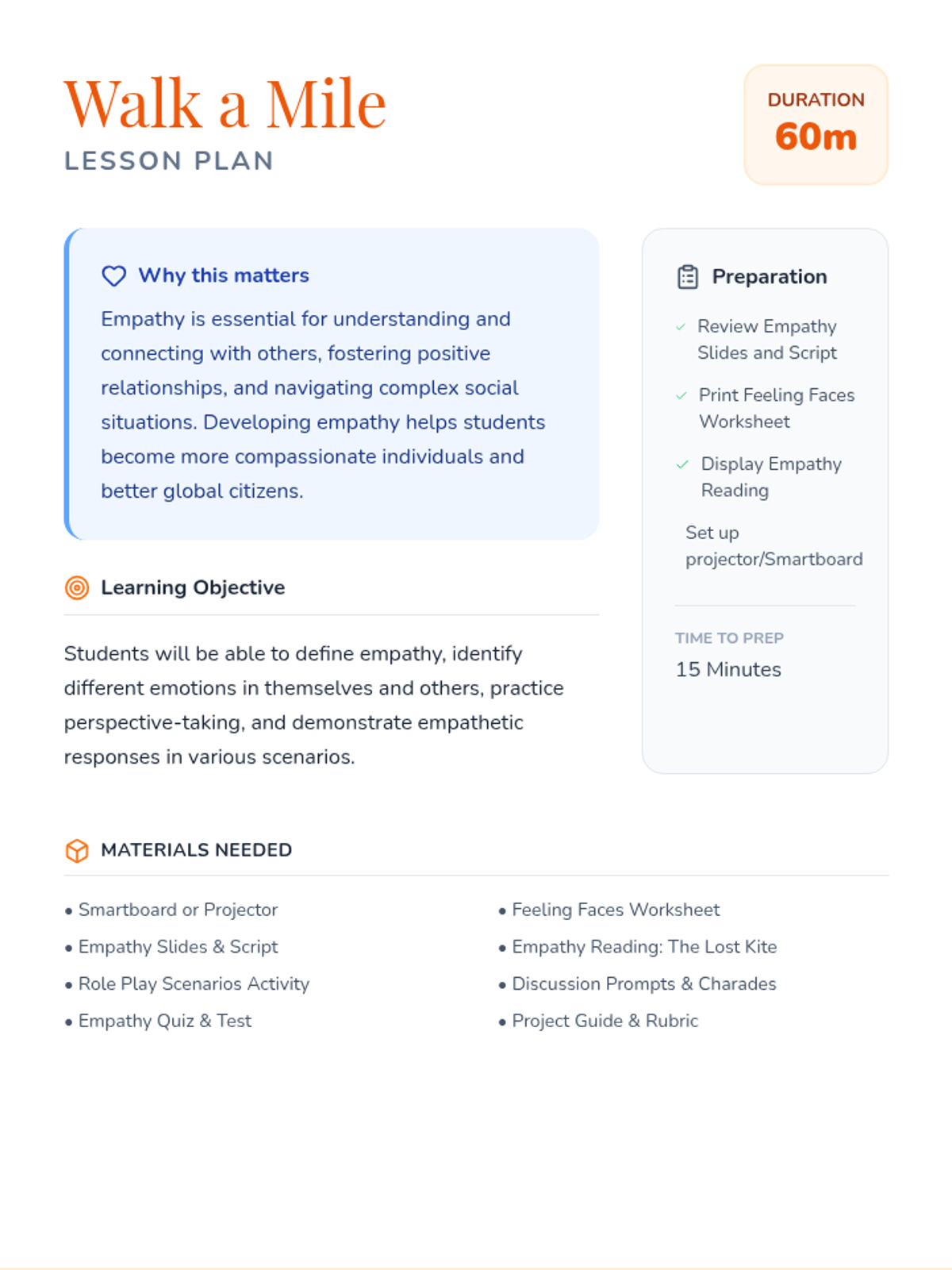 A one-hour lesson for K-12 students to develop empathy through perspective-taking, emotion recognition, and interactive activities. Students will learn to 'walk a mile' in others' shoes to build stronger, kinder relationships.