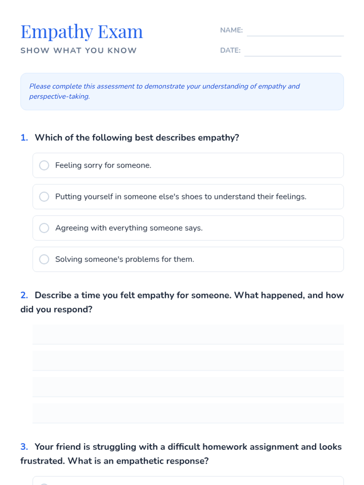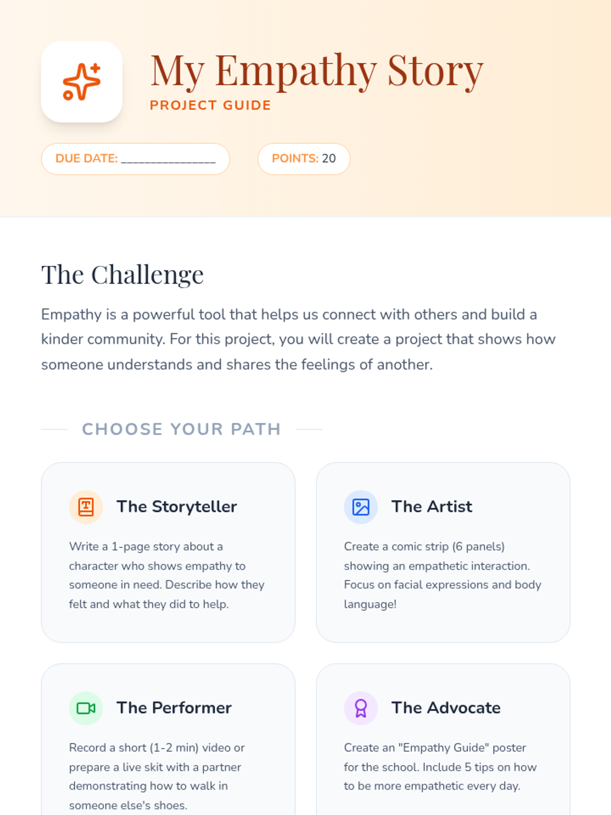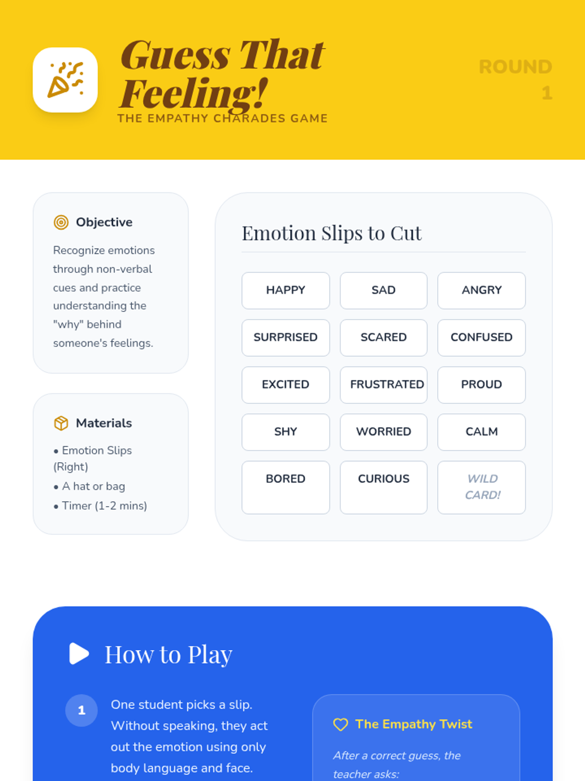 A one-hour lesson for K-12 students to develop empathy through perspective-taking, emotion recognition, and interactive activities. Students will learn to 'walk a mile' in others' shoes to build stronger, kinder relationships.
