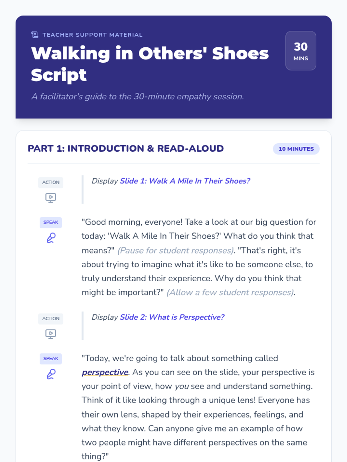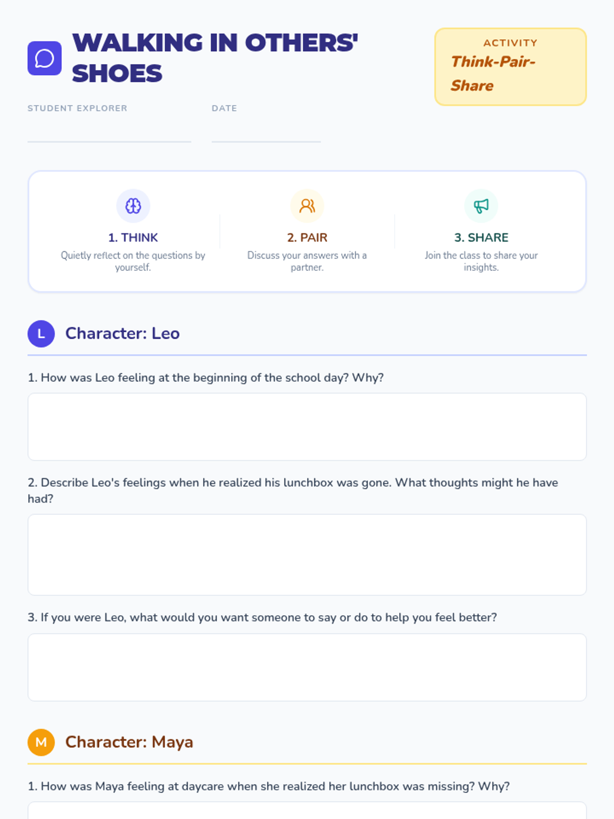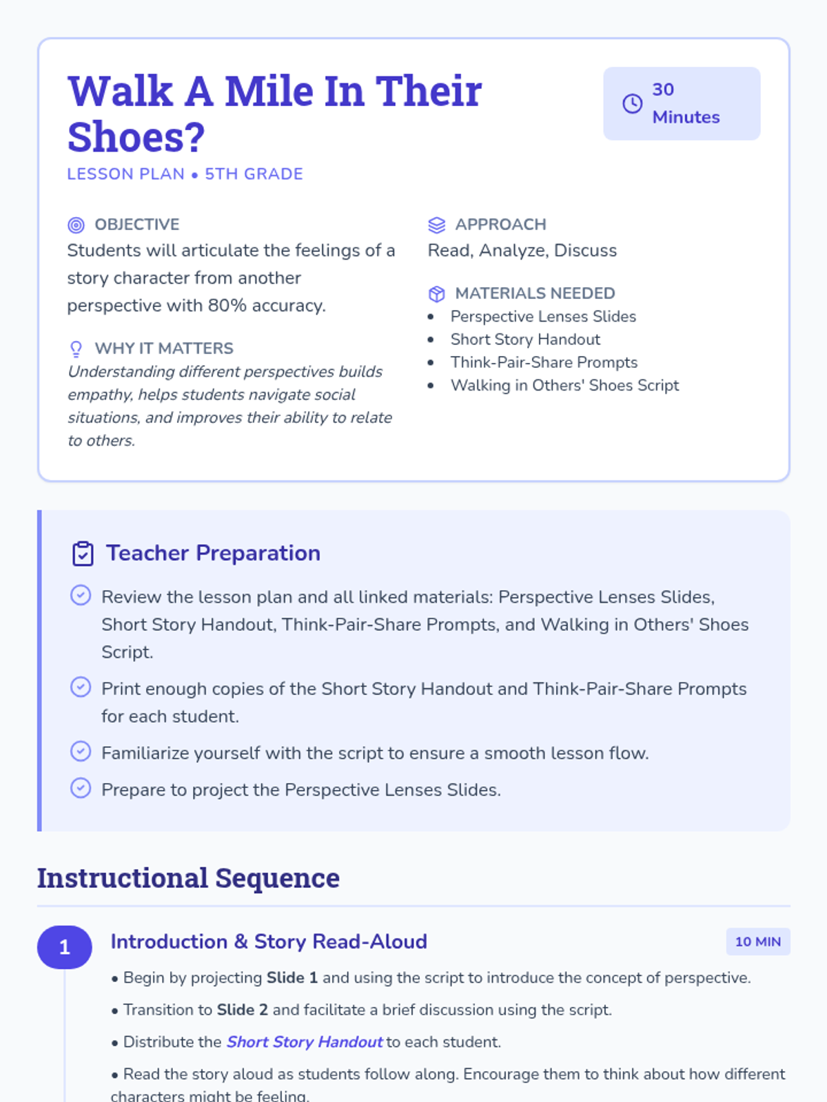 This 30-minute lesson helps 5th-grade students understand empathy and perspective-taking by analyzing character feelings in a short story. Students will articulate feelings from different perspectives, fostering emotional intelligence and social awareness.