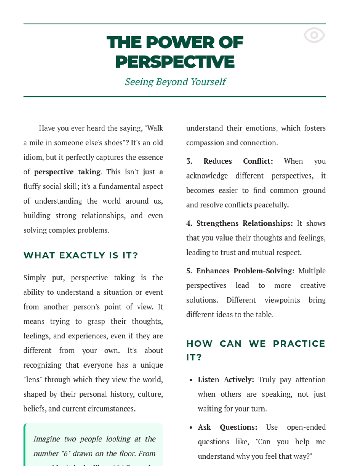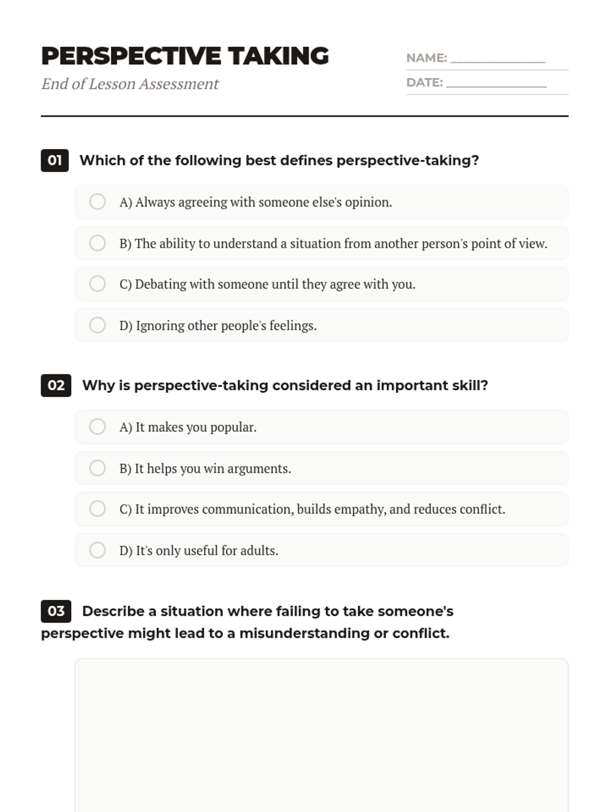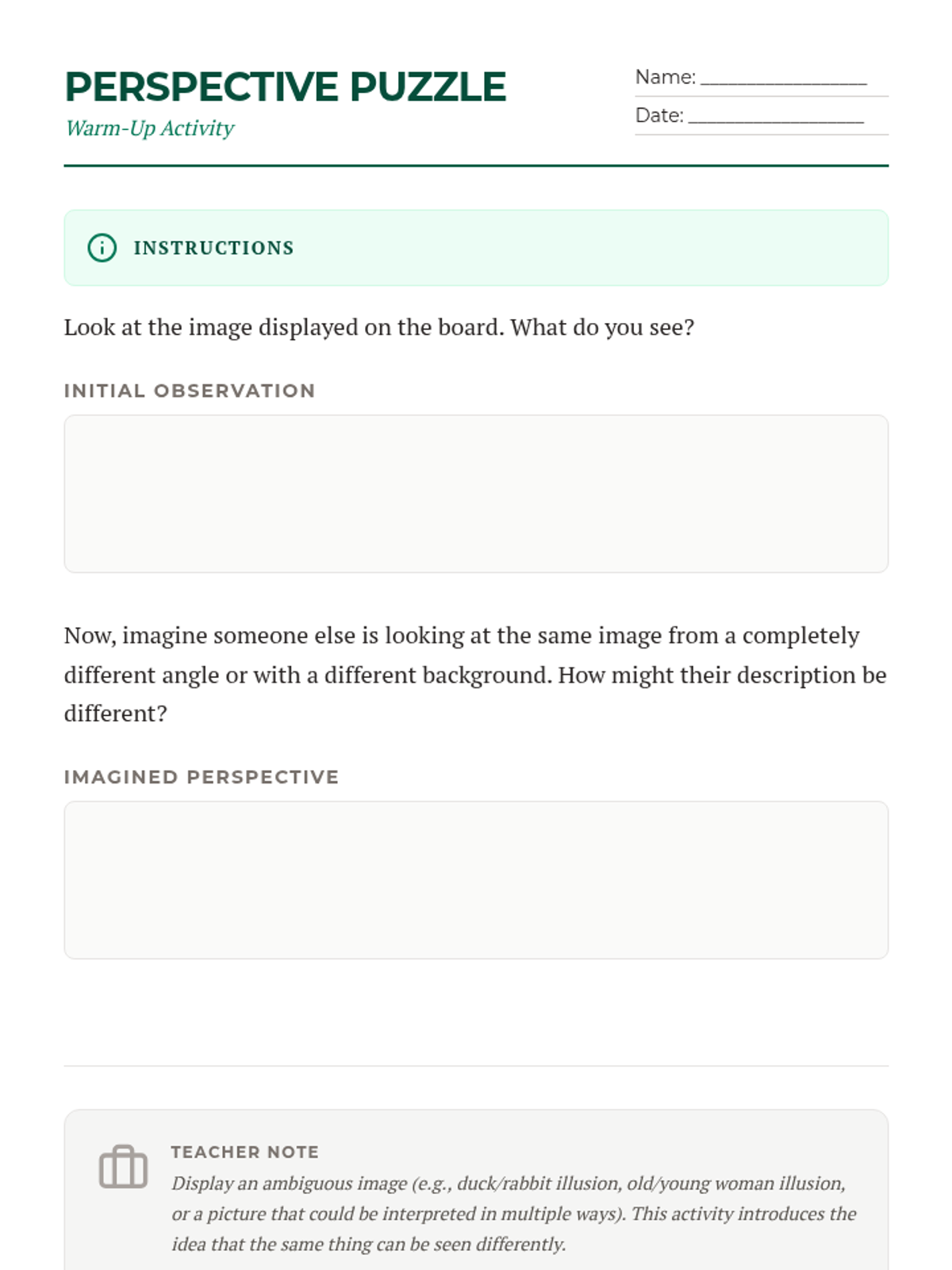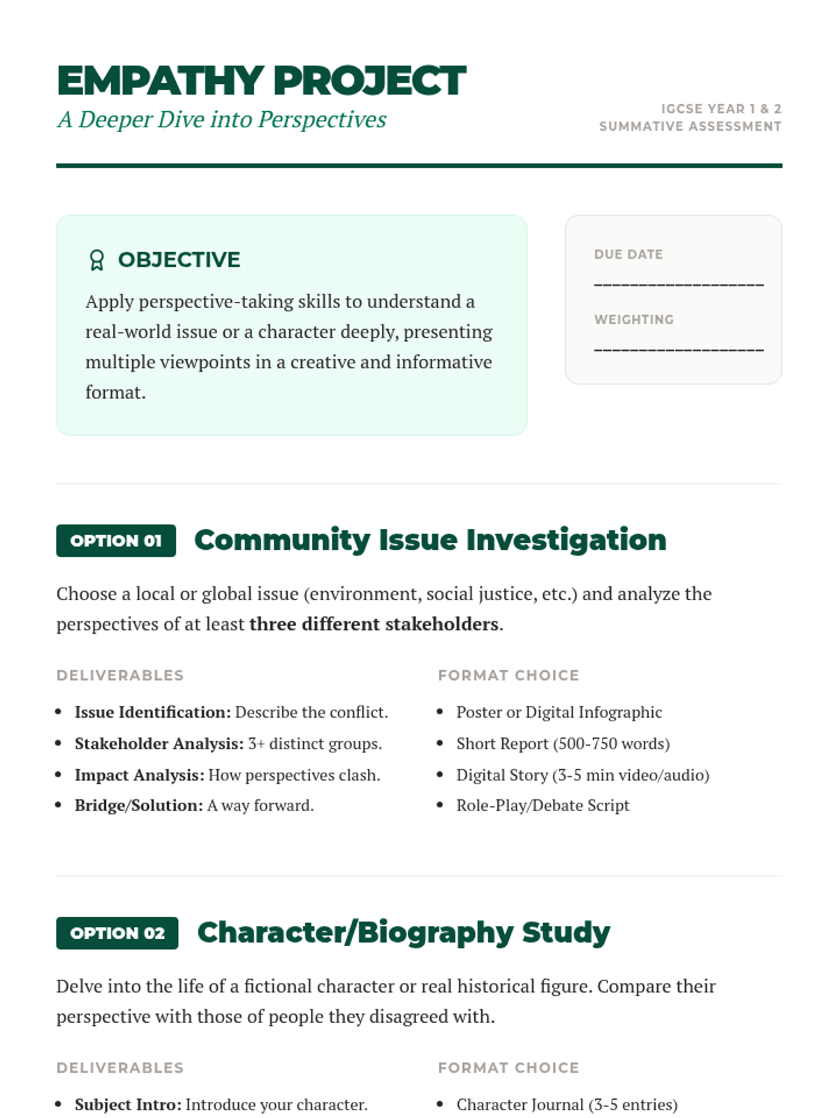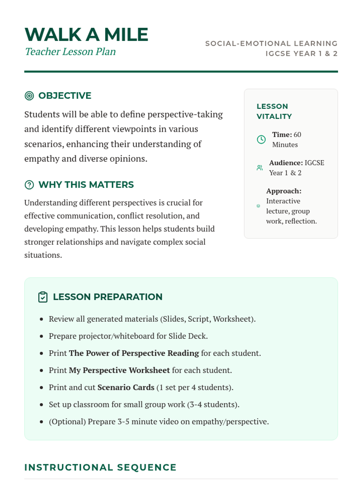 A comprehensive 60-minute lesson for IGCSE students focused on developing empathy and understanding diverse viewpoints through interactive activities, reflection, and discussion.