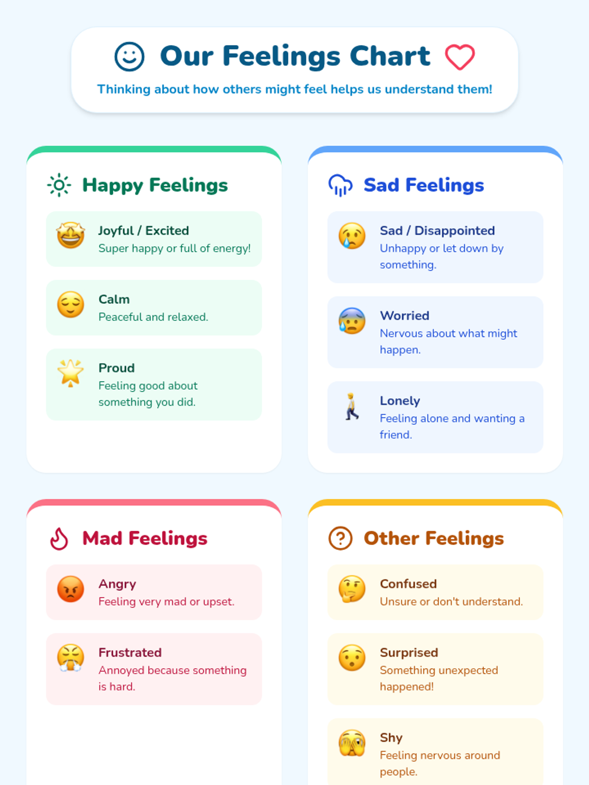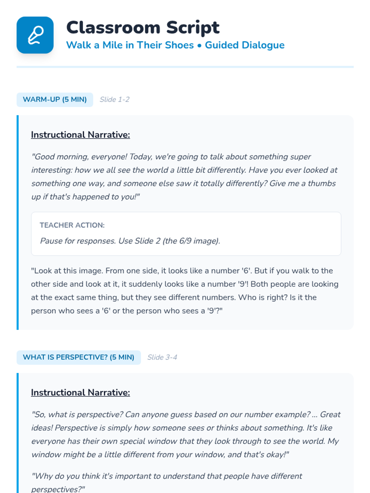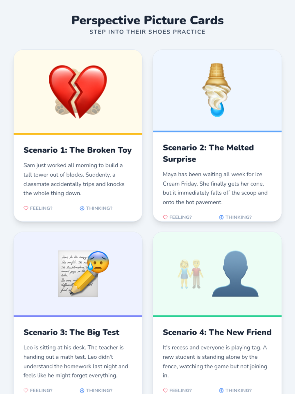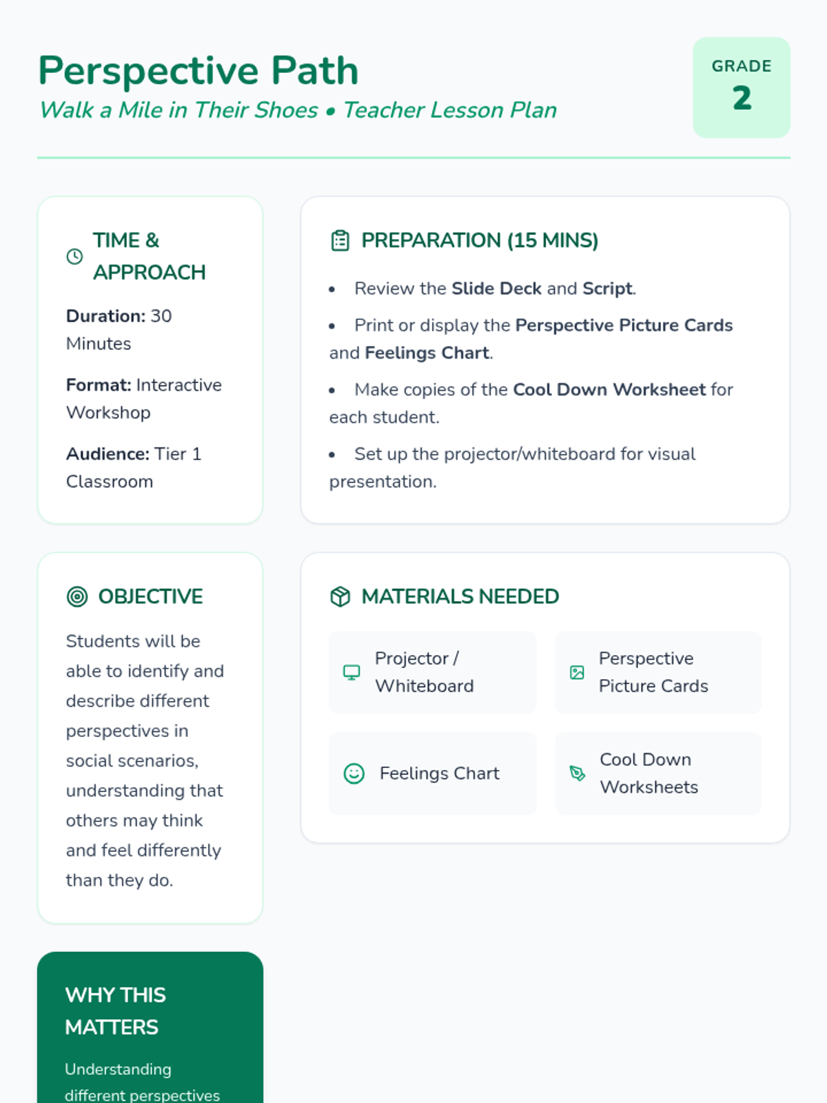 A 30-minute social-emotional learning lesson for 2nd graders to develop empathy and understanding of diverse perspectives through interactive discussion and visual aids.