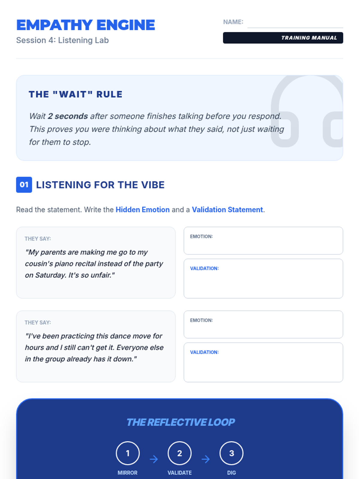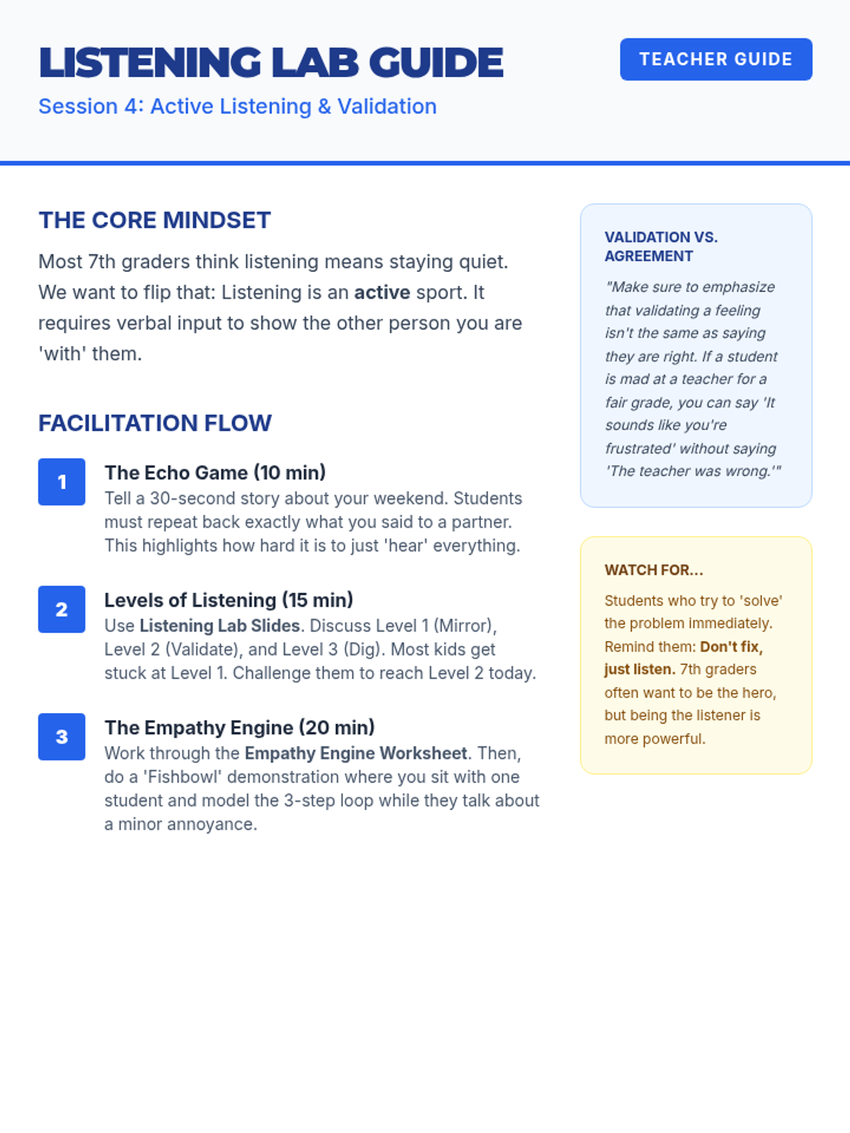Students practice active listening techniques, moving beyond passive hearing to demonstrate empathy and validation in their social interactions.