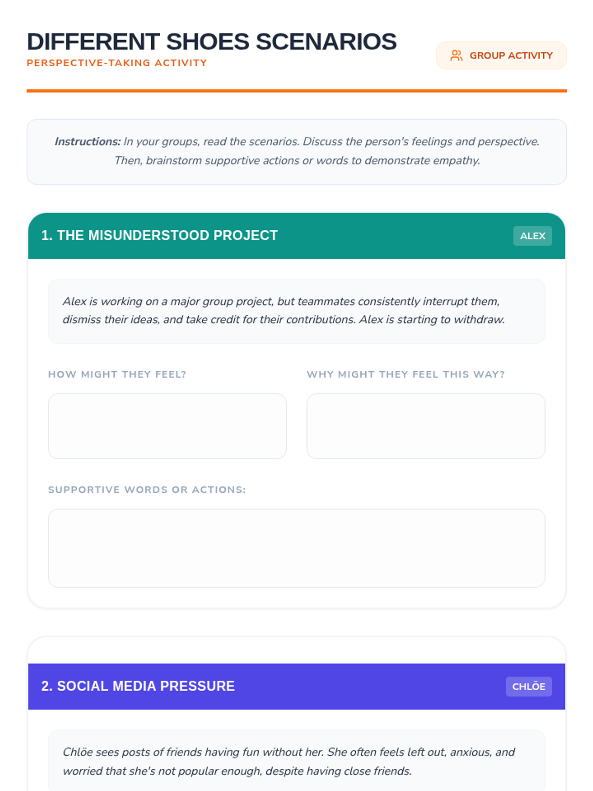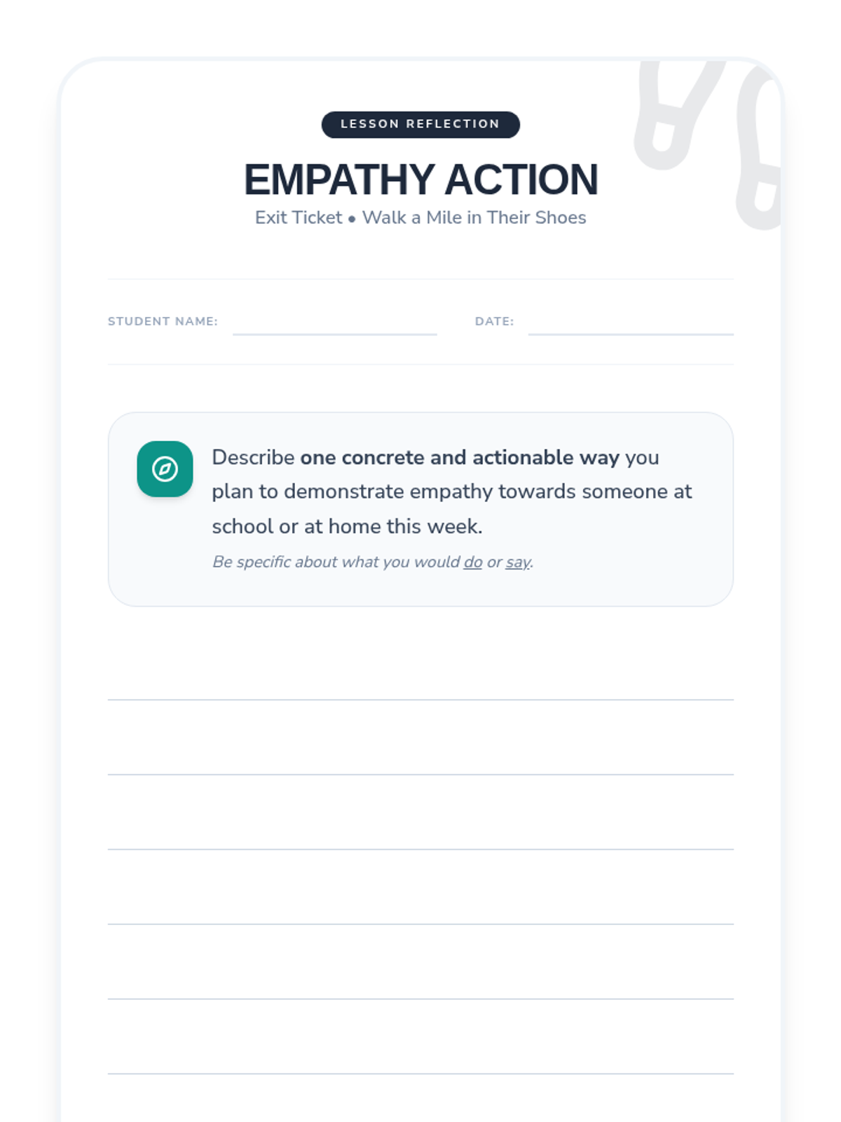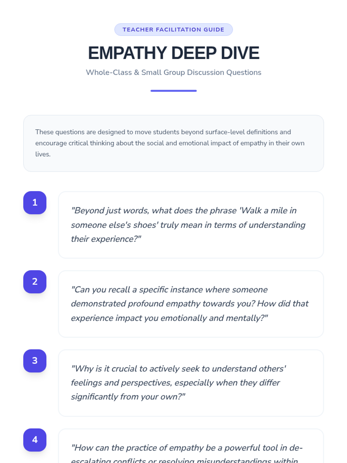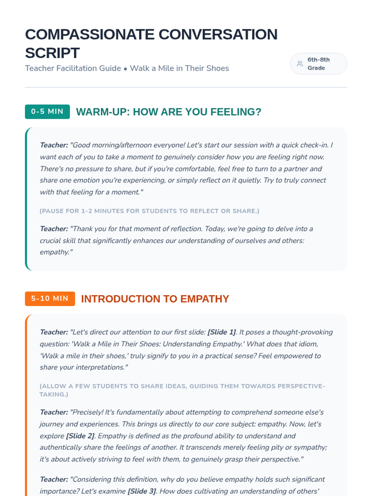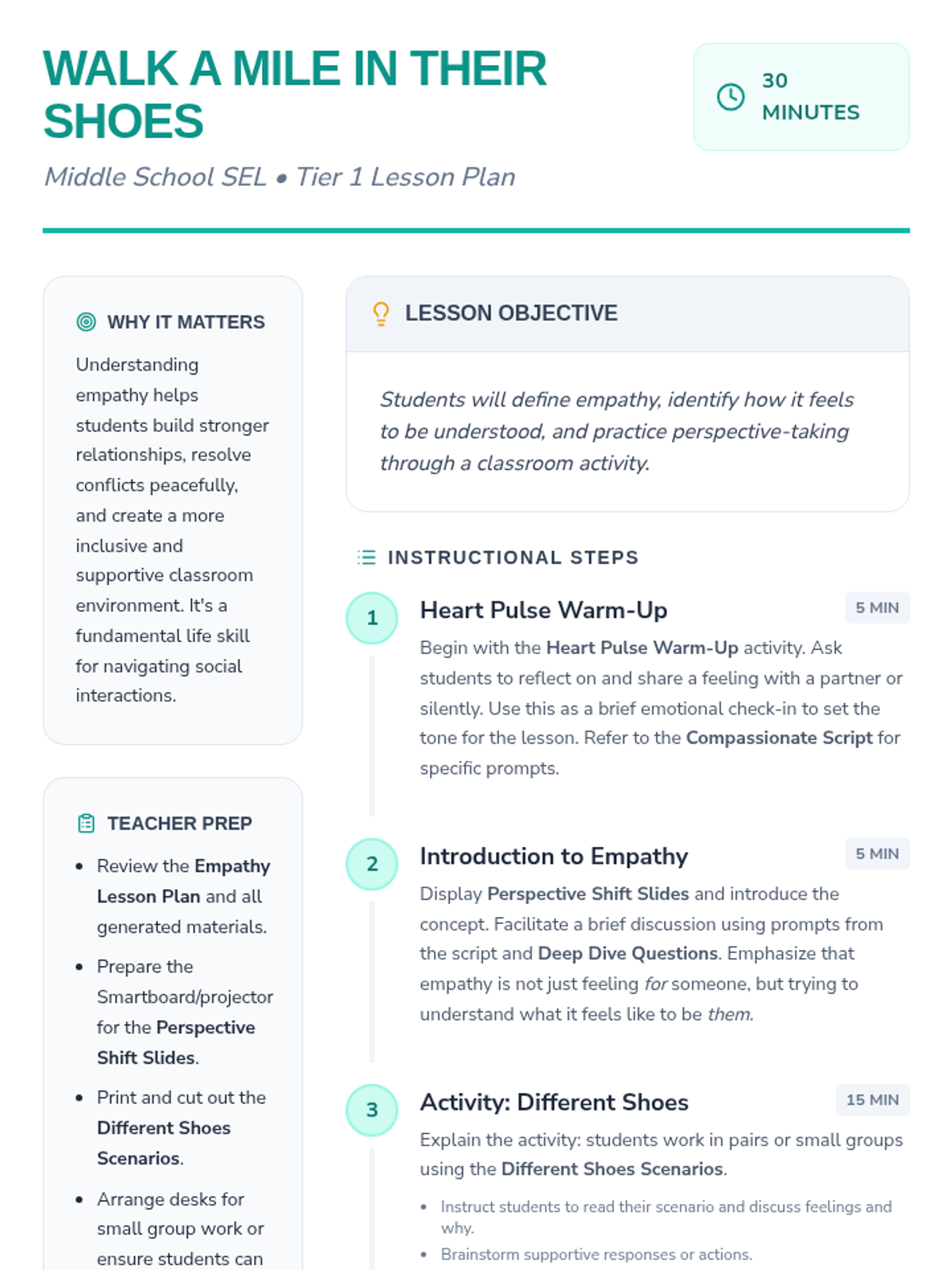 A 30-minute Tier 1 SEL lesson for middle school students to explore empathy through perspective-taking and real-world scenarios. Students will define empathy, reflect on their own emotions, and practice supportive responses.