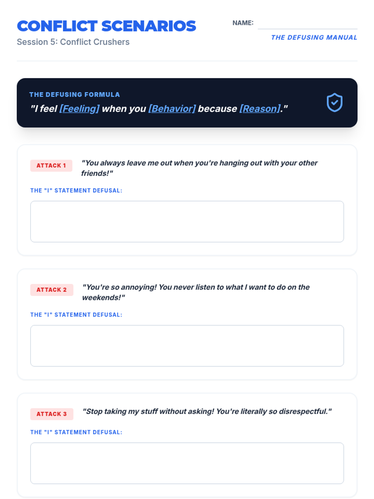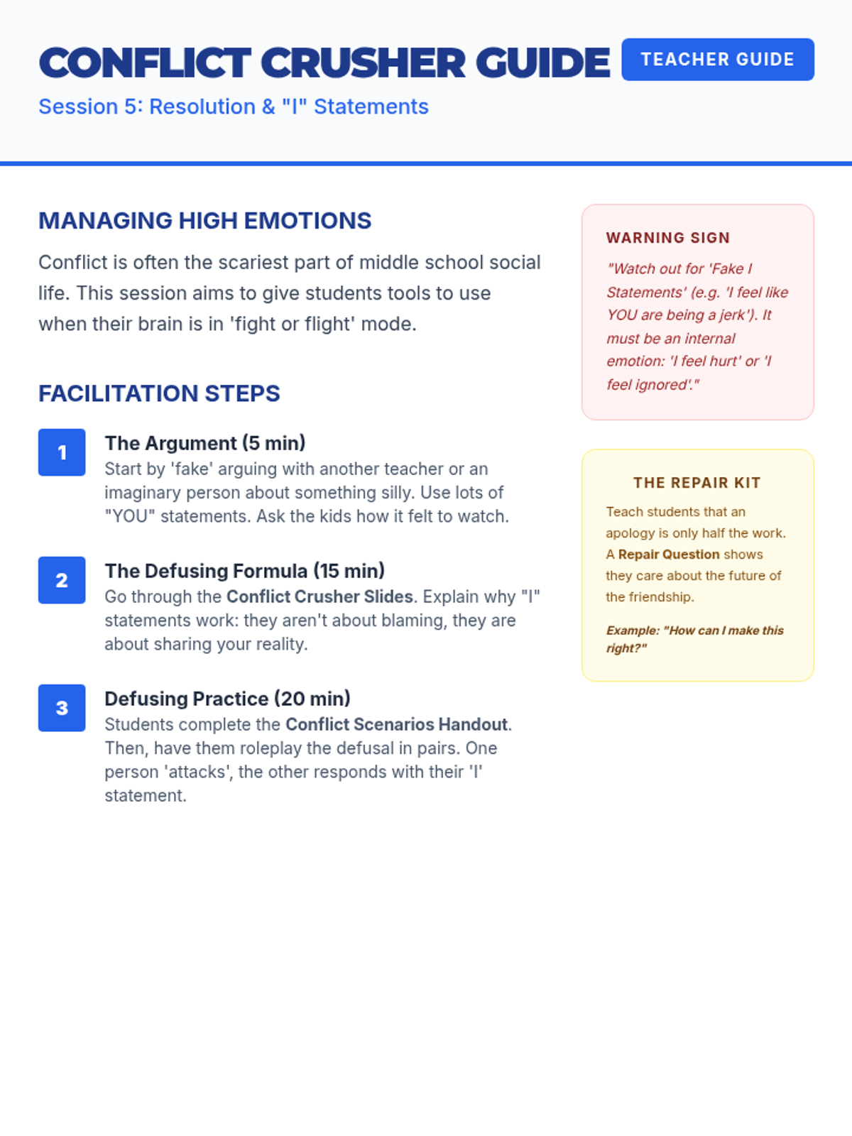 Focuses on healthy conflict resolution. Students learn to use 'I' statements and de-escalation techniques to handle disagreements without damaging friendships.