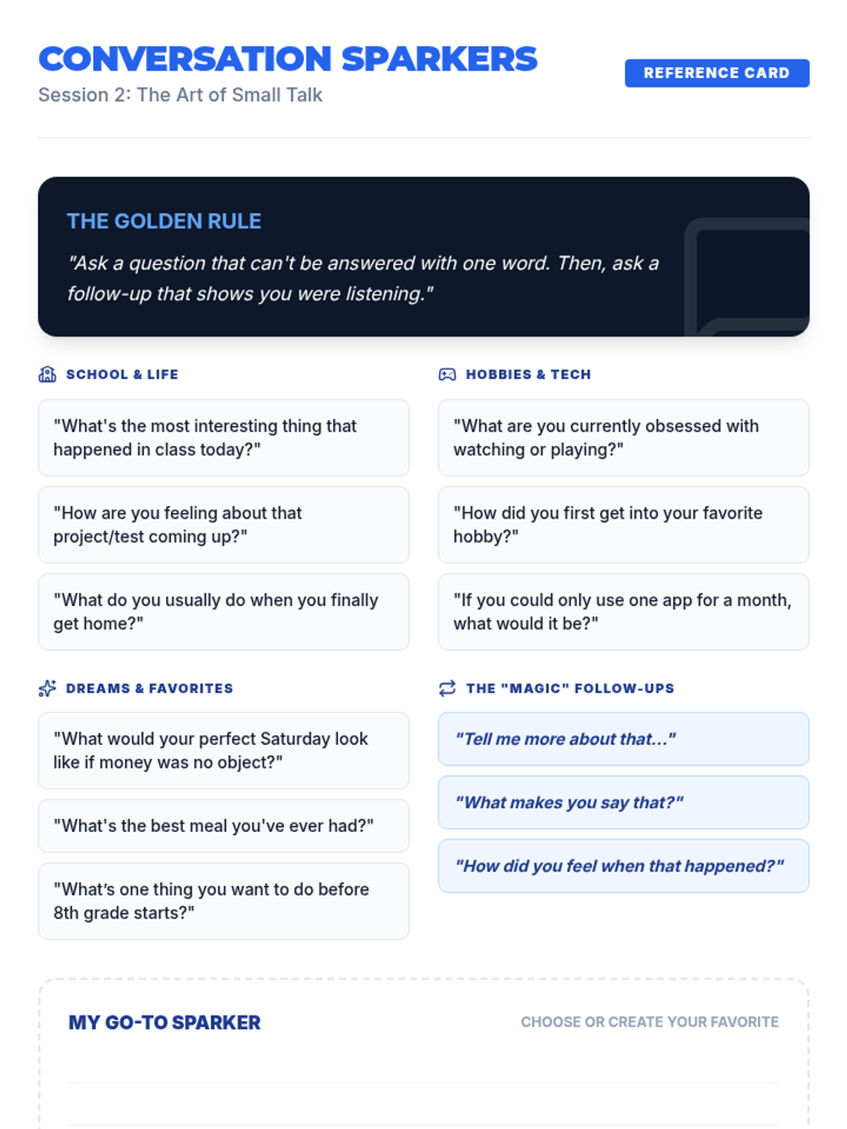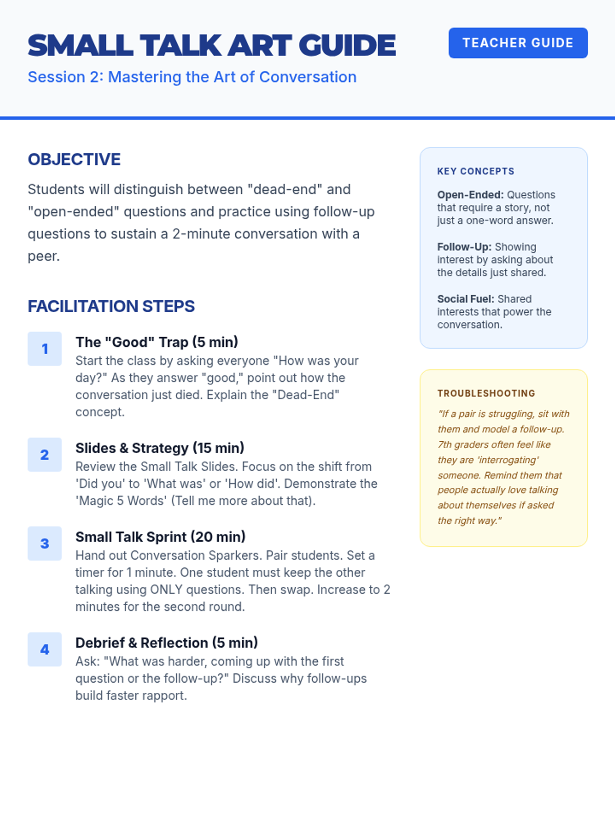Students learn the mechanics of starting and sustaining conversations, focusing on the power of follow-up questions to build rapport and demonstrate genuine interest.