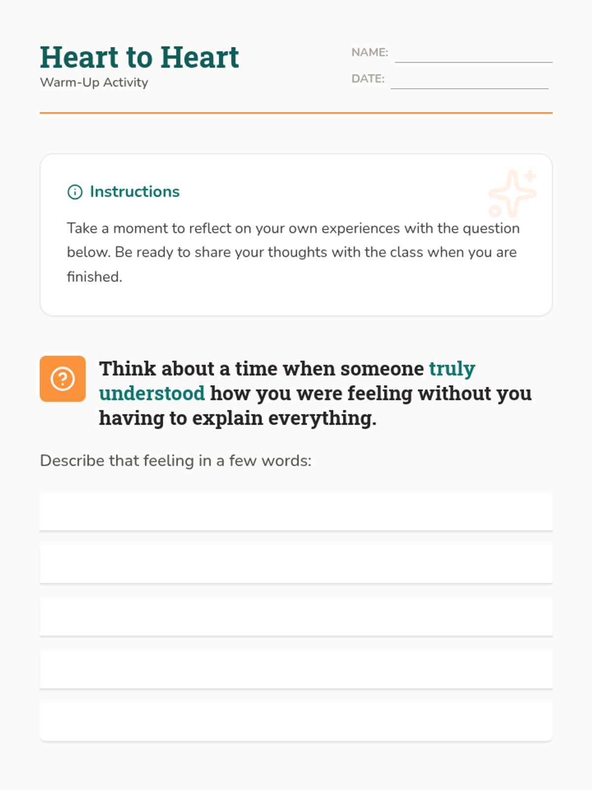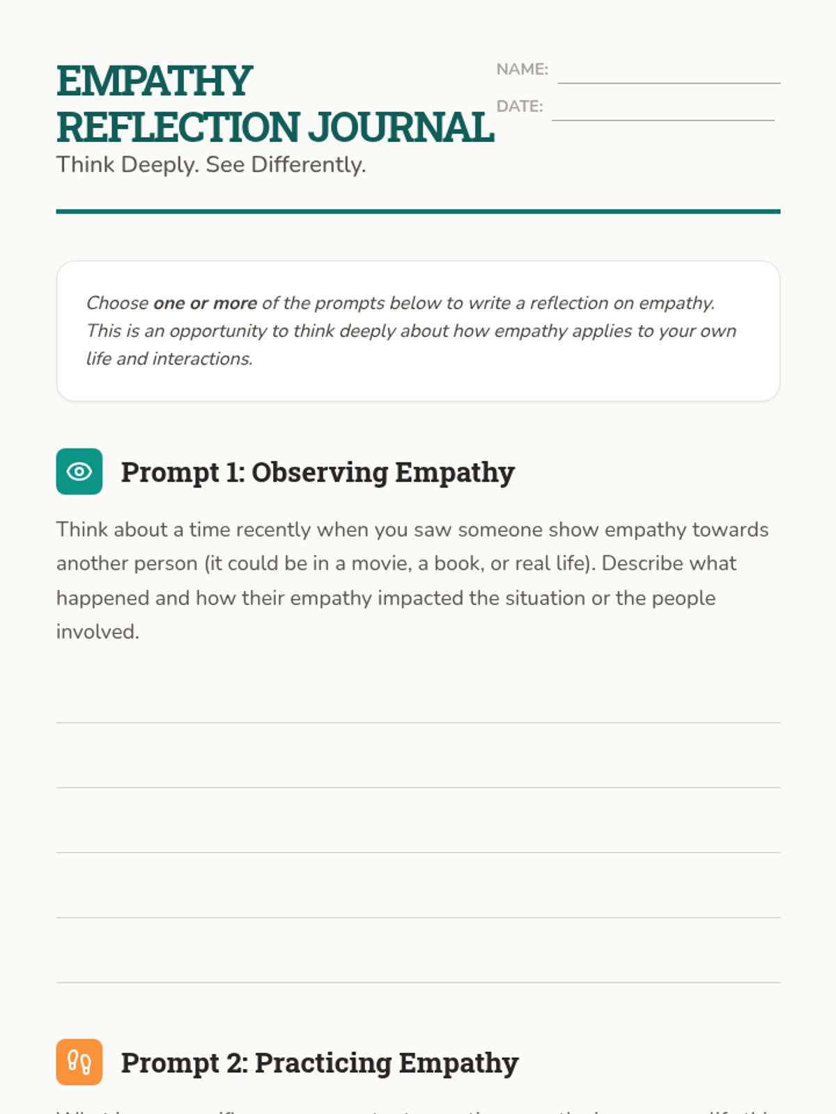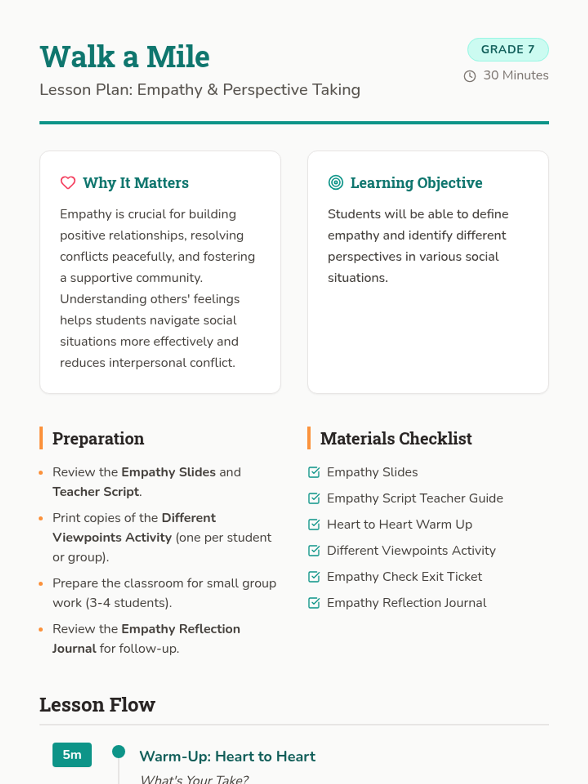 A 30-minute introductory lesson for 7th-grade students exploring the concept of empathy through perspective-taking scenarios and reflective discussion. Students will learn to distinguish empathy from sympathy and practice understanding the 'why' behind others' emotions.