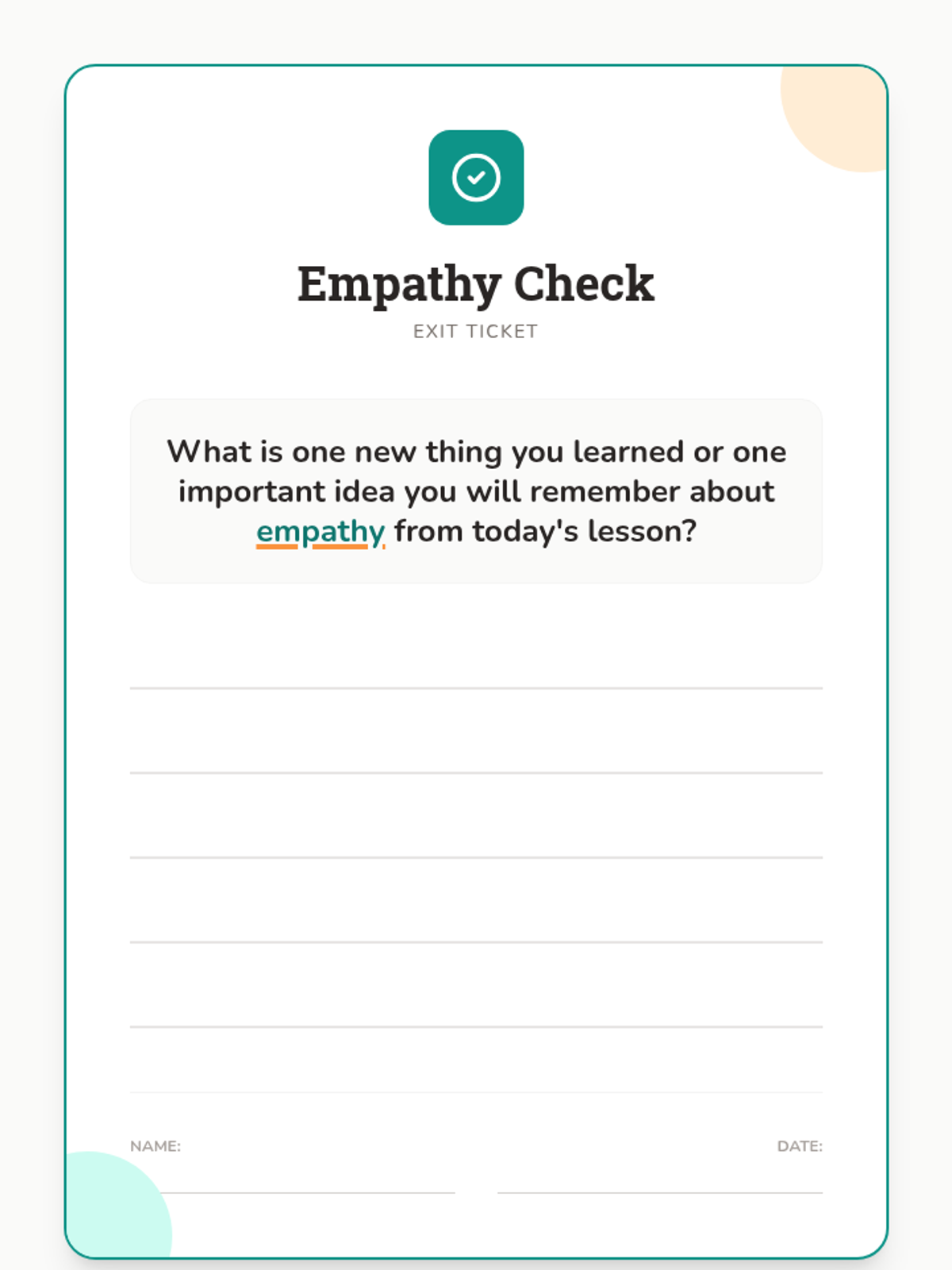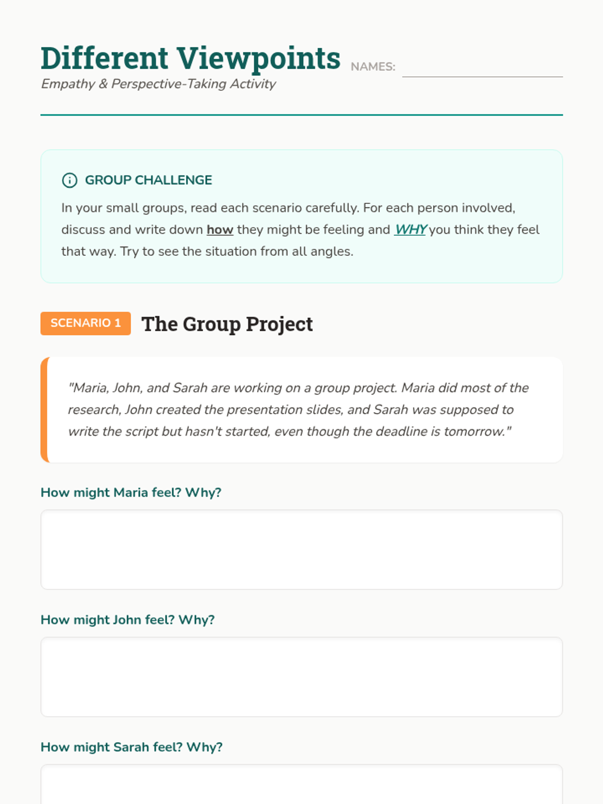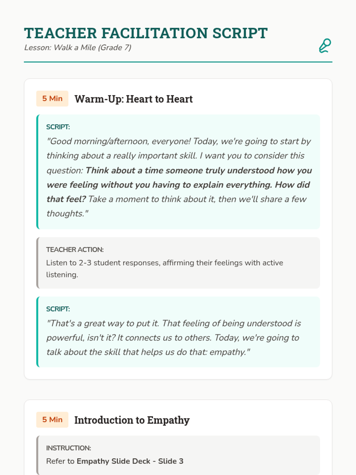 A 30-minute introductory lesson for 7th-grade students exploring the concept of empathy through perspective-taking scenarios and reflective discussion. Students will learn to distinguish empathy from sympathy and practice understanding the 'why' behind others' emotions.