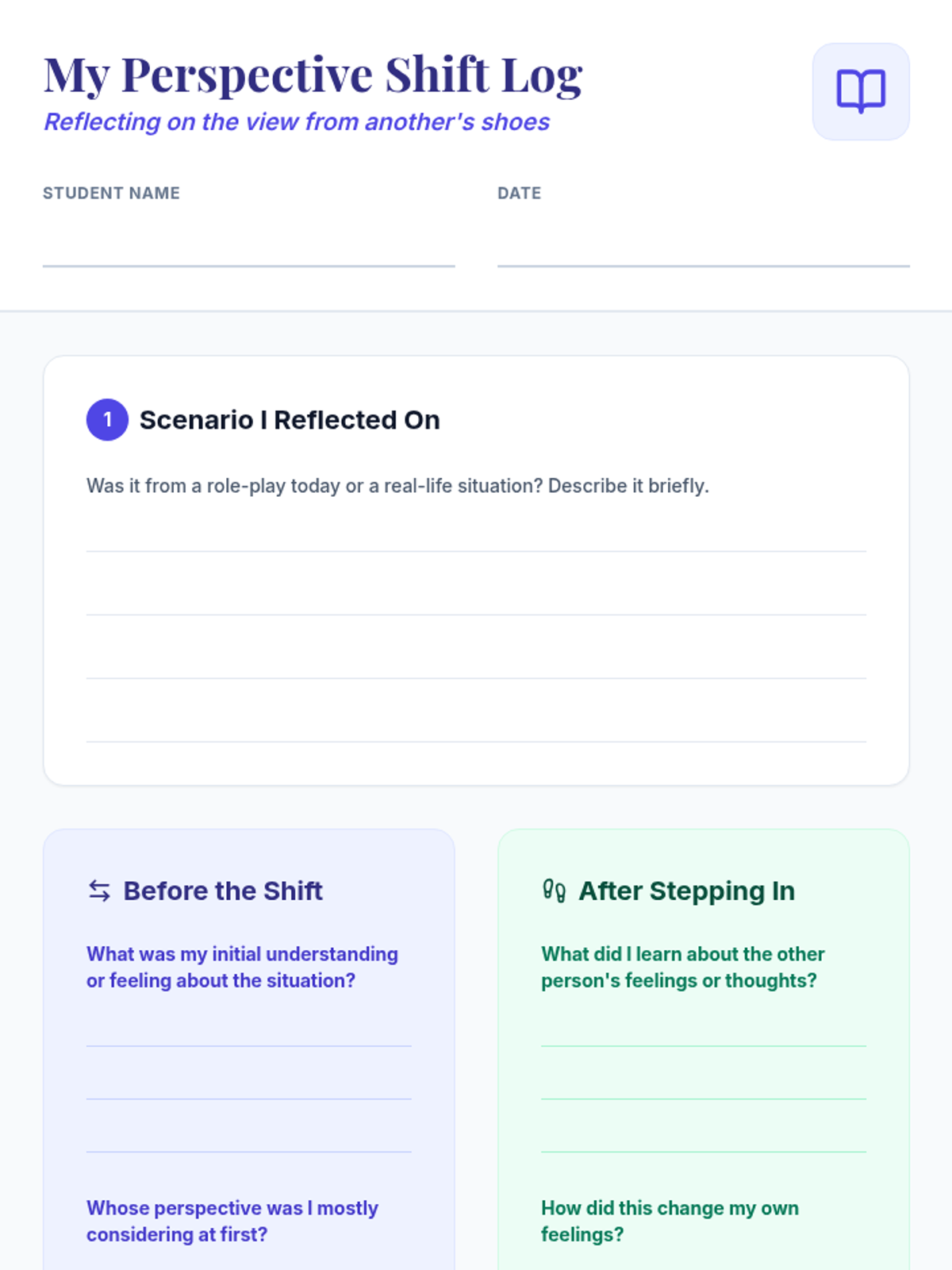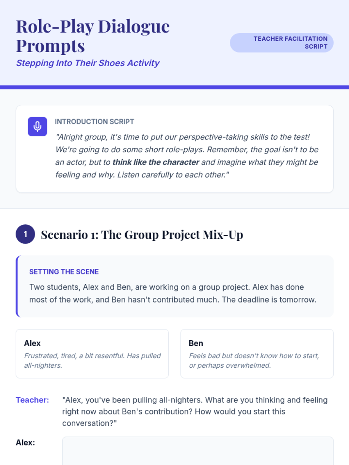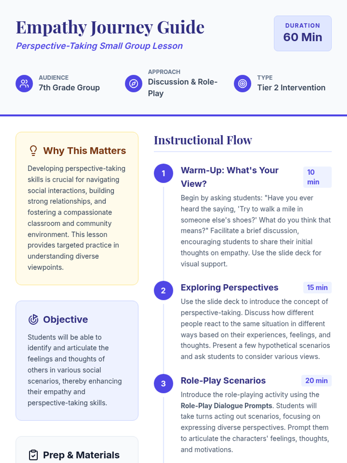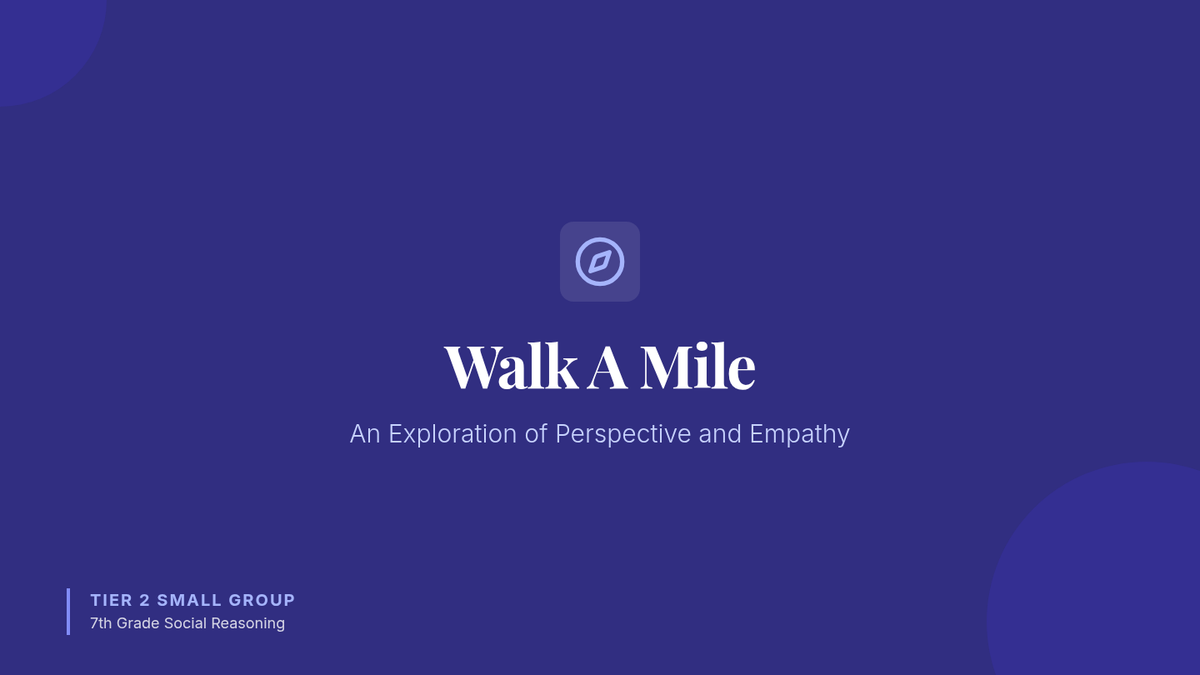 A 60-minute Tier 2 small group lesson for 7th graders focused on developing empathy and perspective-taking through guided discussion and role-play. Students explore how different people experience the same events through various lenses.