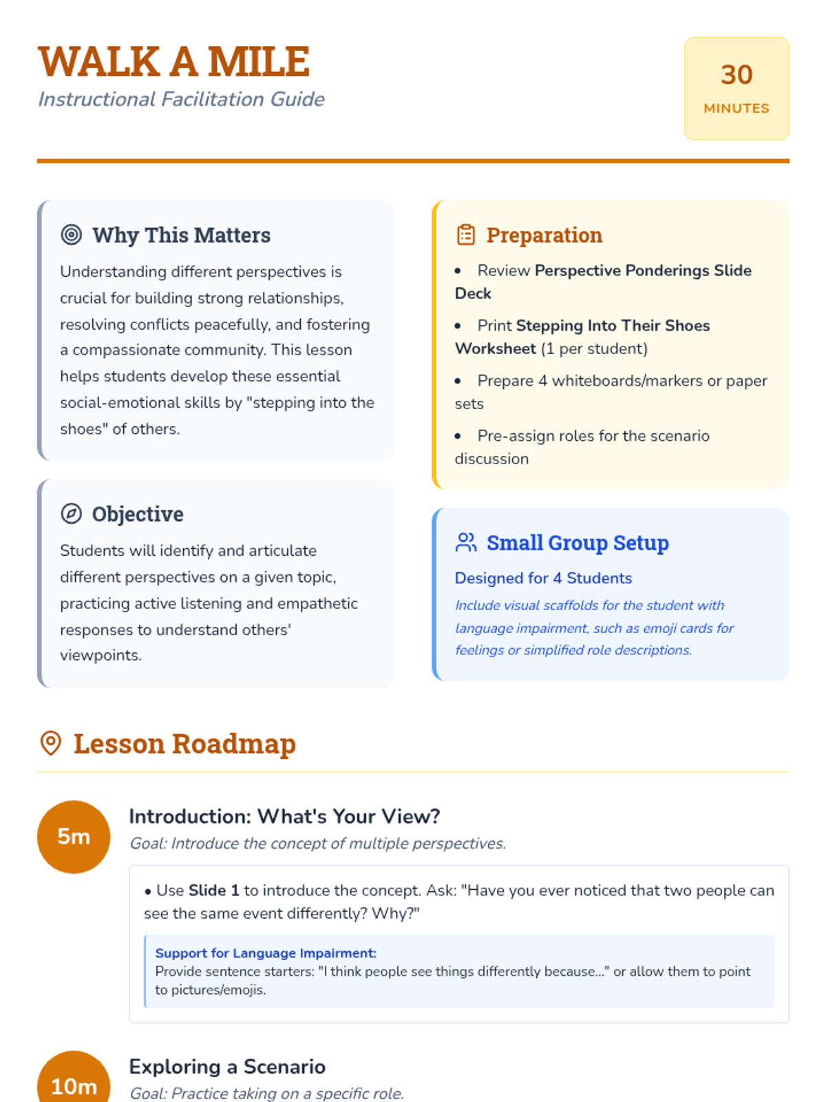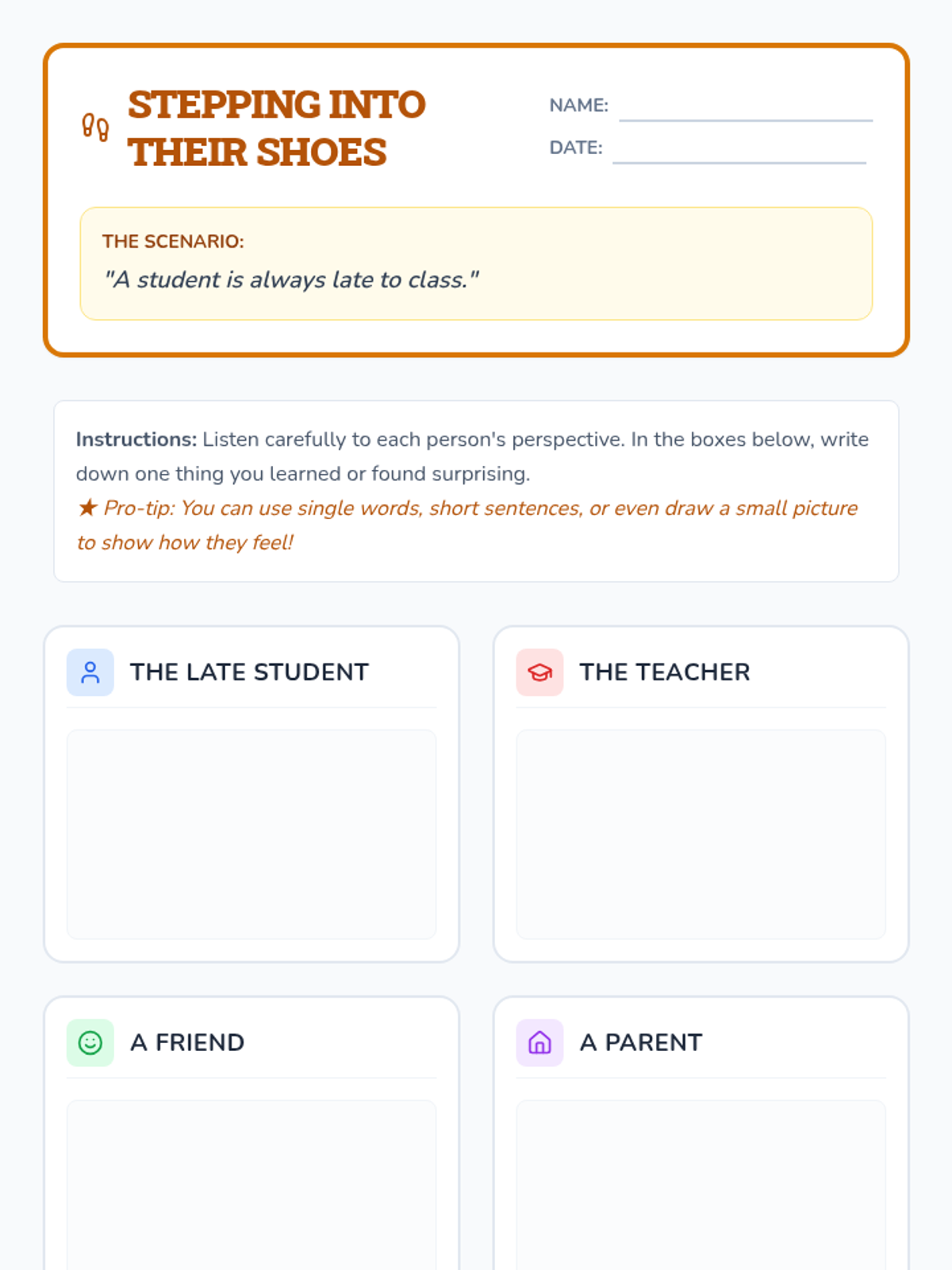 A 30-minute small-group lesson for 7th graders focused on developing empathy by exploring diverse perspectives through a relatable scenario about a student who is always late.