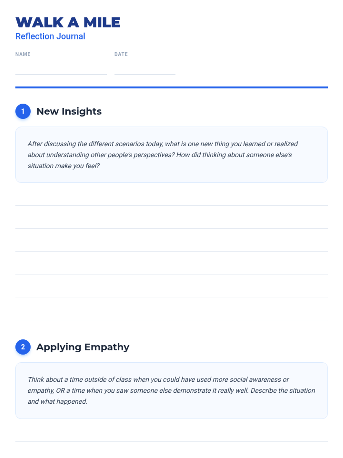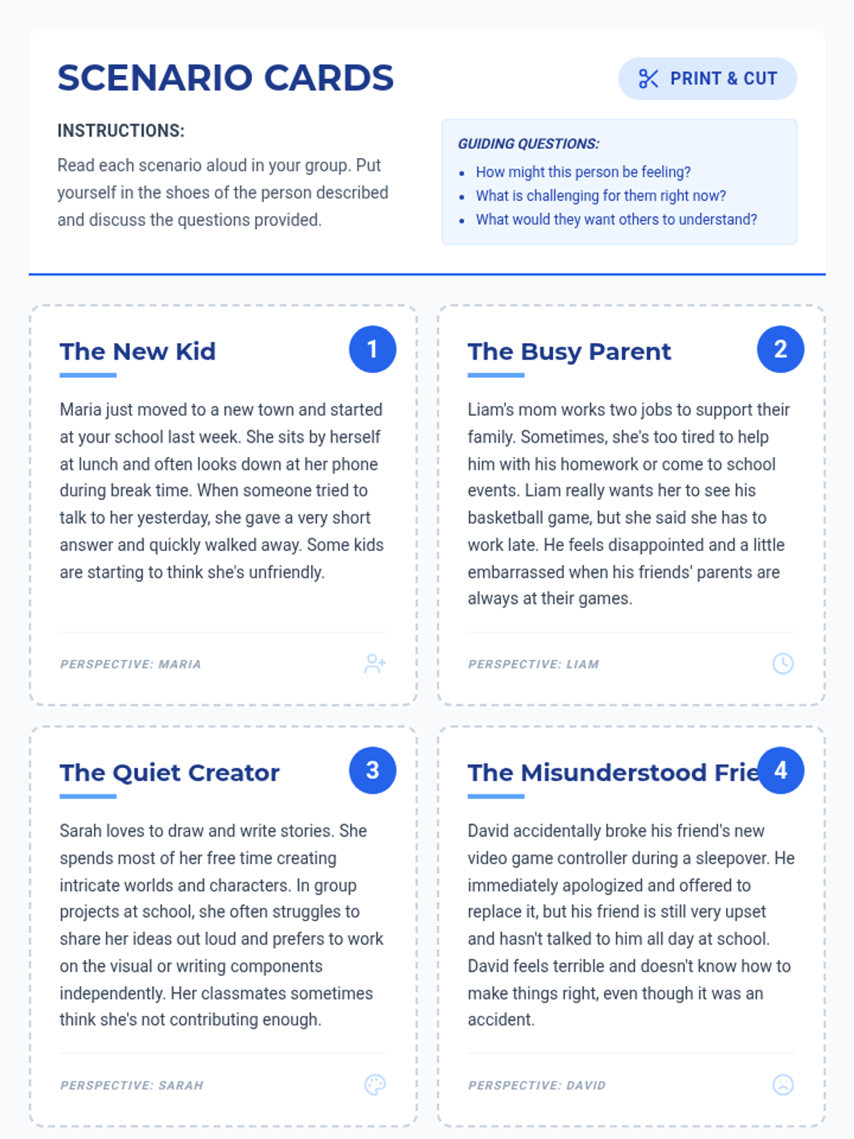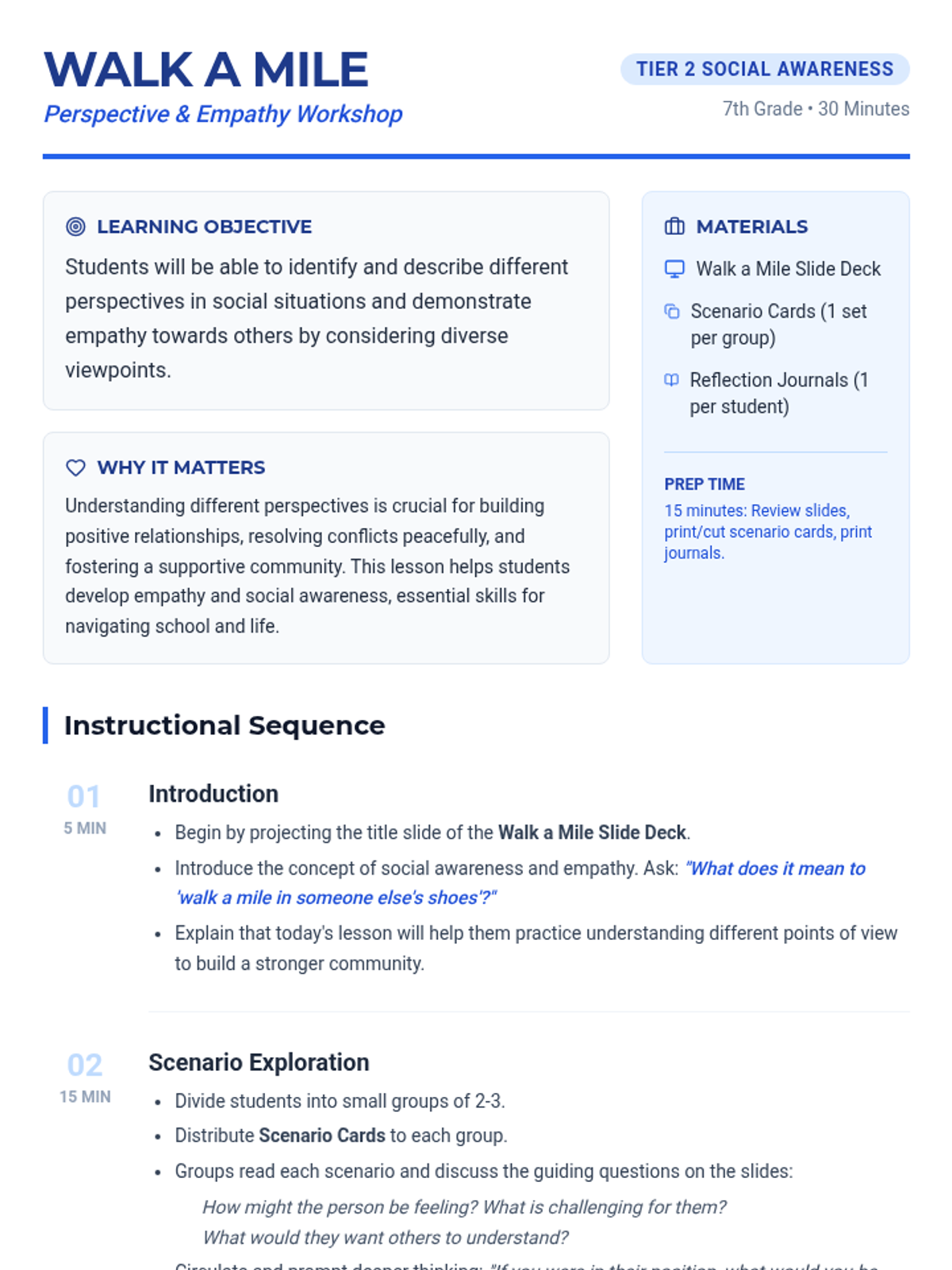 A 30-minute Tier 2 social-emotional learning lesson for 7th graders focused on developing empathy and social awareness through perspective-taking exercises. Students analyze various social scenarios to understand the challenges and feelings of others.