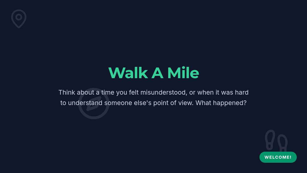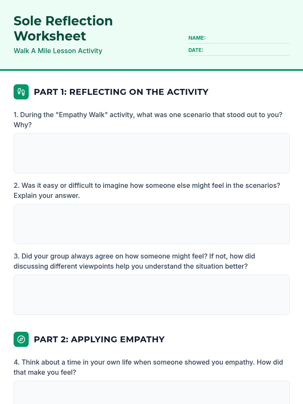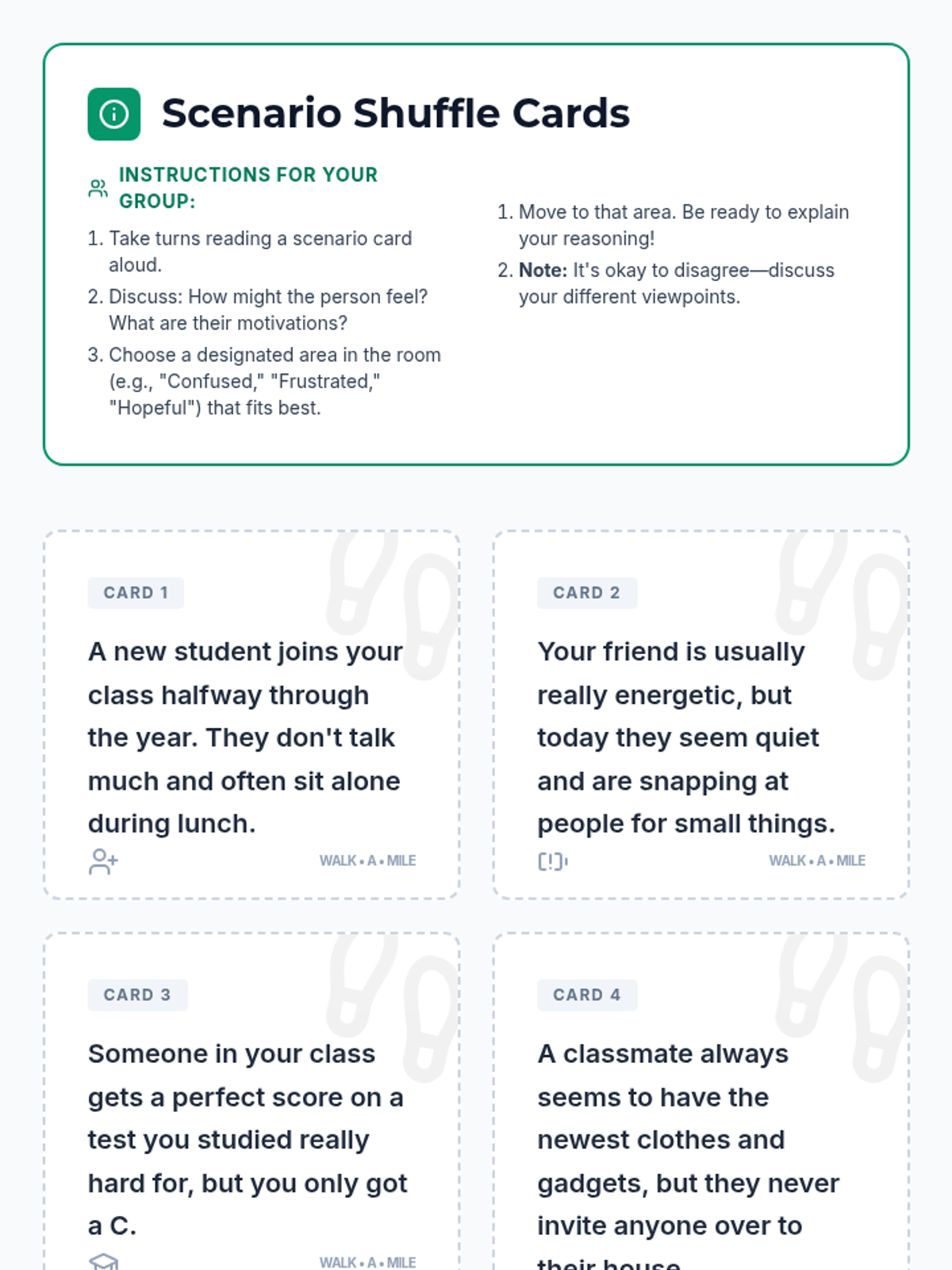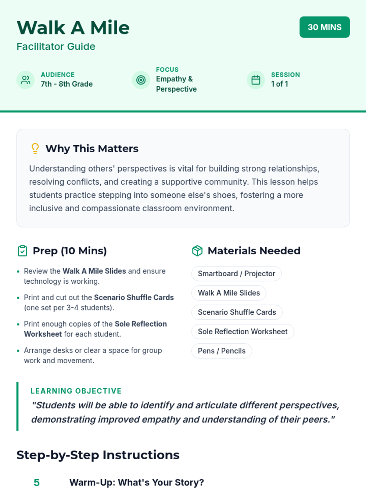 A 30-minute interactive lesson for 7th and 8th graders designed to build empathy and communication skills through a physical perspective-taking activity. Students will 'walk a mile' in others' shoes by discussing and moving through various social scenarios.