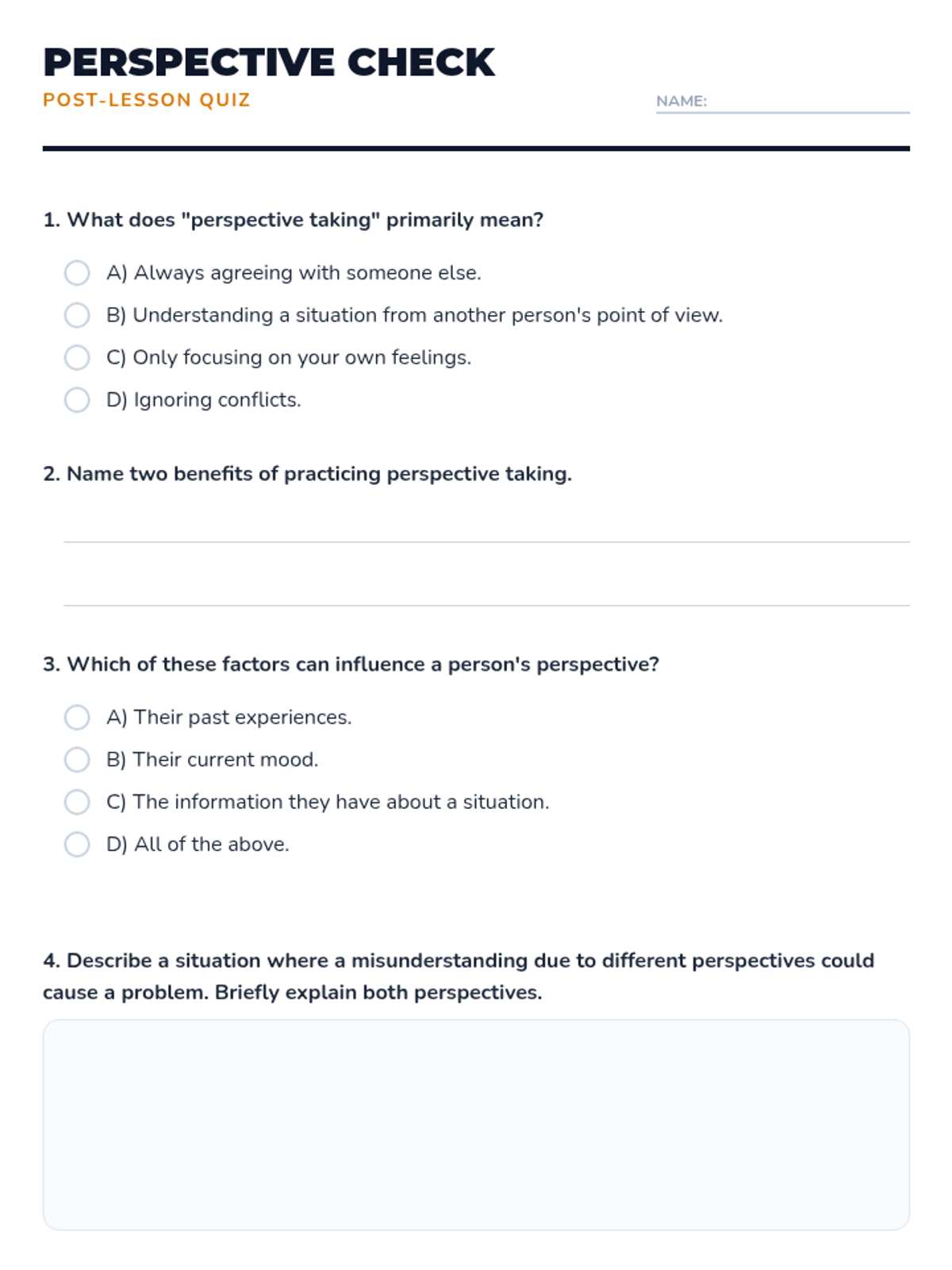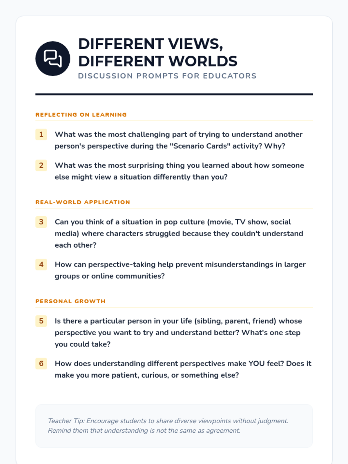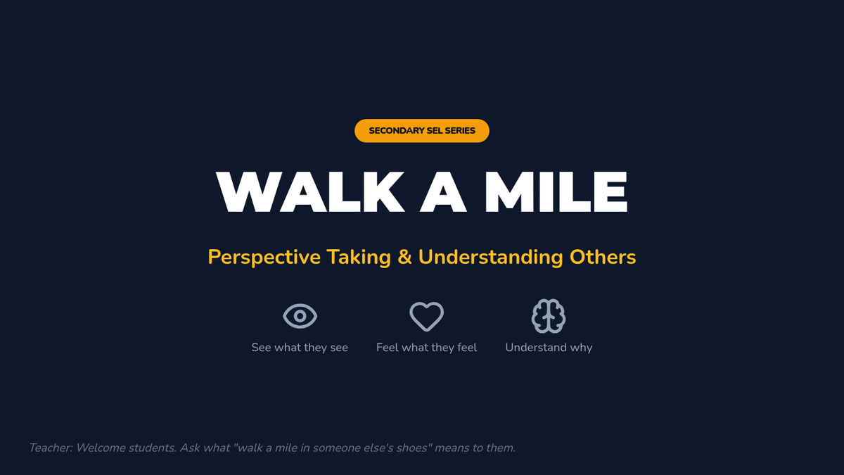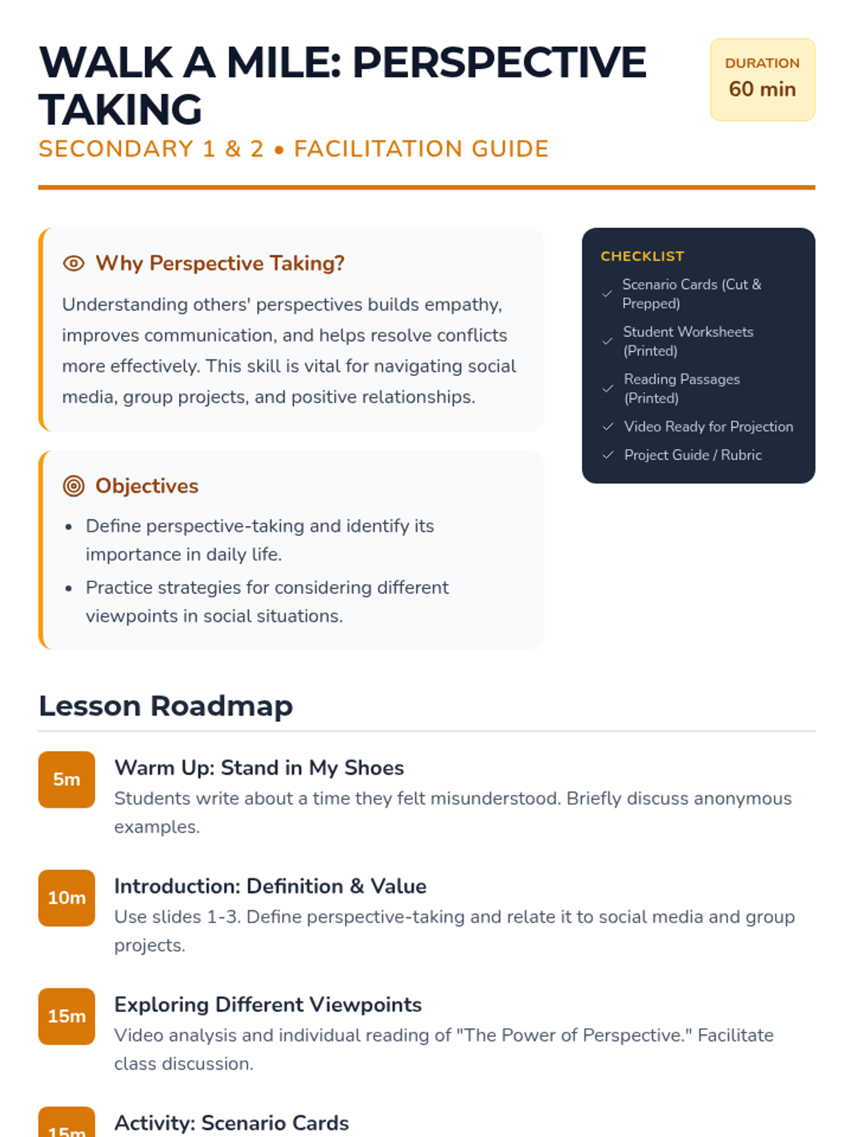 A perspective-taking lesson for secondary students focusing on defining empathy, recognizing different viewpoints, and analyzing social scenarios.