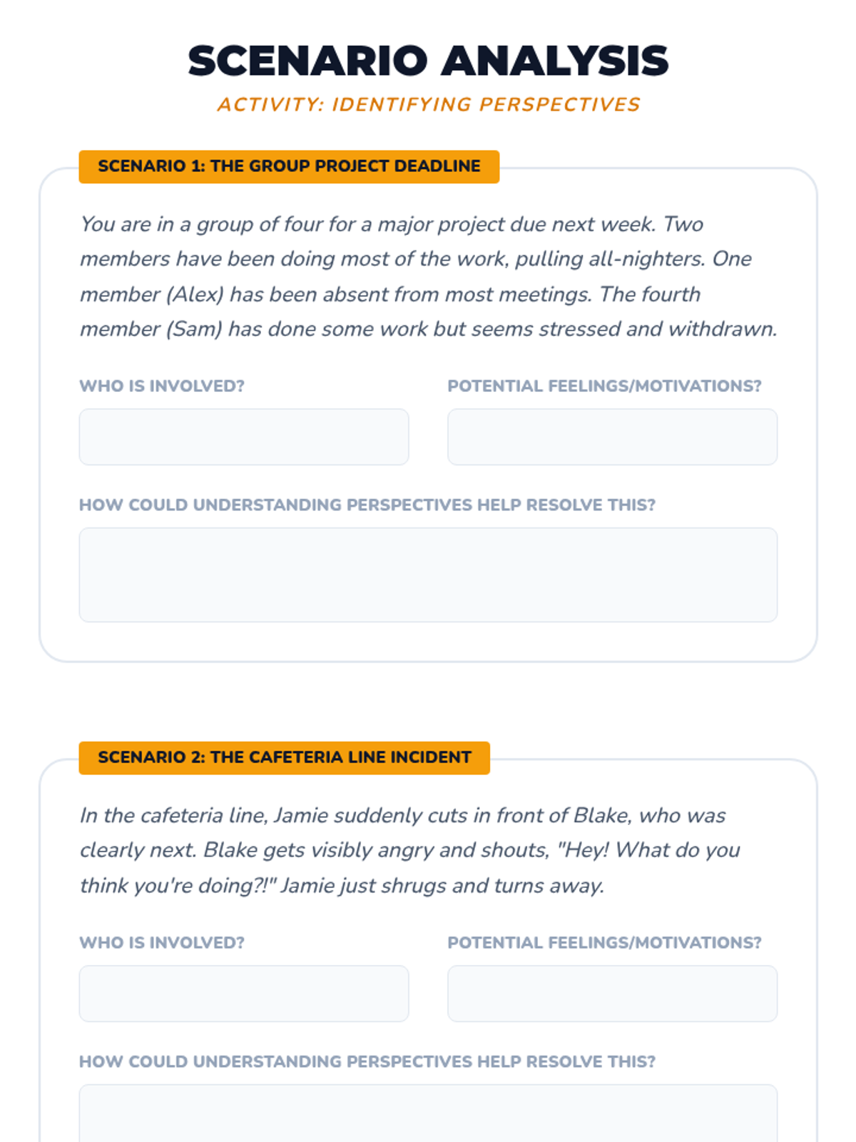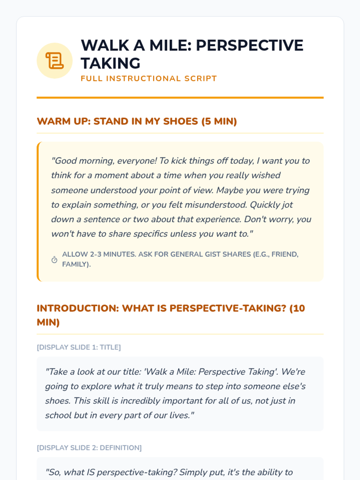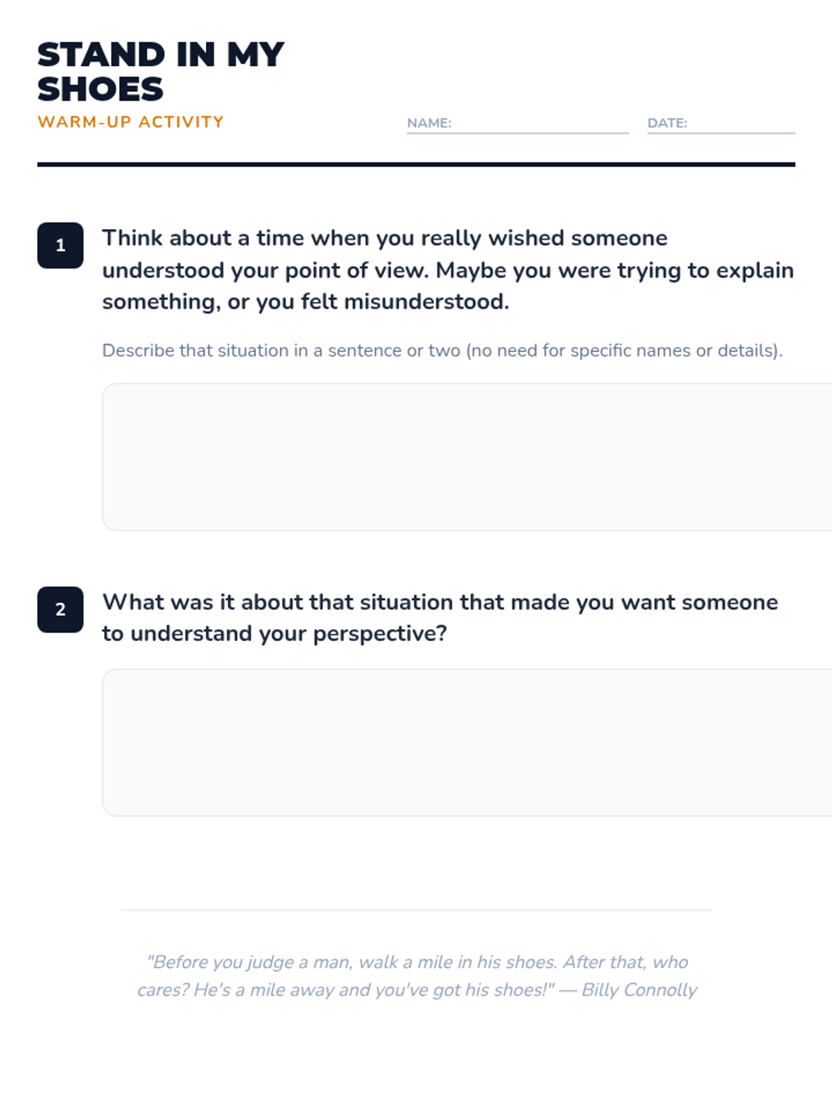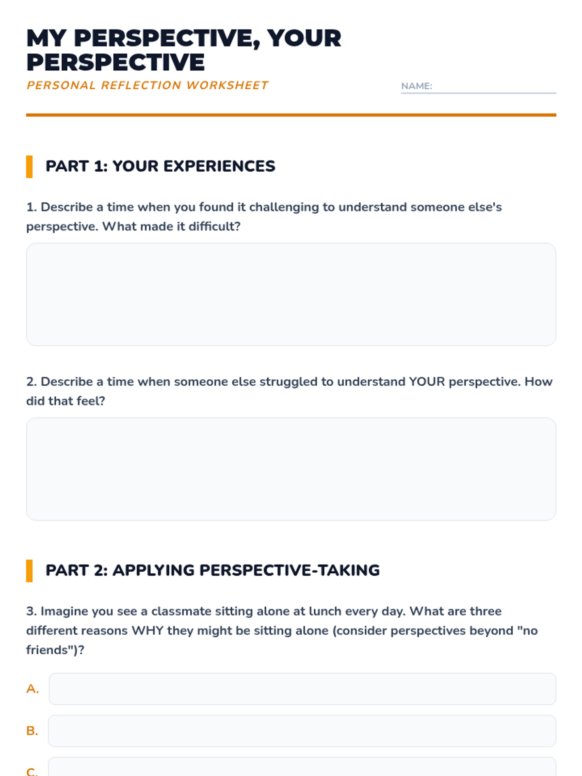 A perspective-taking lesson for secondary students focusing on defining empathy, recognizing different viewpoints, and analyzing social scenarios.