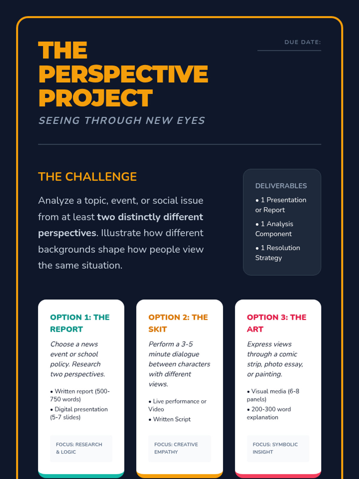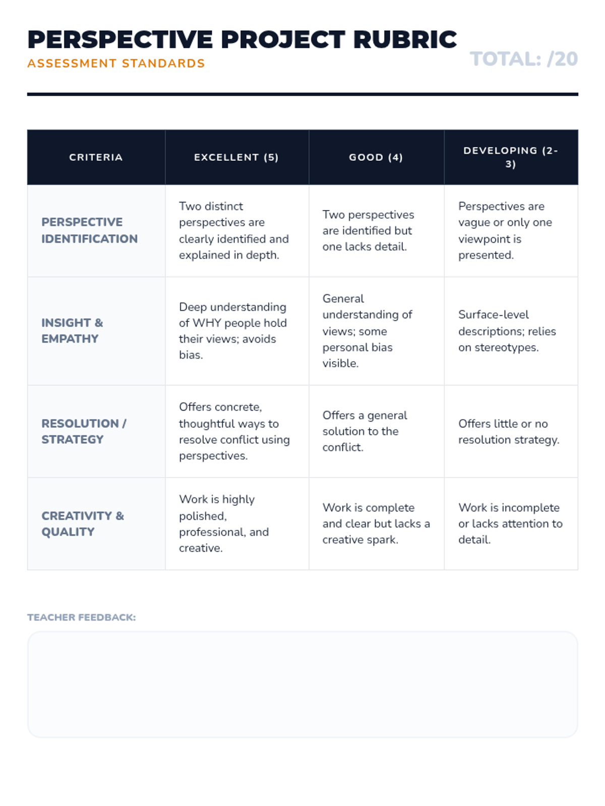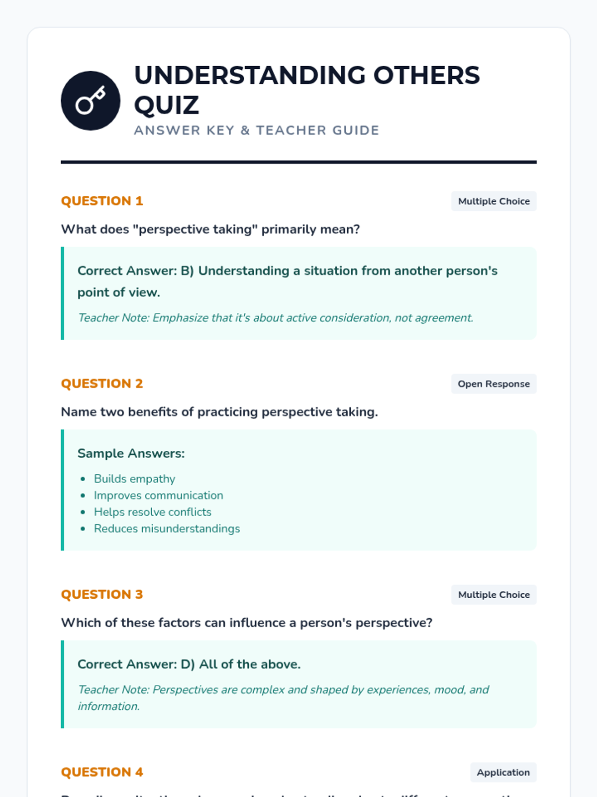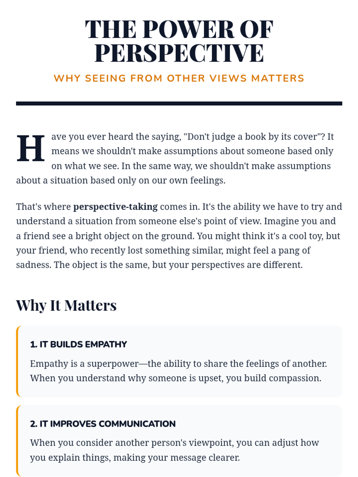 A perspective-taking lesson for secondary students focusing on defining empathy, recognizing different viewpoints, and analyzing social scenarios.