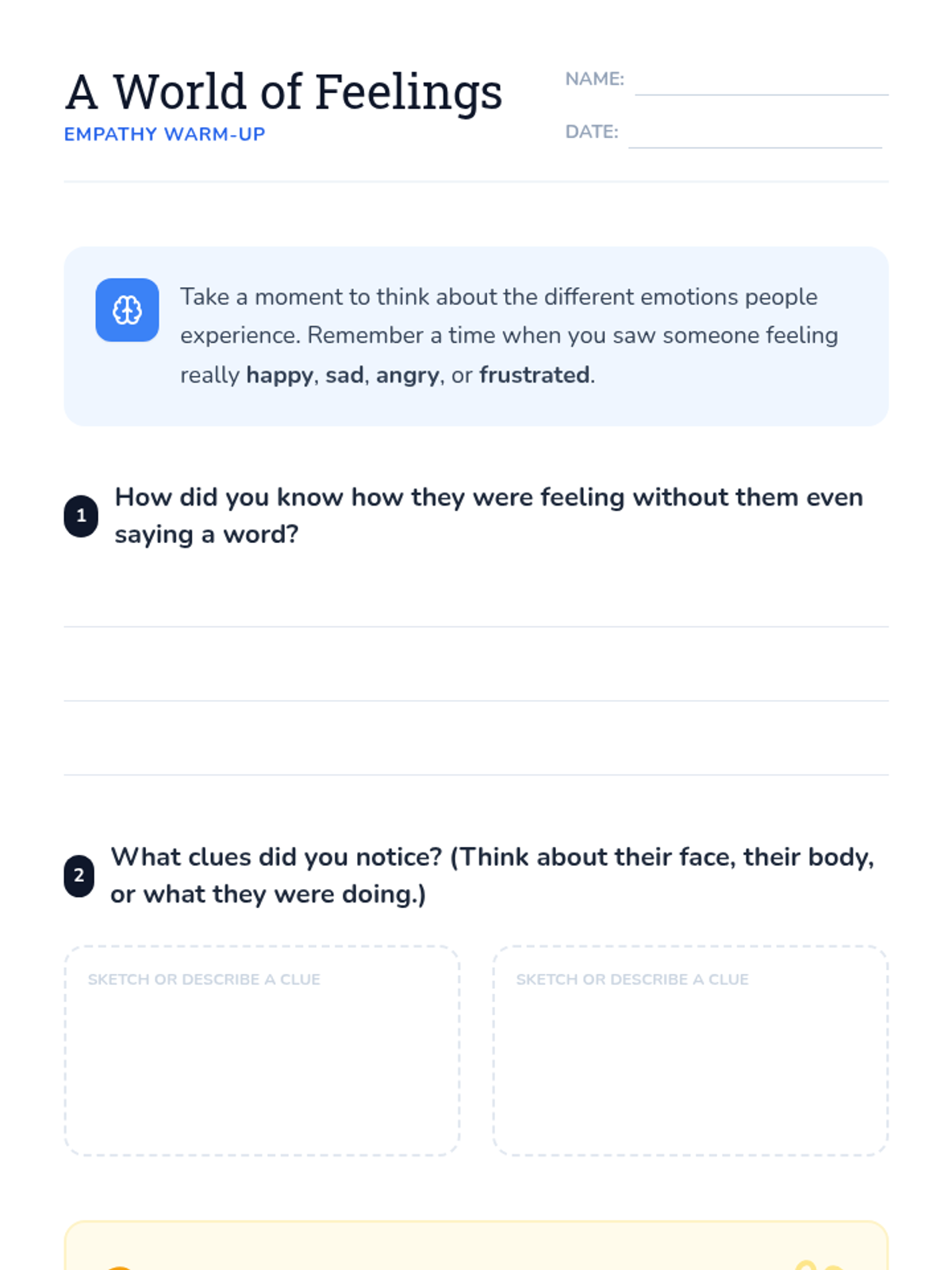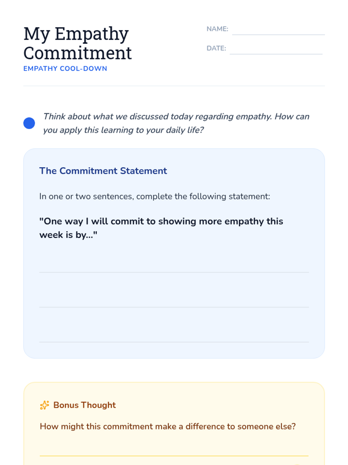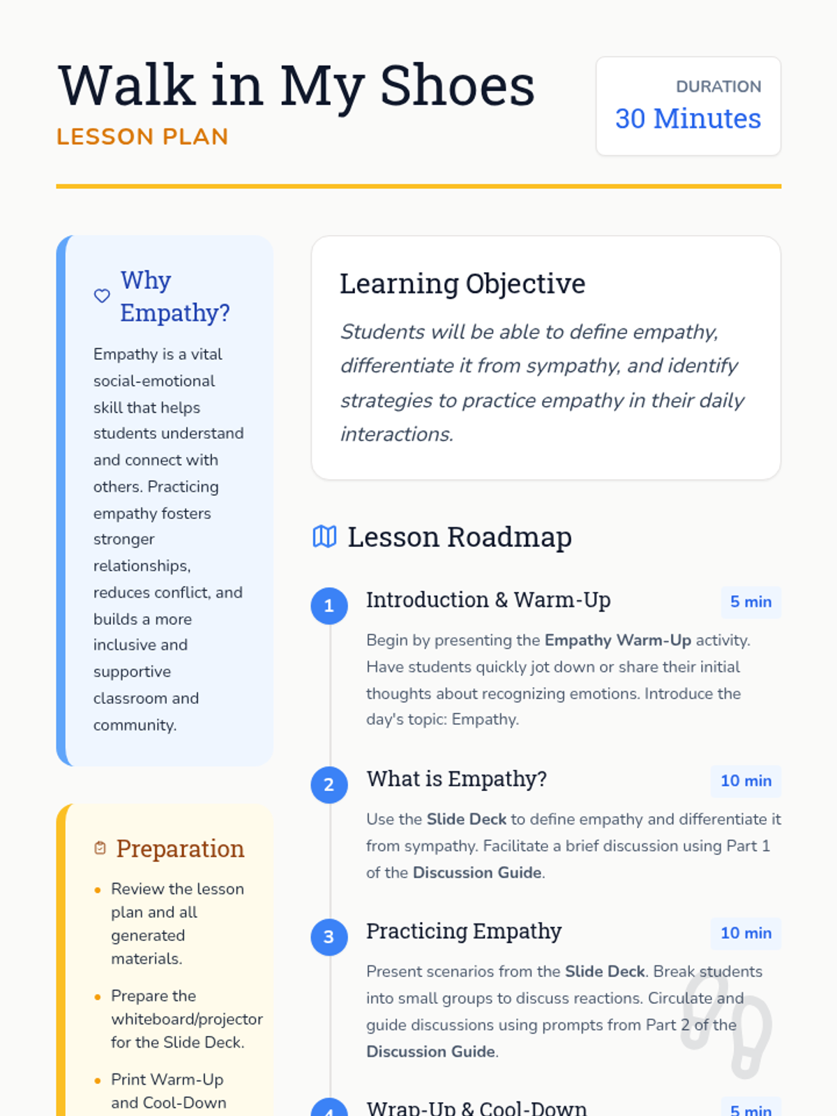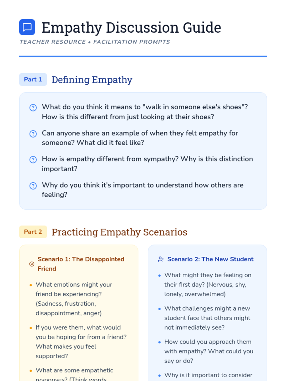 A 30-minute lesson for 7th-grade students that introduces the concept of empathy, differentiates it from sympathy, and provides practical strategies for building compassionate relationships through scenario analysis and reflection.