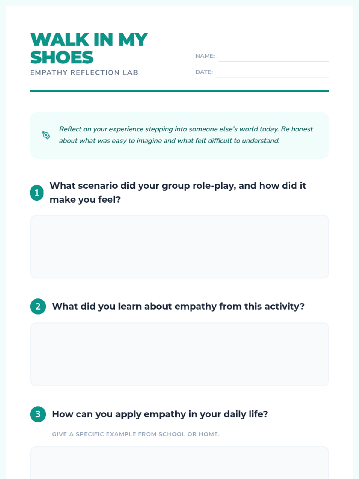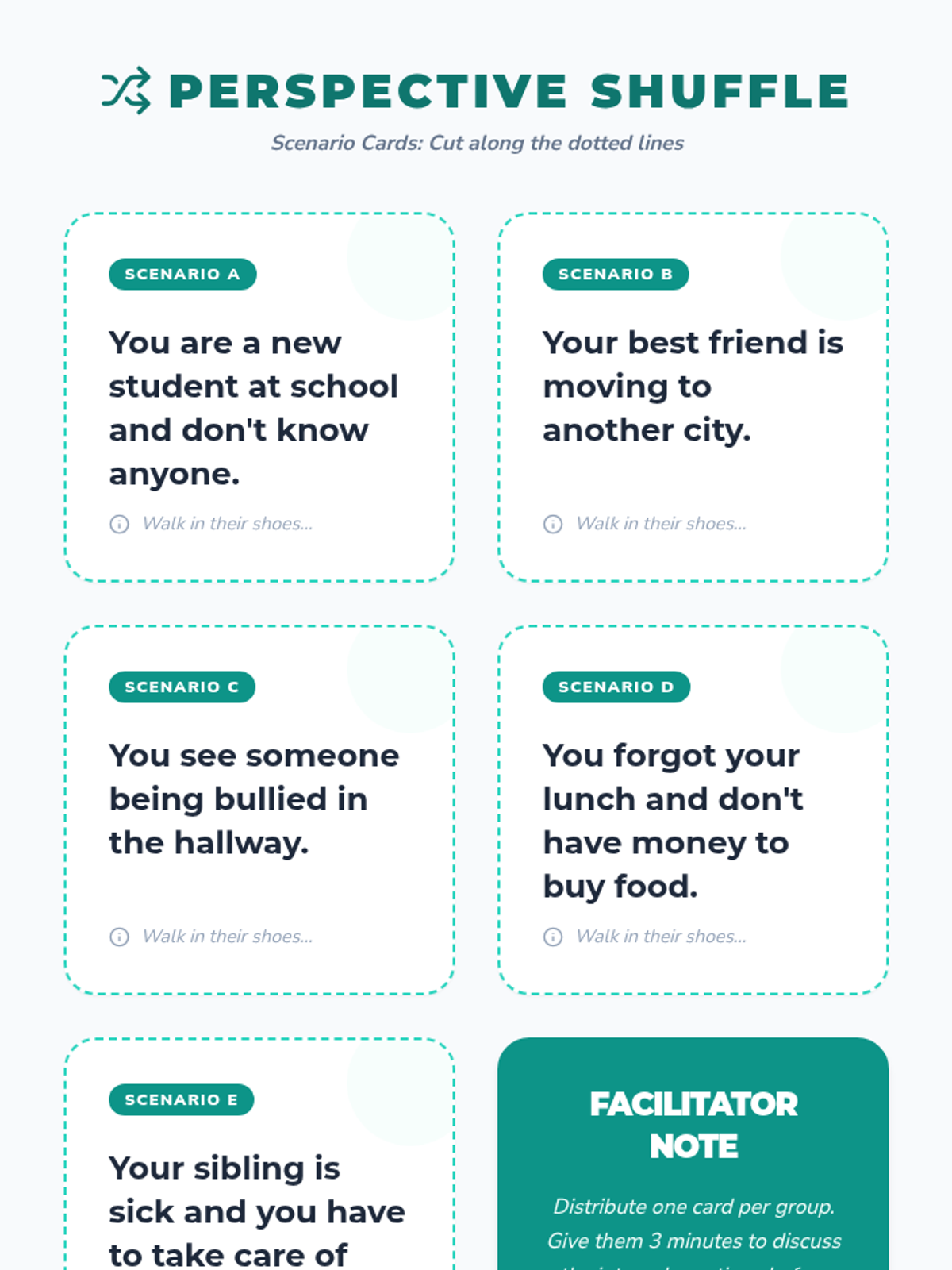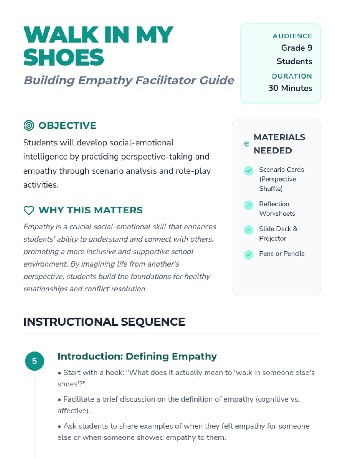 A 30-minute interactive lesson for 9th graders focusing on empathy through role-play and perspective-taking. Students explore various social scenarios to build emotional intelligence and inclusive school culture.