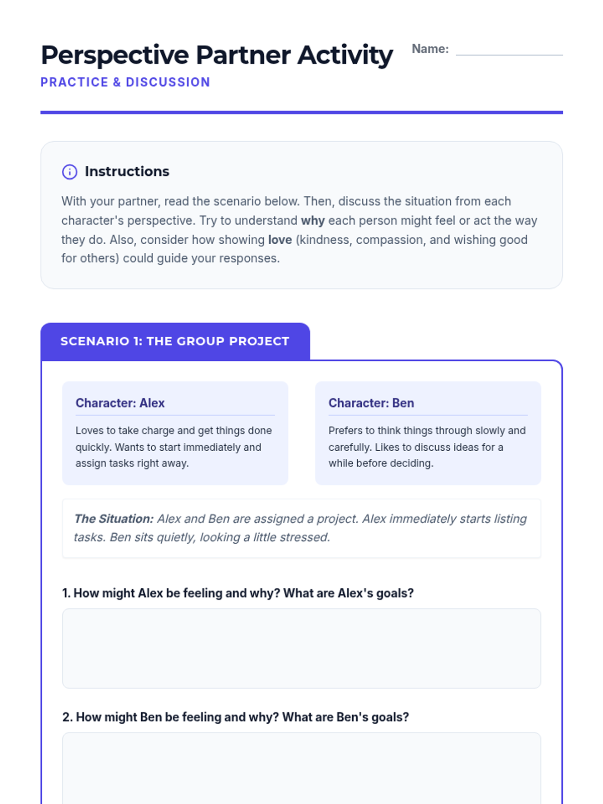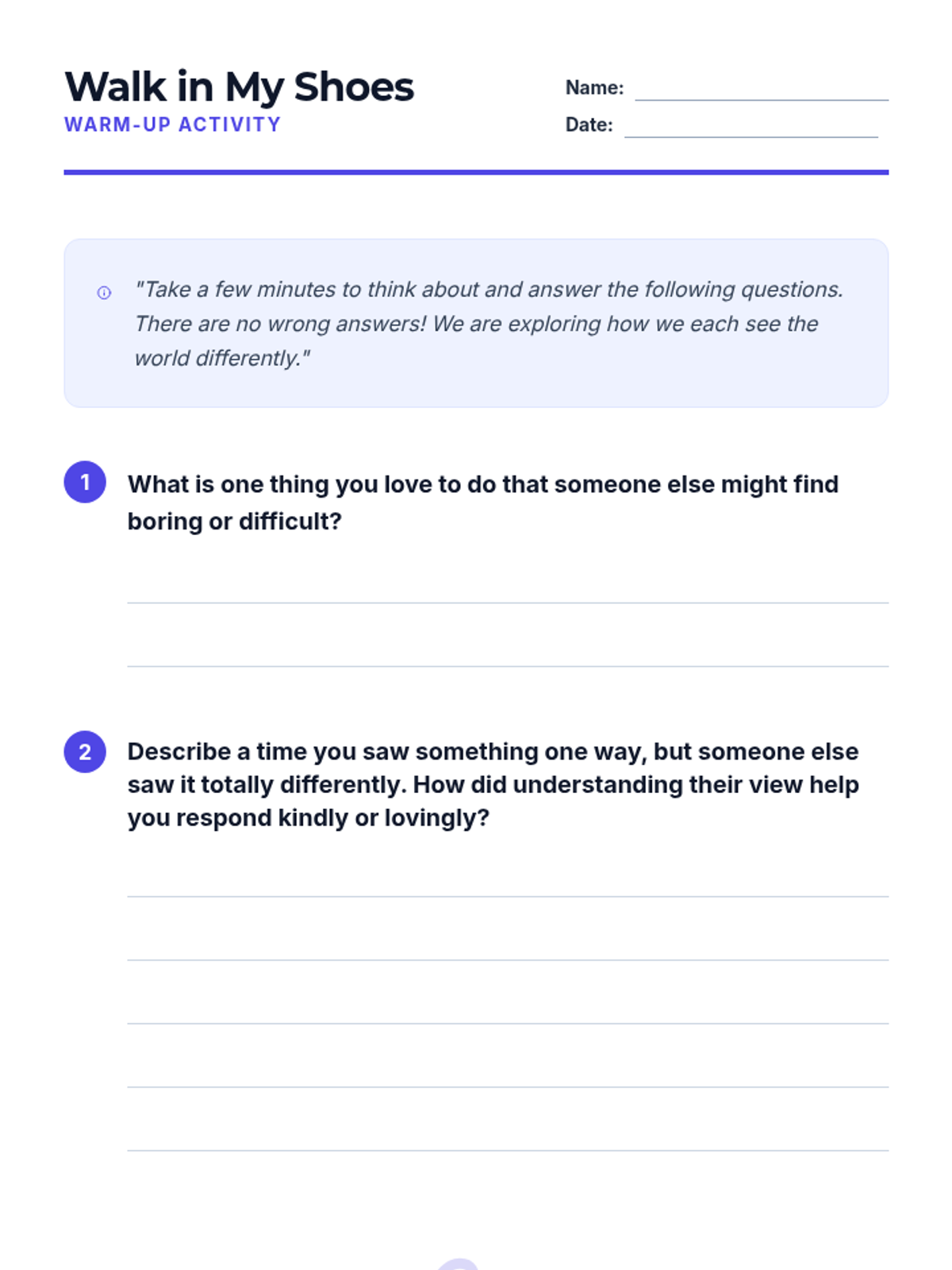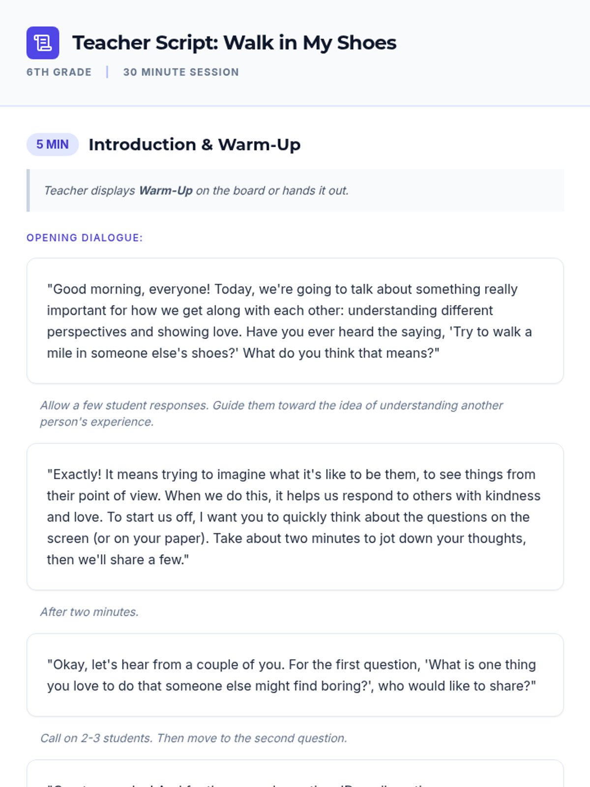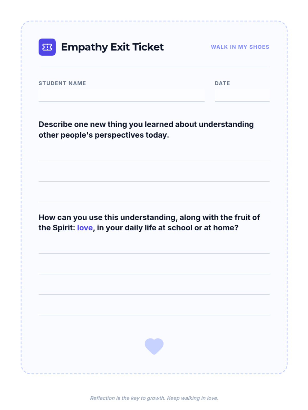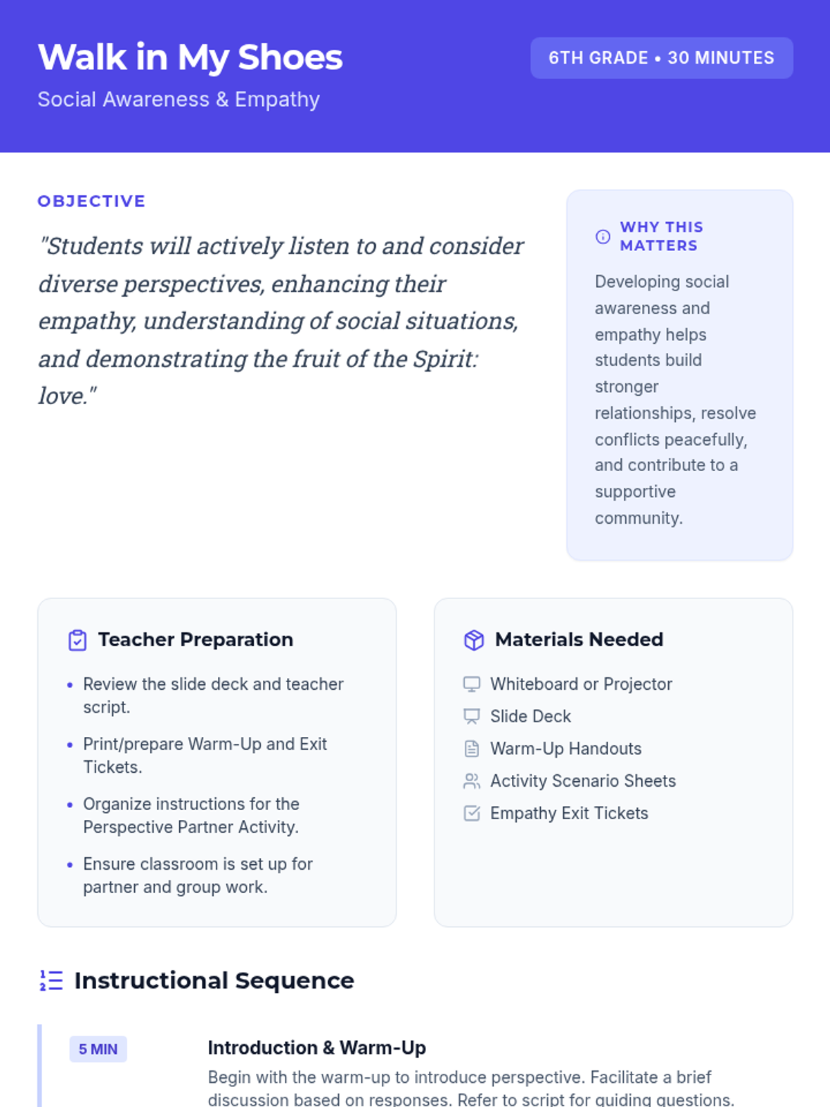 A 30-minute lesson for 6th-grade students focusing on social awareness and empathy through the lens of perspective-taking and the fruit of the Spirit: love. Students practice seeing situations from multiple viewpoints to build a more inclusive classroom community.